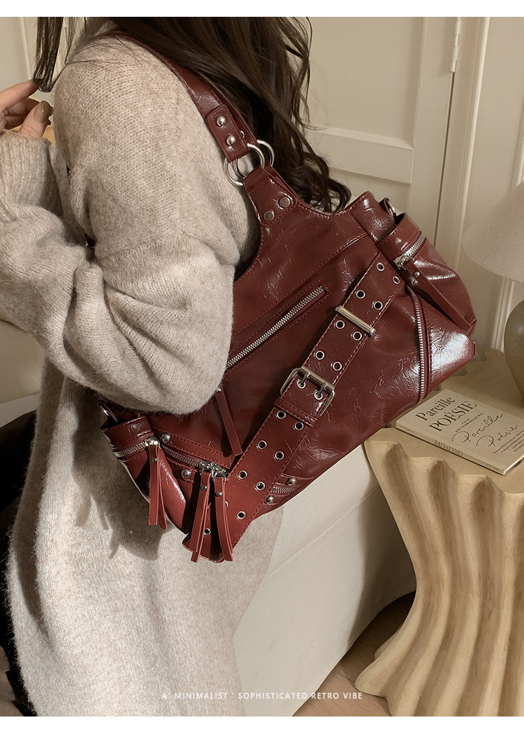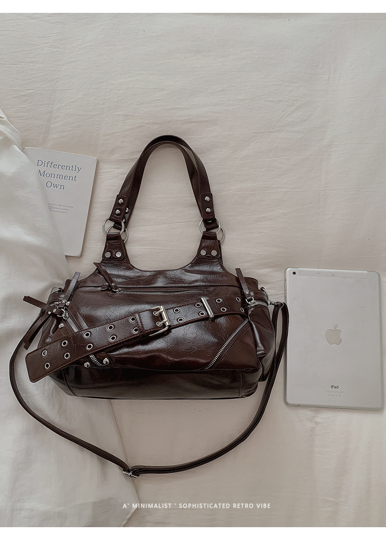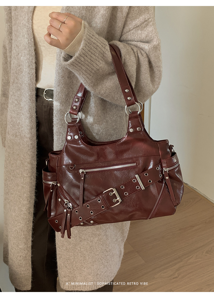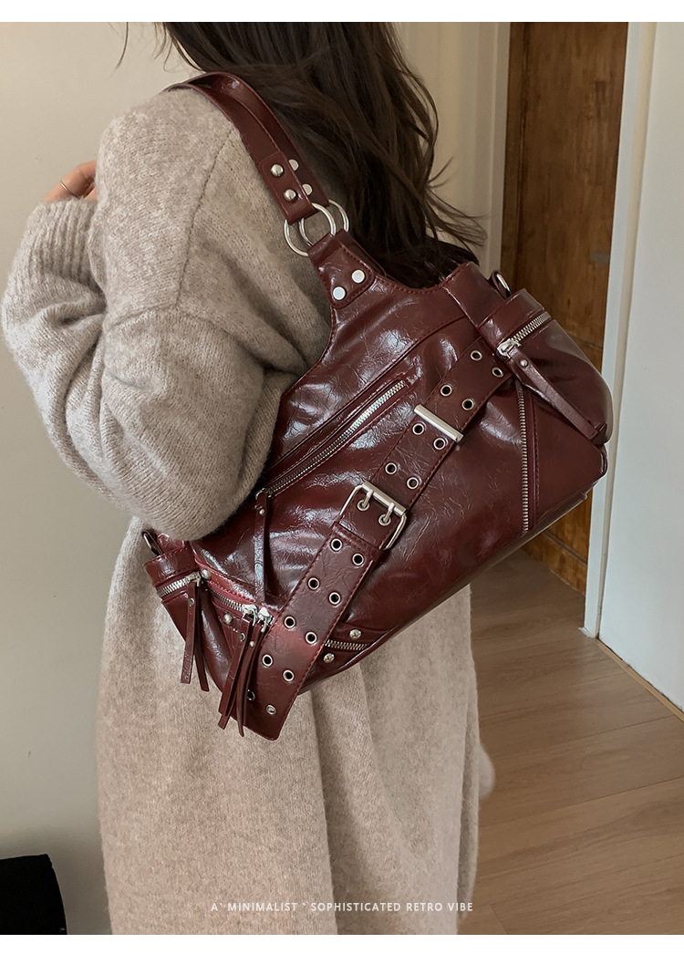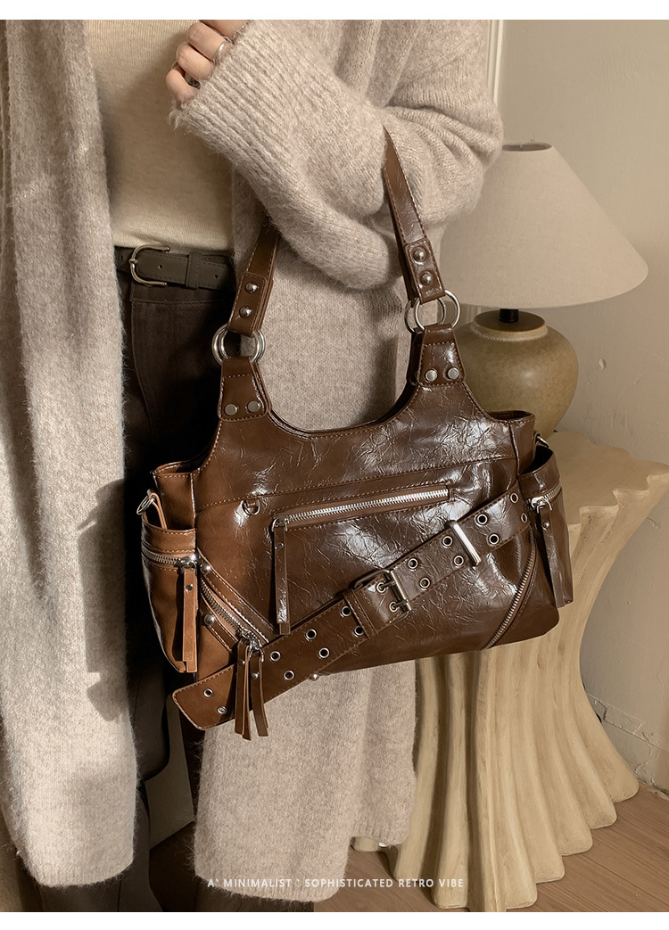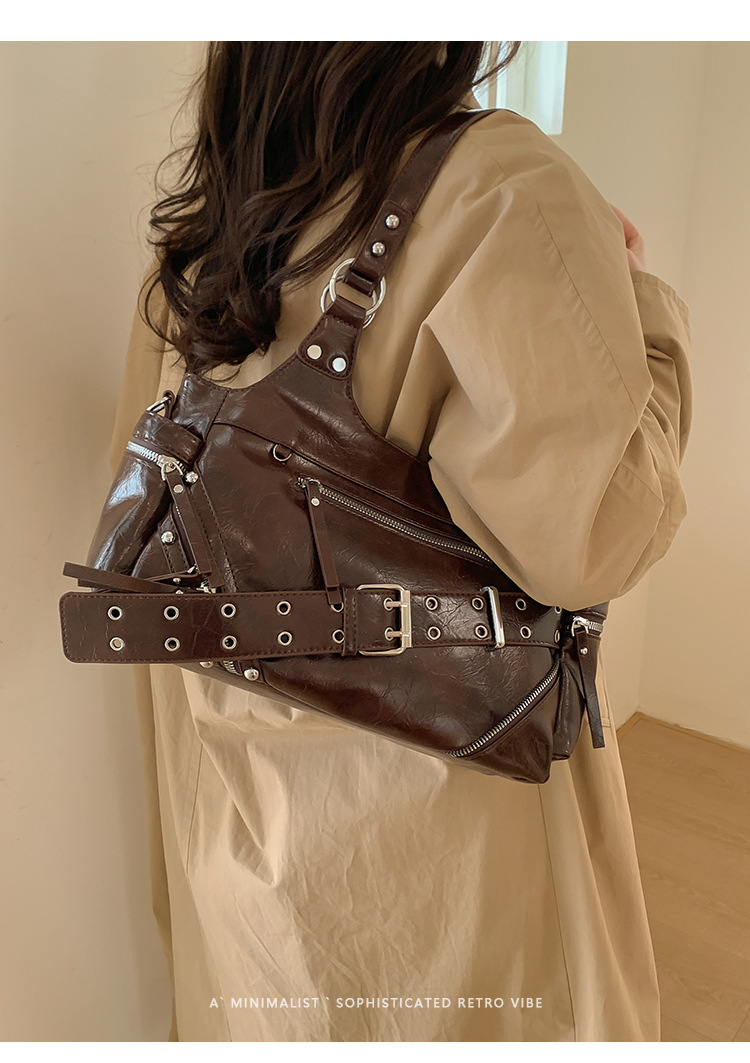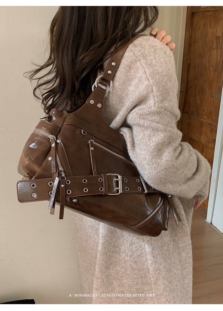 Bolsa de motocicleta de chicas calientes transfronterizas para mujeres 2025 nuevo retro cuero de cera de aceite de hombro bolso de brazo bolso de mano casual