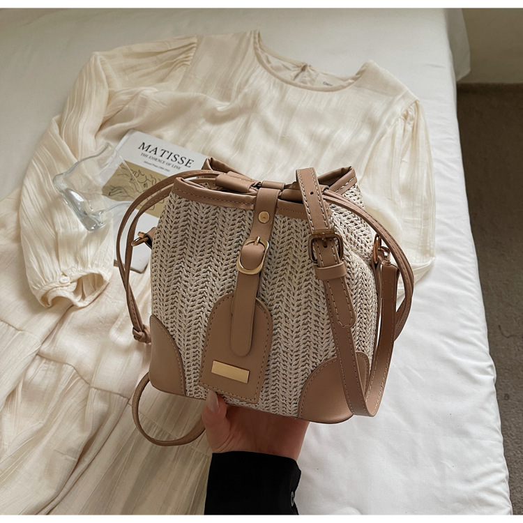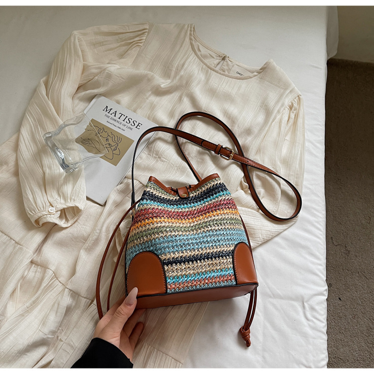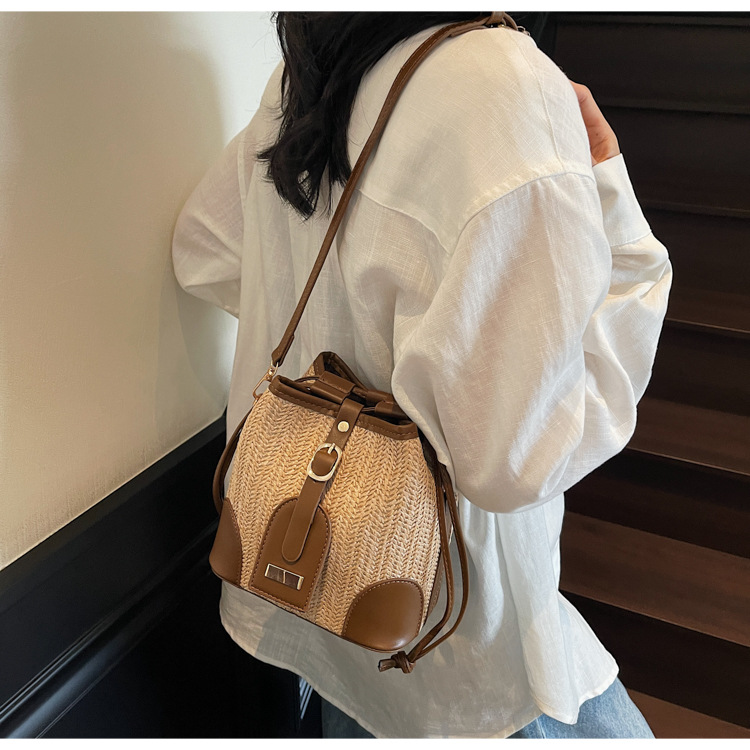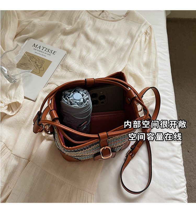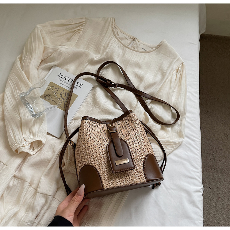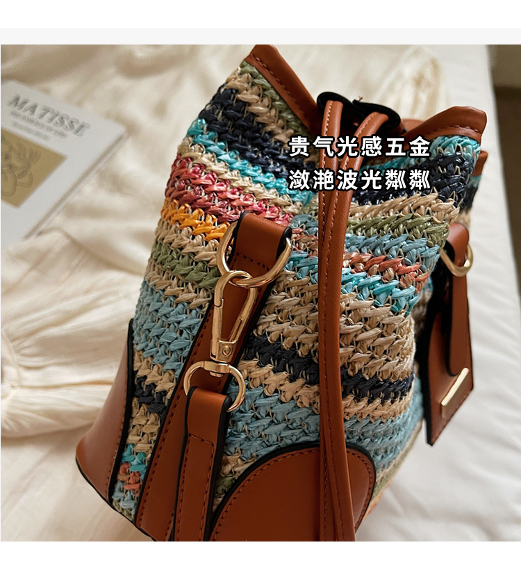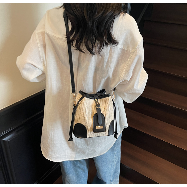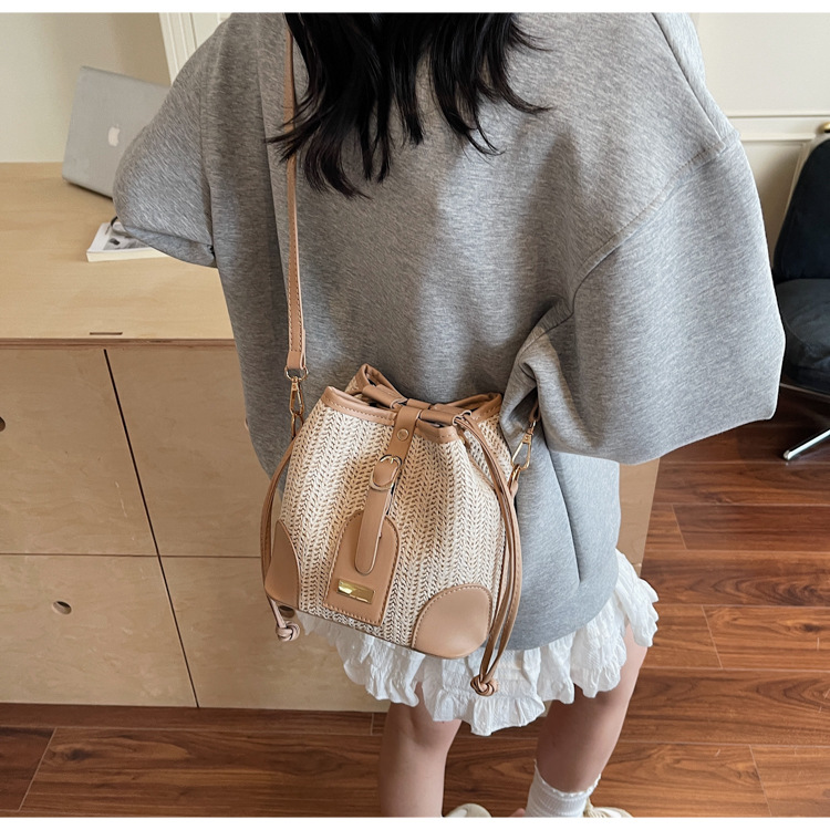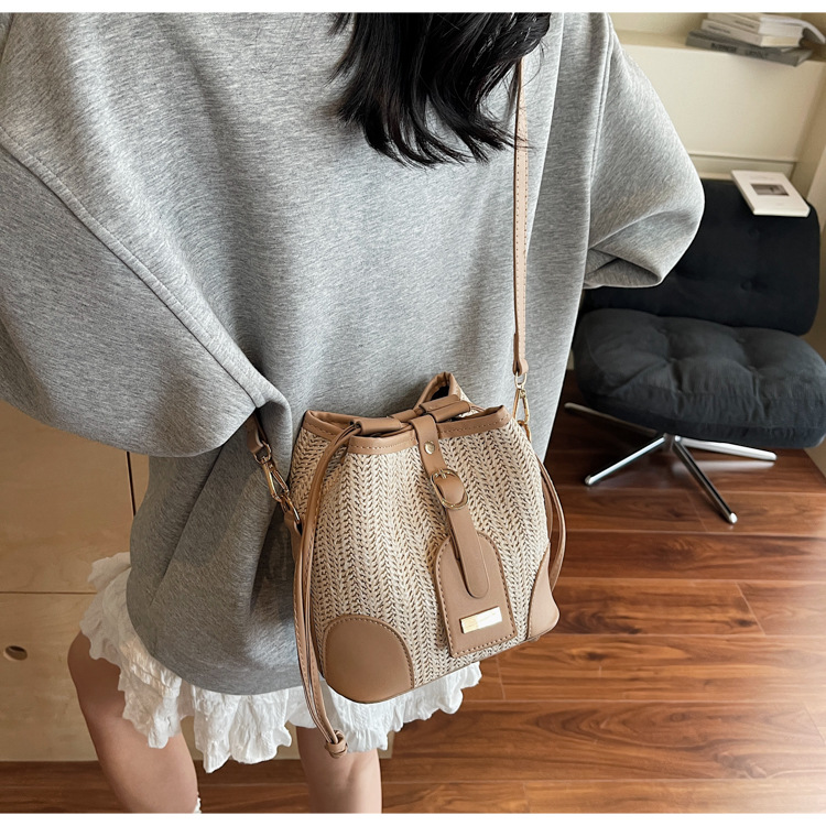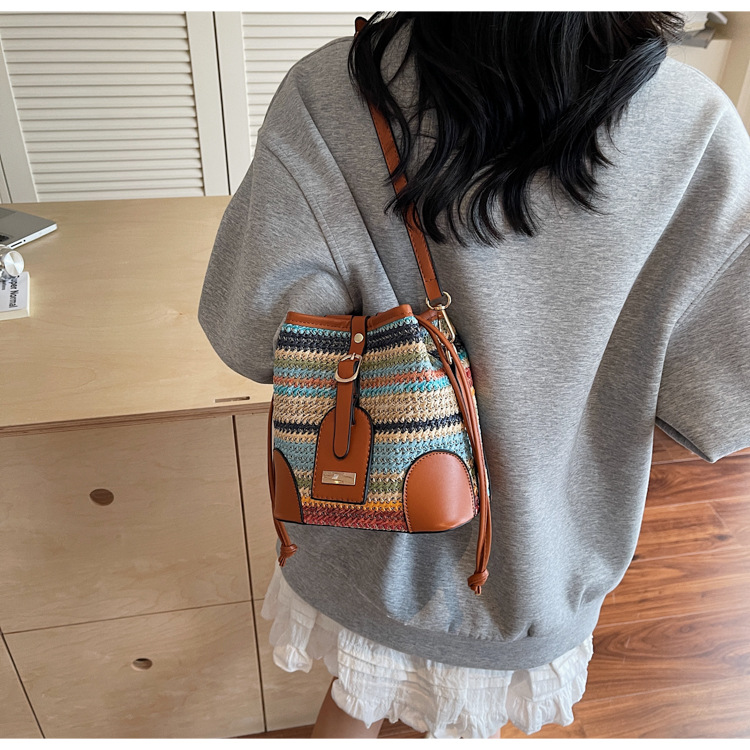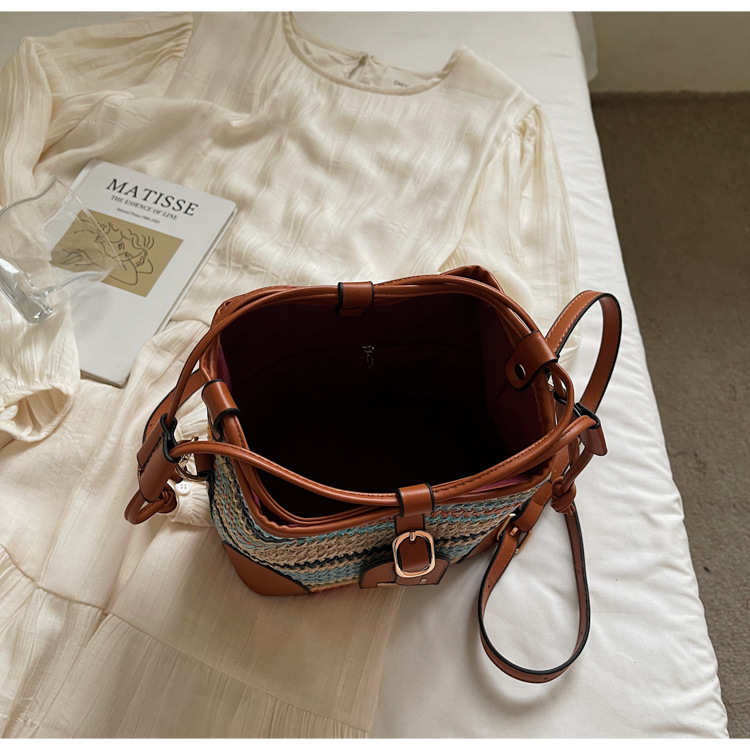 Bolso tejido femenino 2025 verano nuevo estilo juego junto al mar bolso de cubo de viaje tendencia bolsa de paja de mensajero de todo fósforo de nicho
