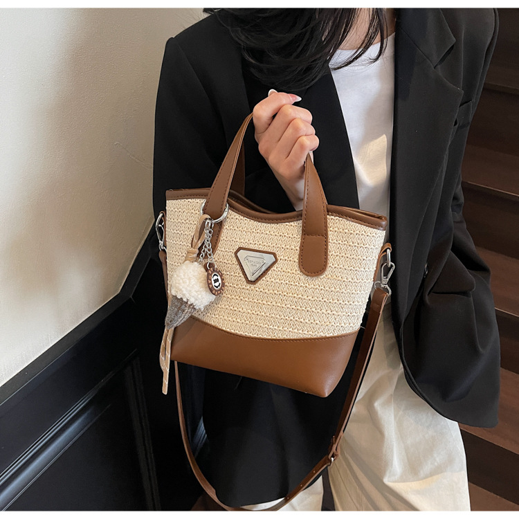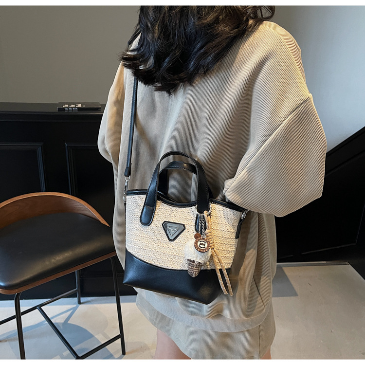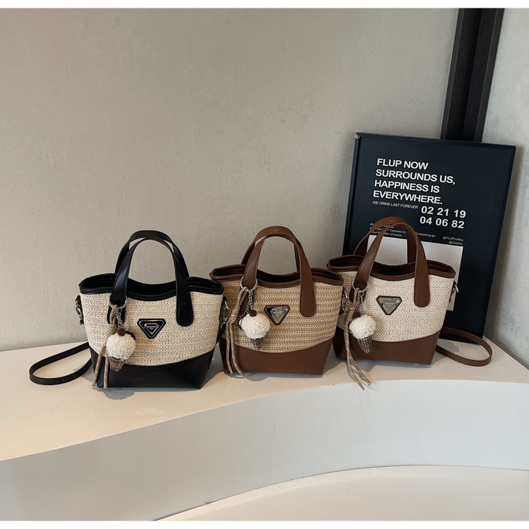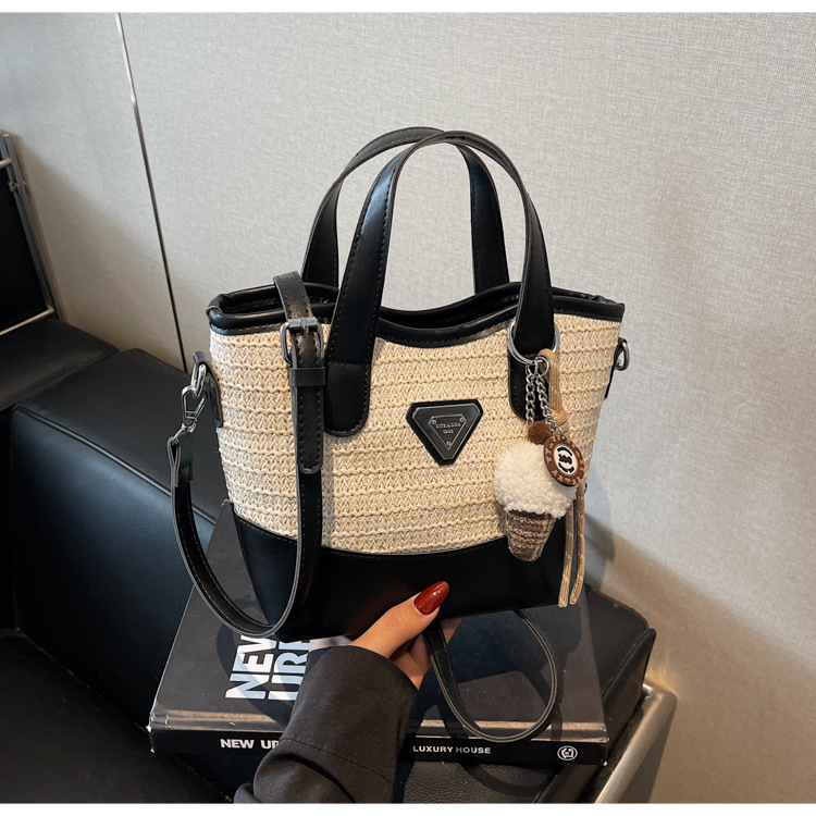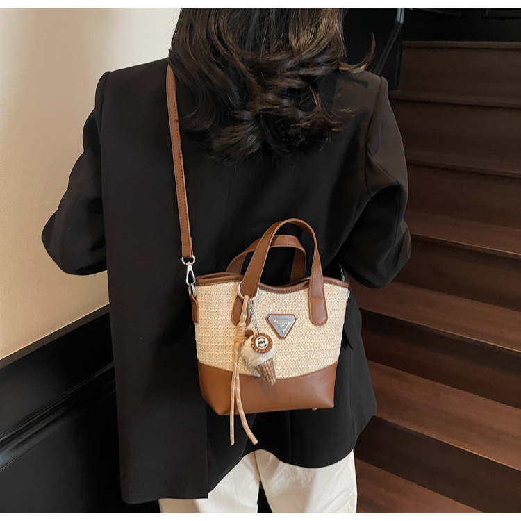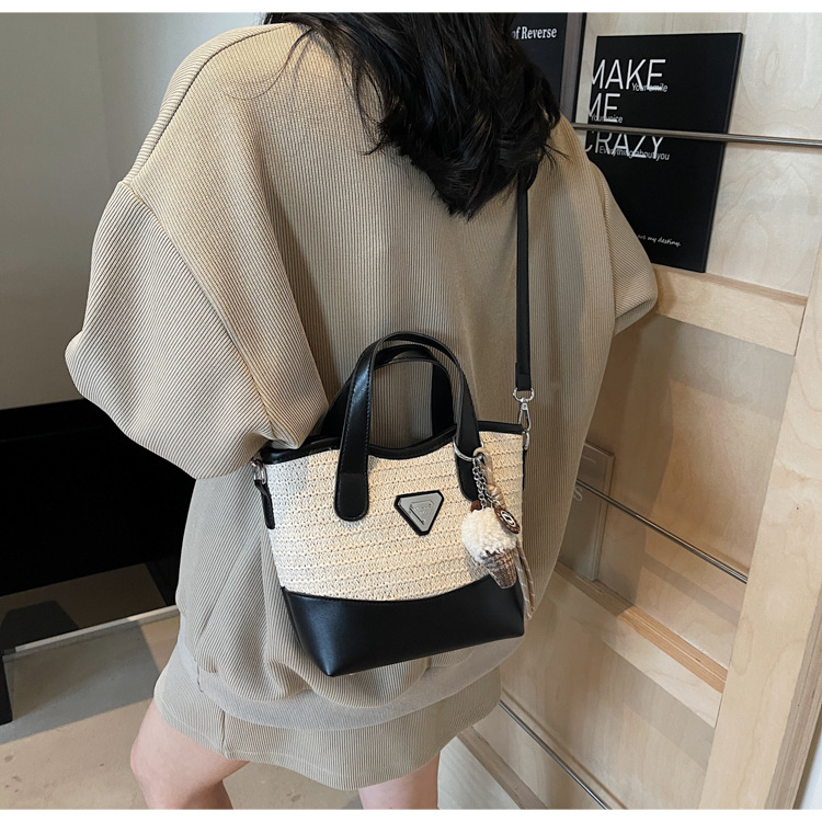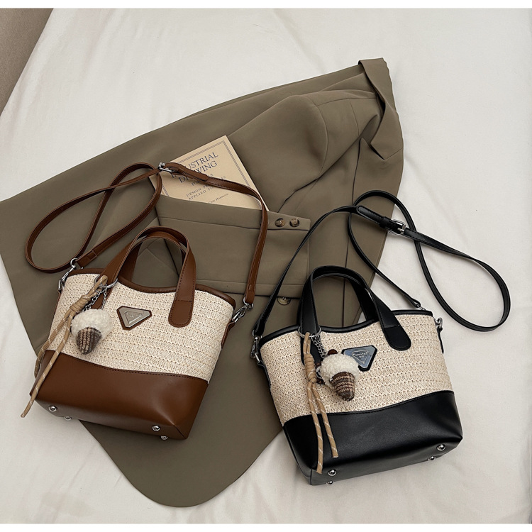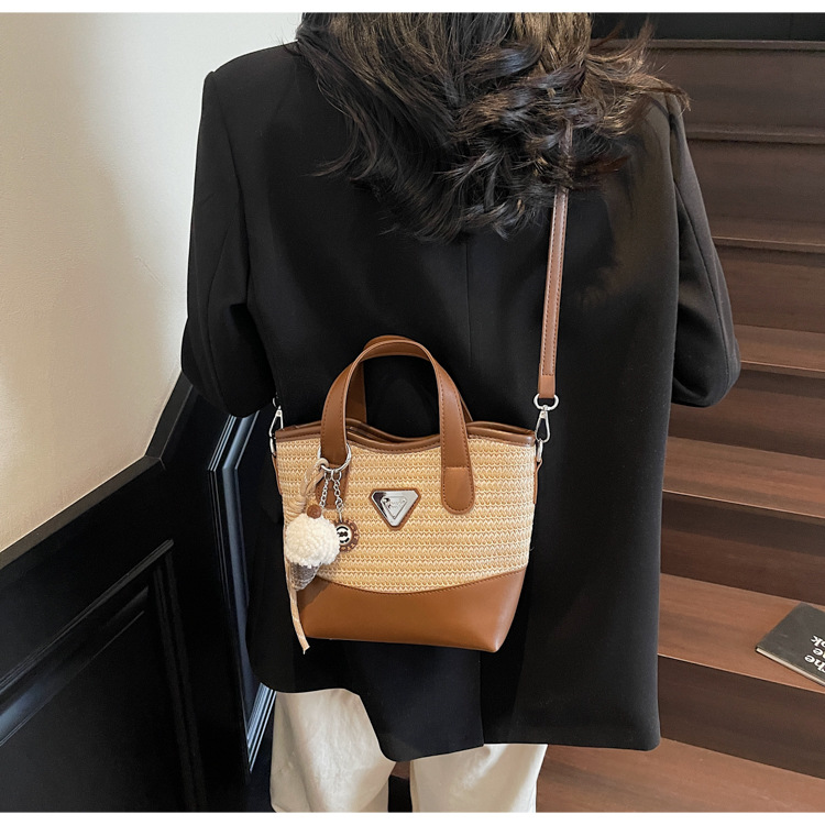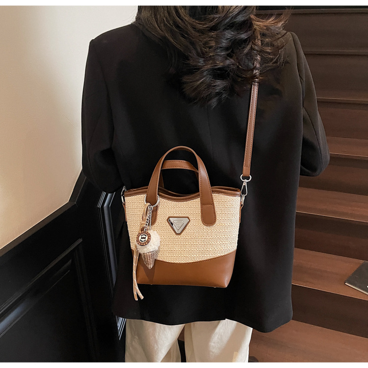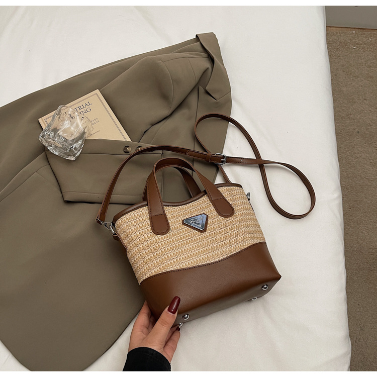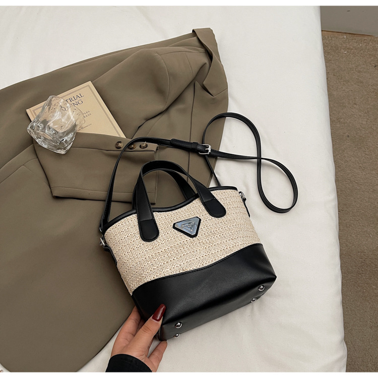 Bolso de mano de color de contraste tejido de estilo caliente de verano para mujer 2025 nuevo bolso de cubo simple salvaje estilo occidental para mujer