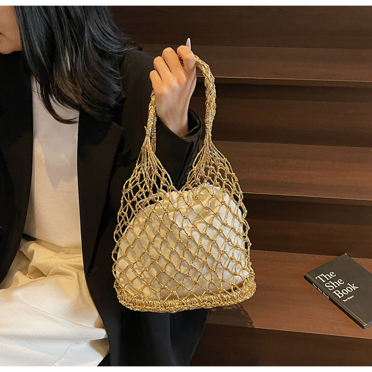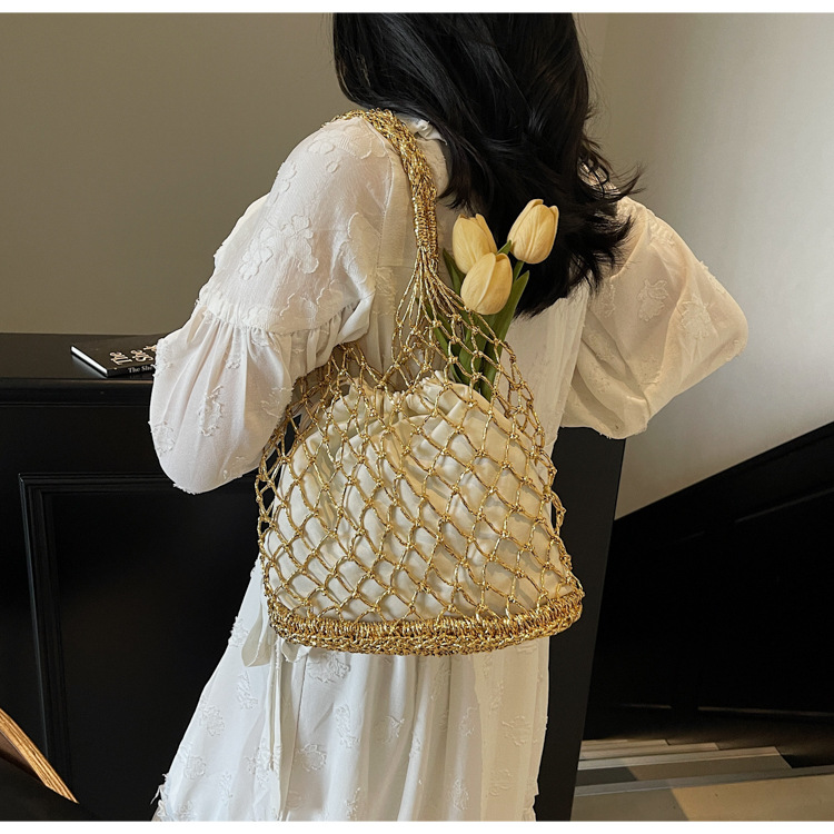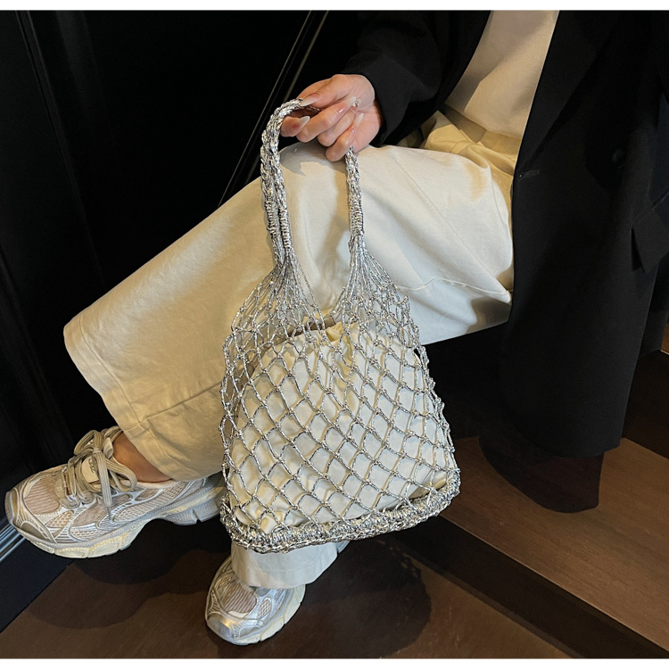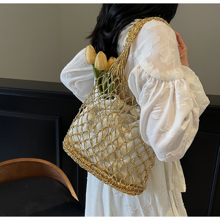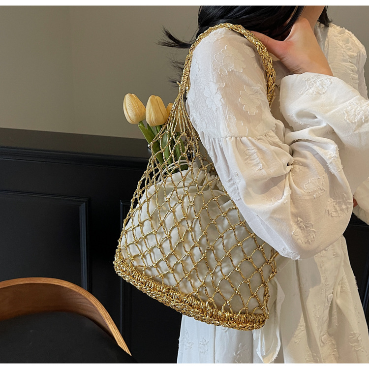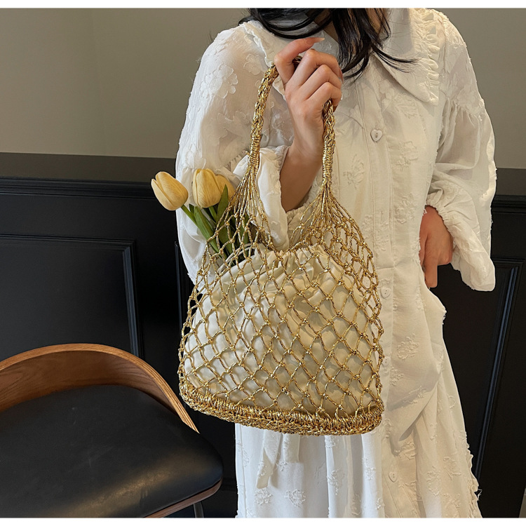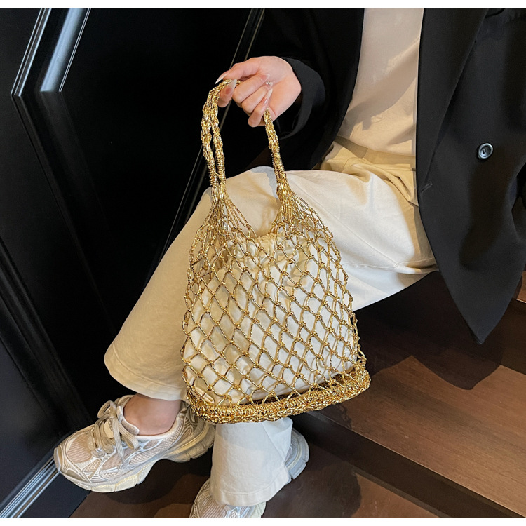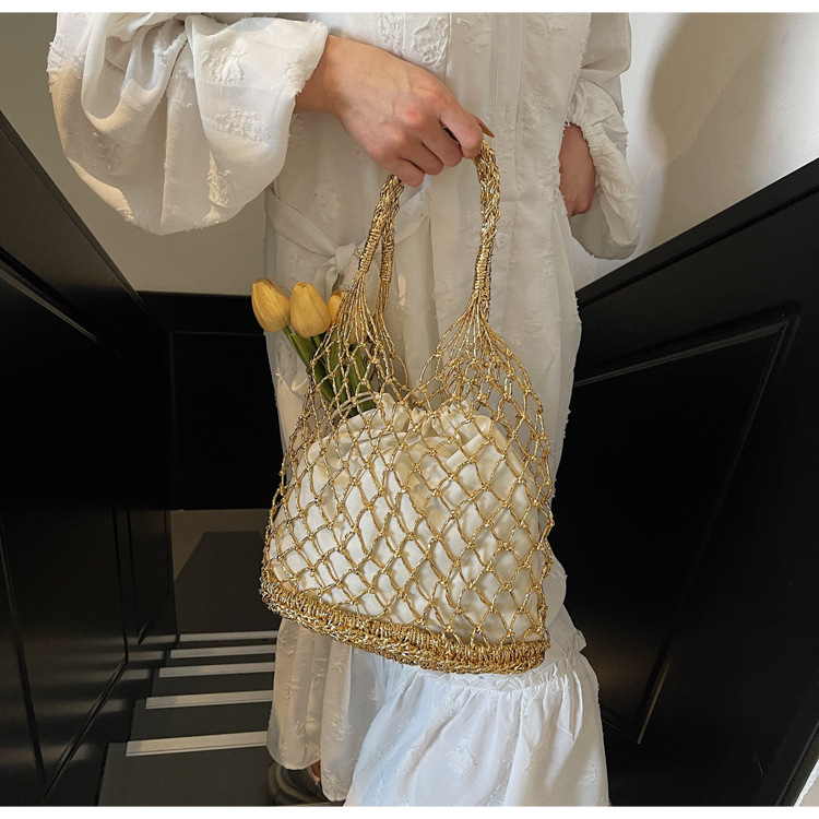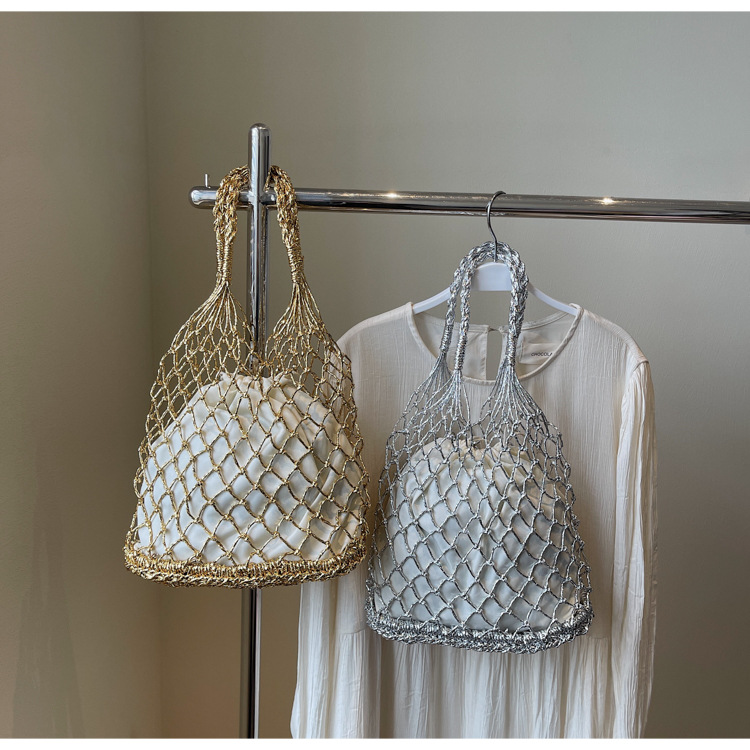 Ins nuevo bolso tejido a mano de hilo dorado y plateado de color sólido, bolso femenino de mano de moda de moda, bolso de playa portátil Mori