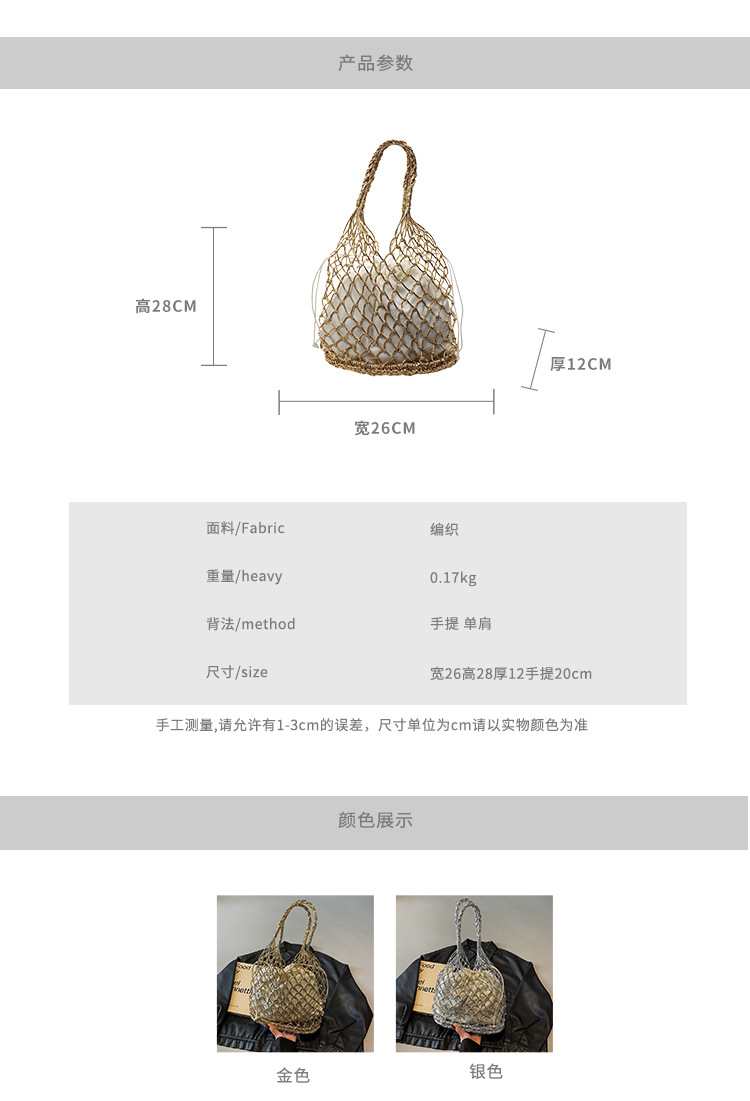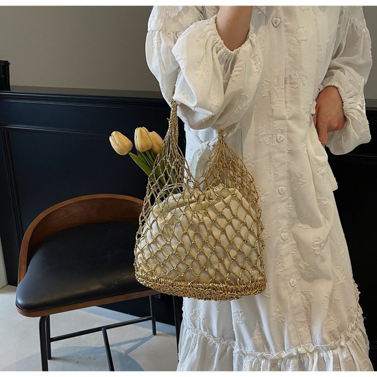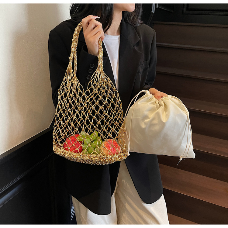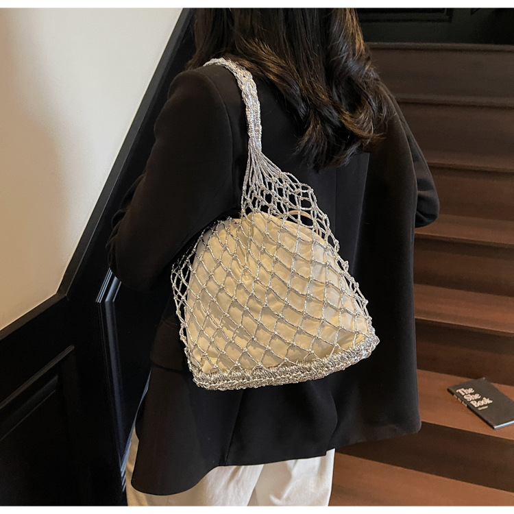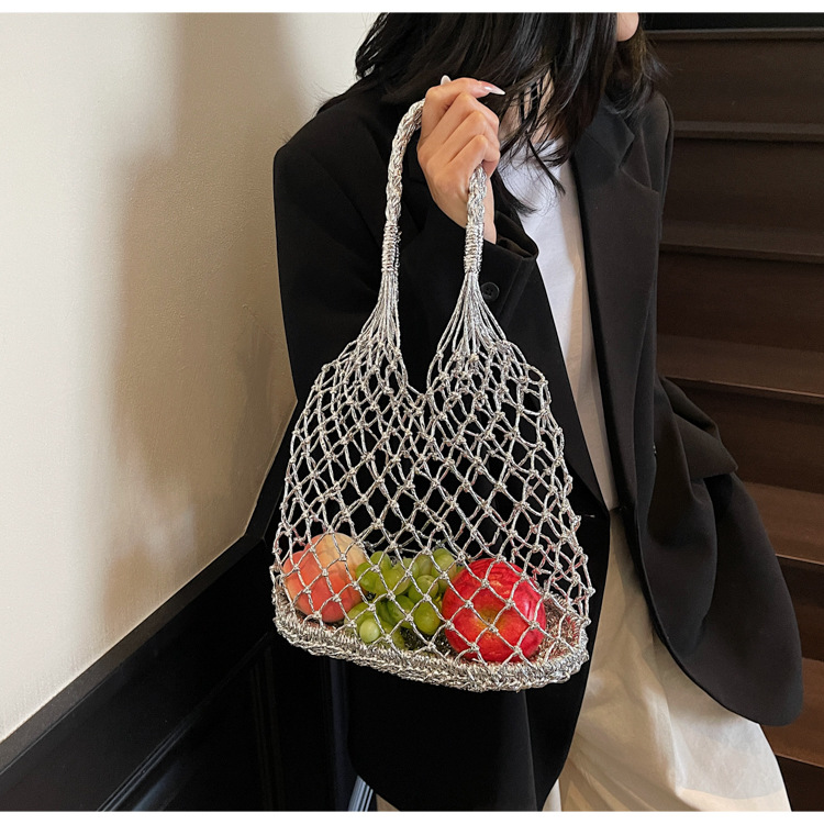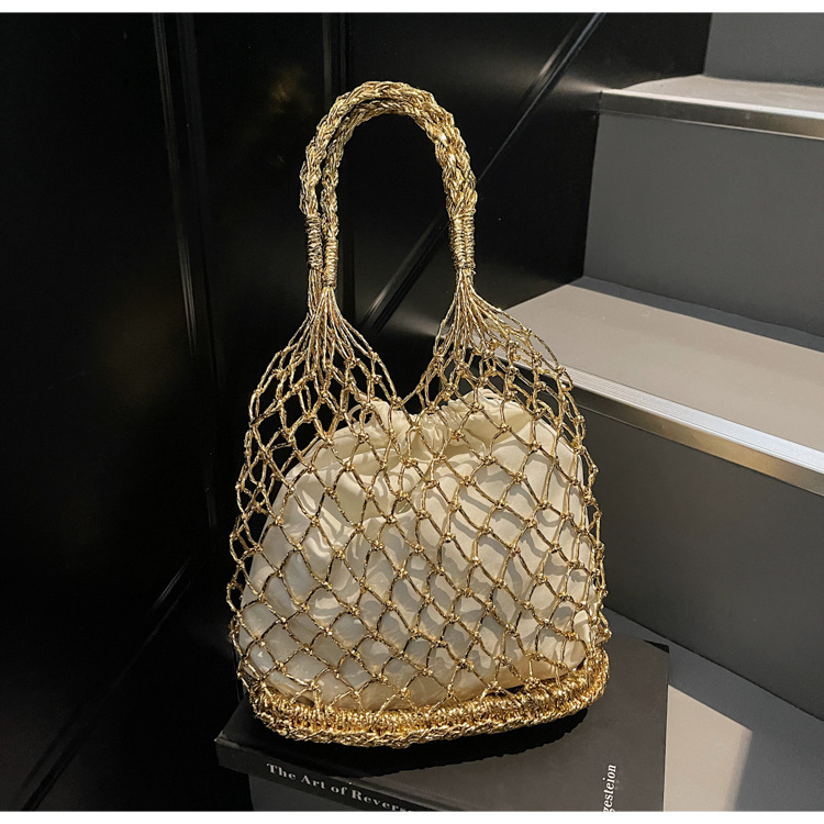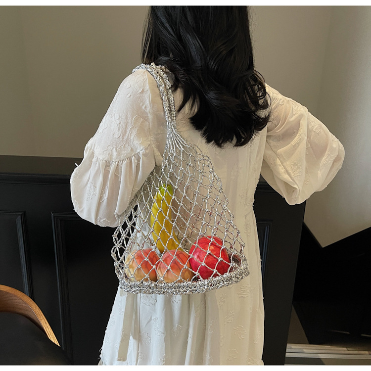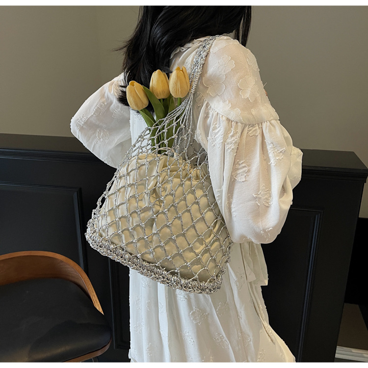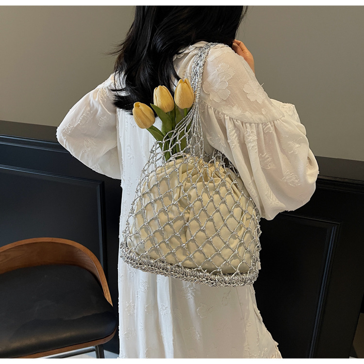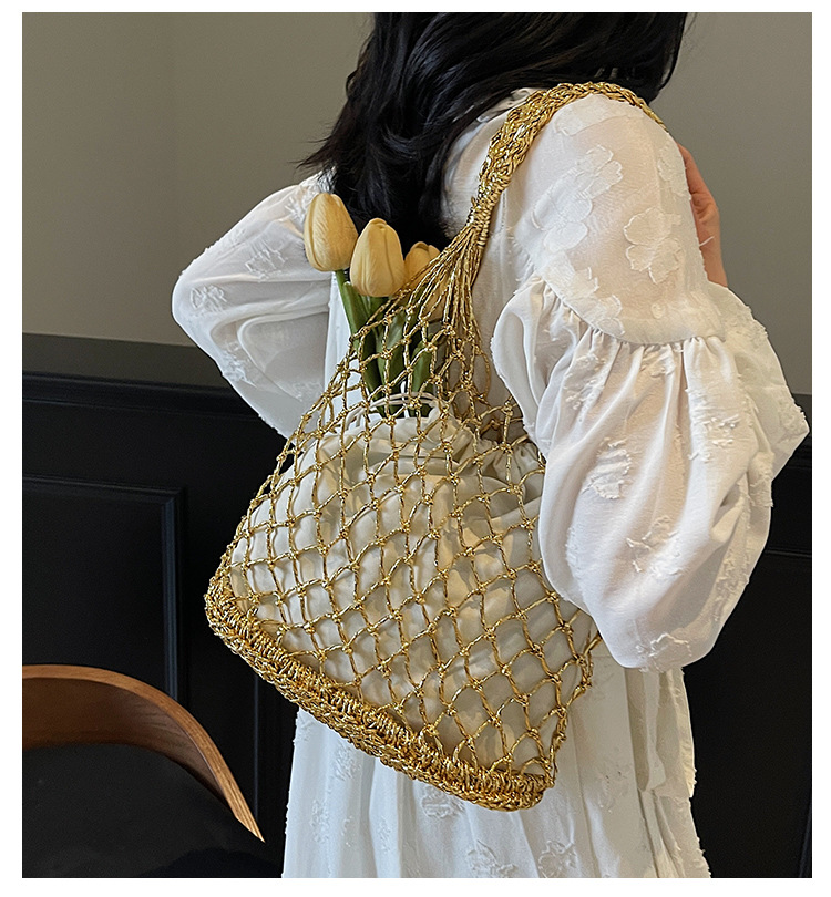 Ins nuevo bolso tejido a mano de hilo dorado y plateado de color sólido, bolso femenino de mano de moda de moda, bolso de playa portátil Mori