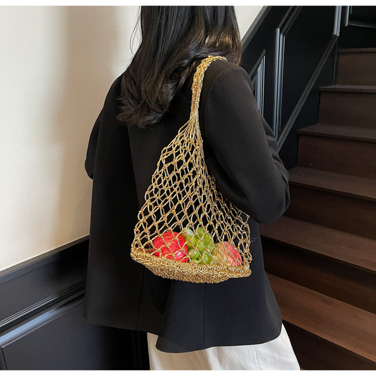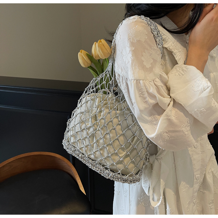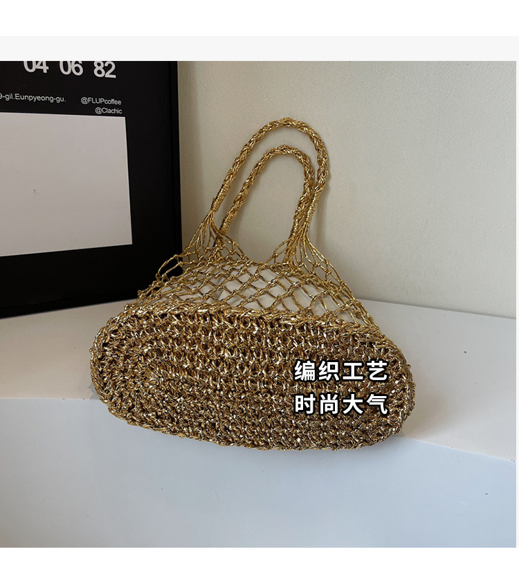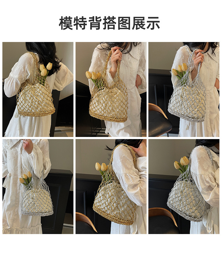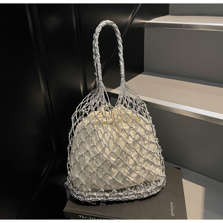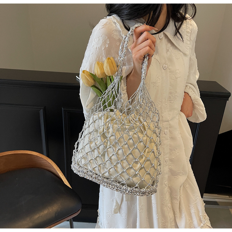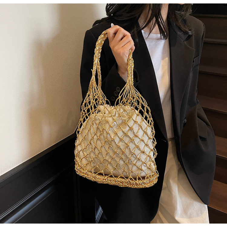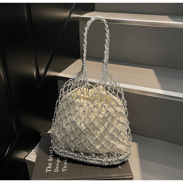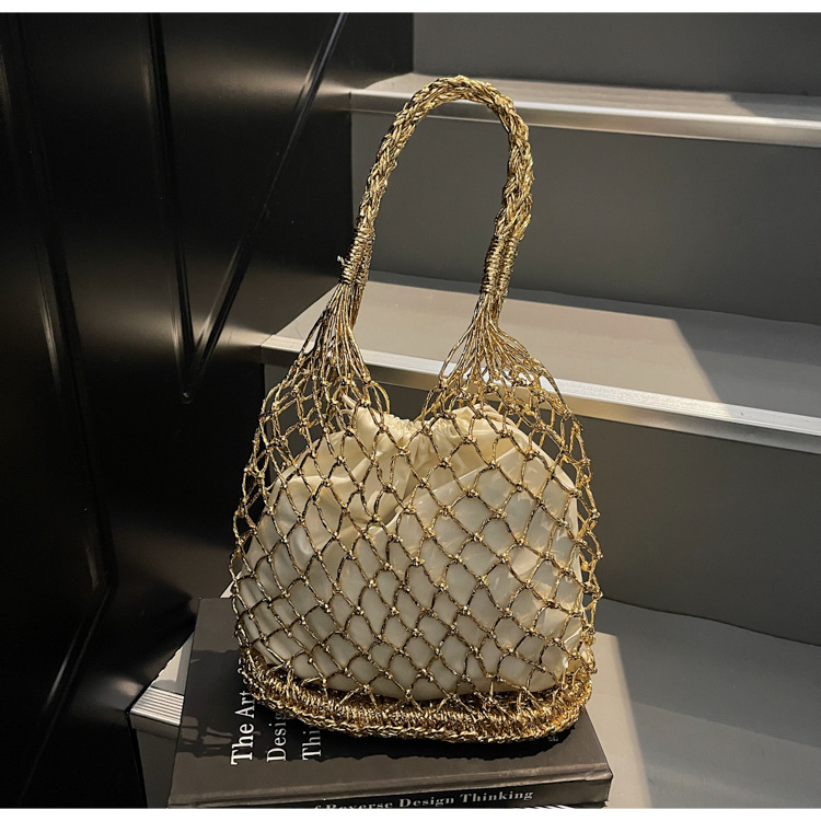 Ins nuevo bolso tejido a mano de hilo dorado y plateado de color sólido, bolso femenino de mano de moda de moda, bolso de playa portátil Mori