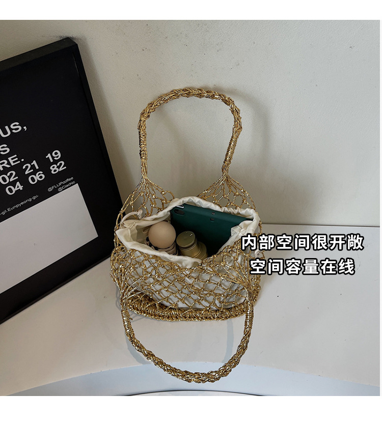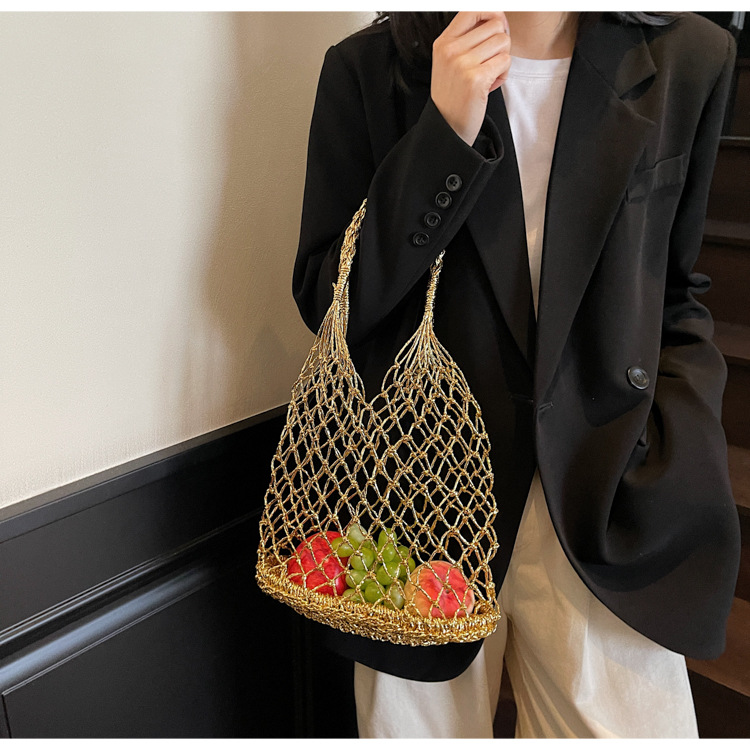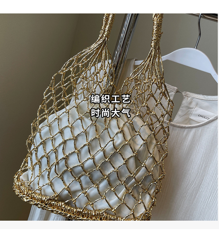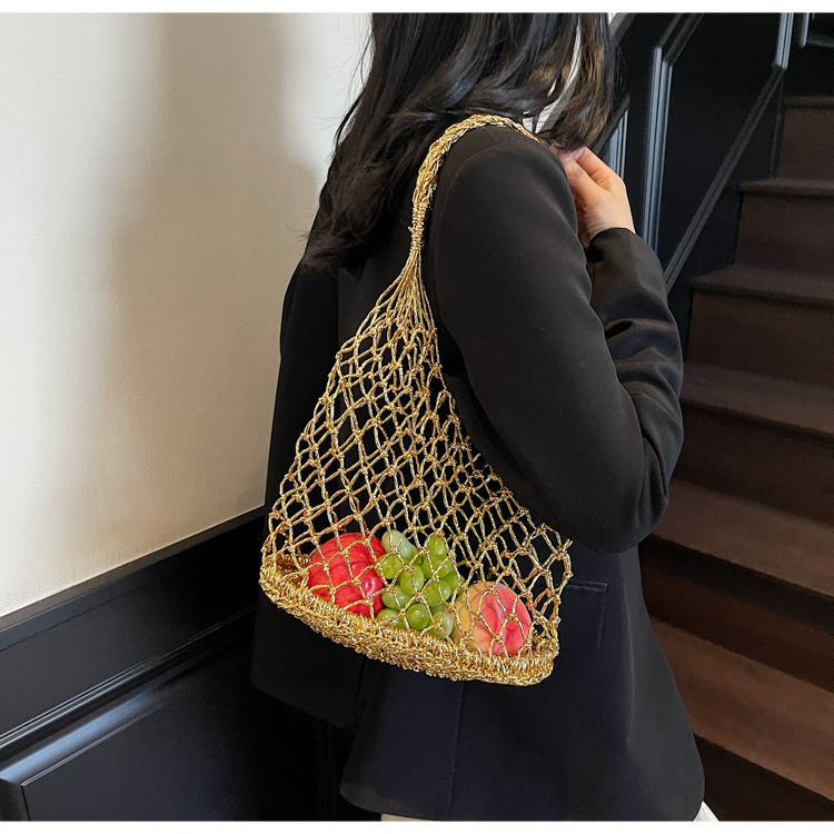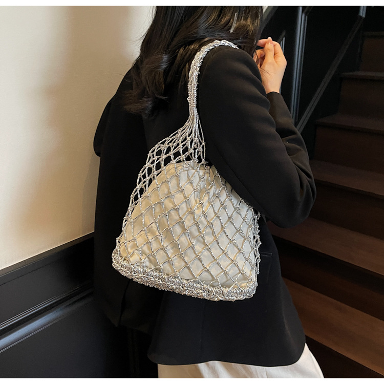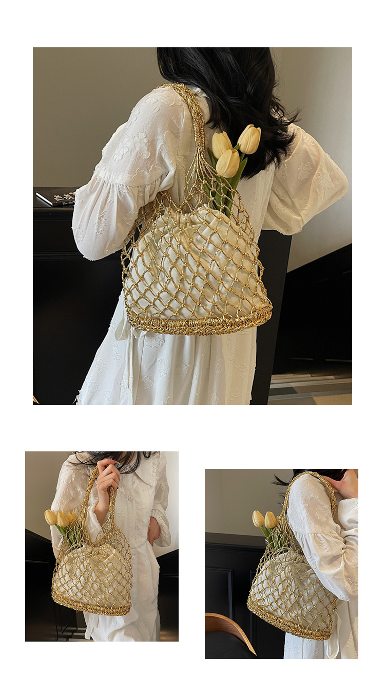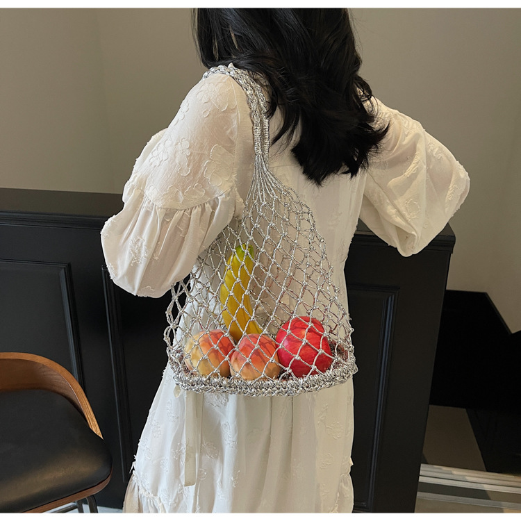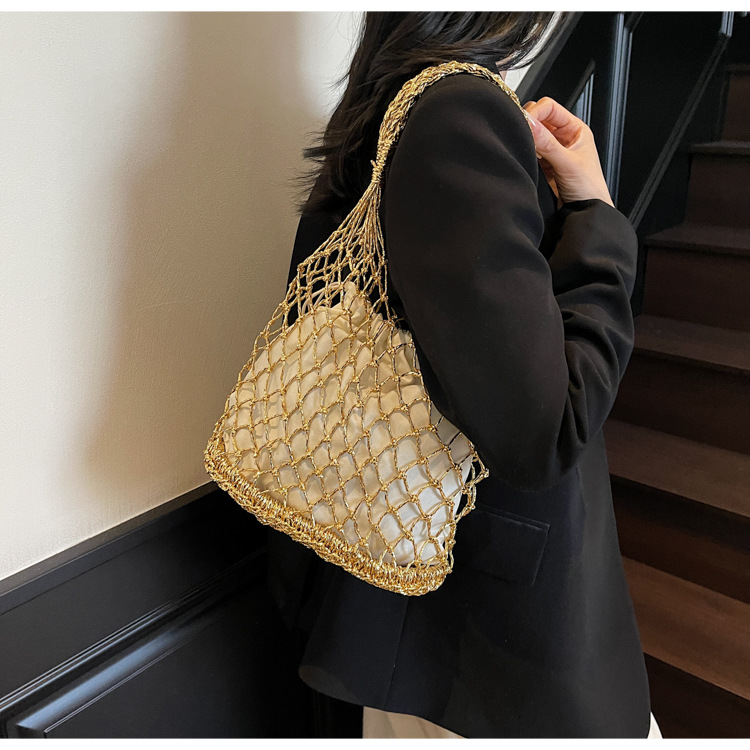 Ins nuevo bolso tejido a mano de hilo dorado y plateado de color sólido, bolso femenino de mano de moda de moda, bolso de playa portátil Mori