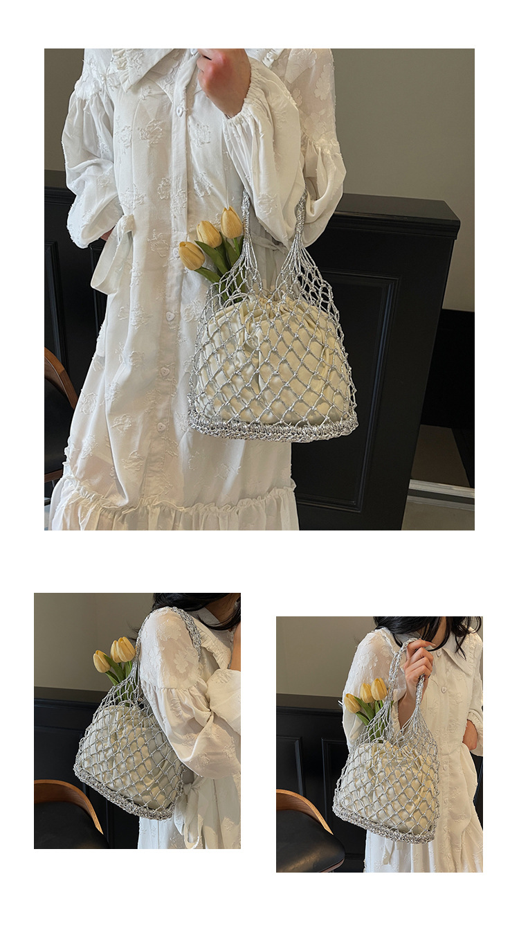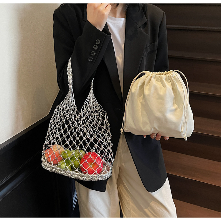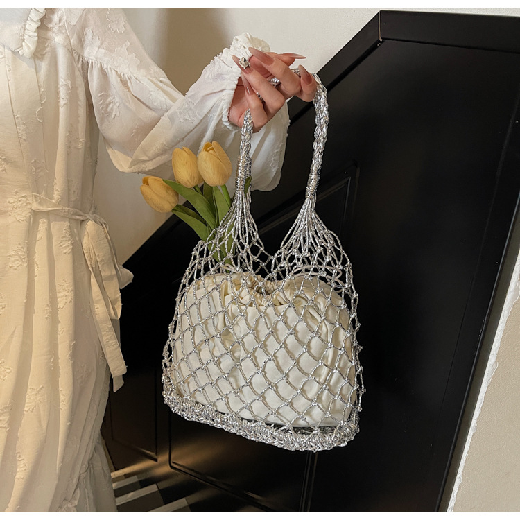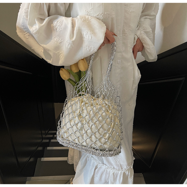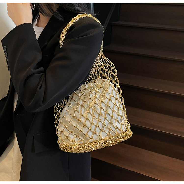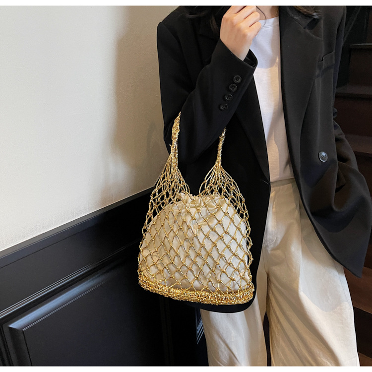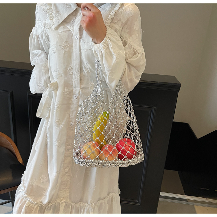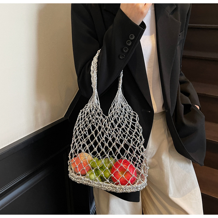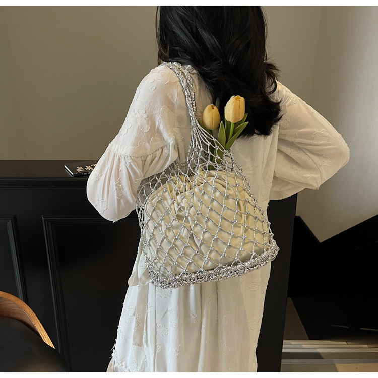 Ins nuevo bolso tejido a mano de hilo dorado y plateado de color sólido, bolso femenino de mano de moda de moda, bolso de playa portátil Mori