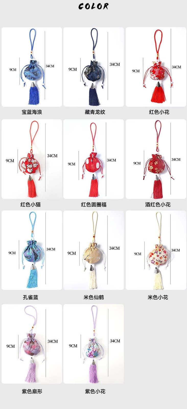 | Color | Olas azules (34 * 9 cm), patrón de dragón azul tibetano (34 * 9 cm), flores rojas (34 * 9 cm), gatito rojo (34 * 9 cm), círculo rojo Fu (34 * 9 cm), flores rojas (34 * 9 cm), azul pavón (34 * 9 cm), grúa beige (34 * 9 cm), flores beige (34 * 9 cm), abanico púrpura (34 * 9 cm), flores púrpura (34 * 9 cm) |