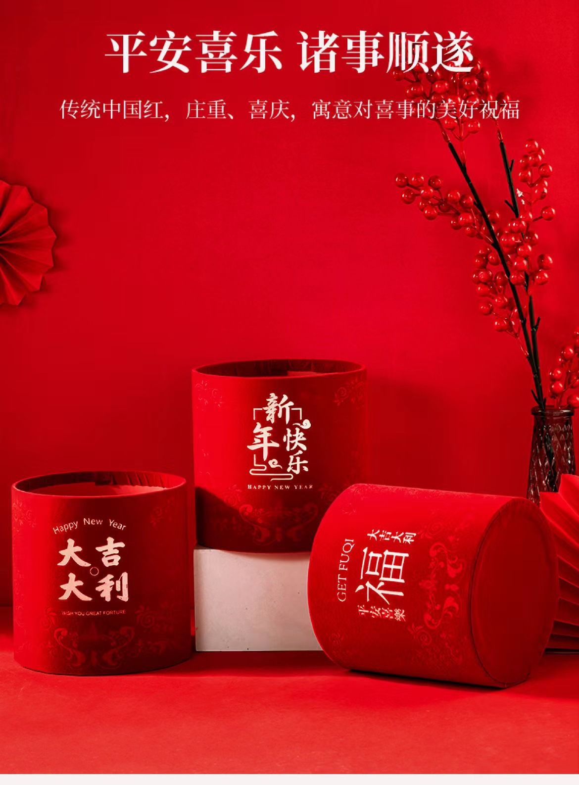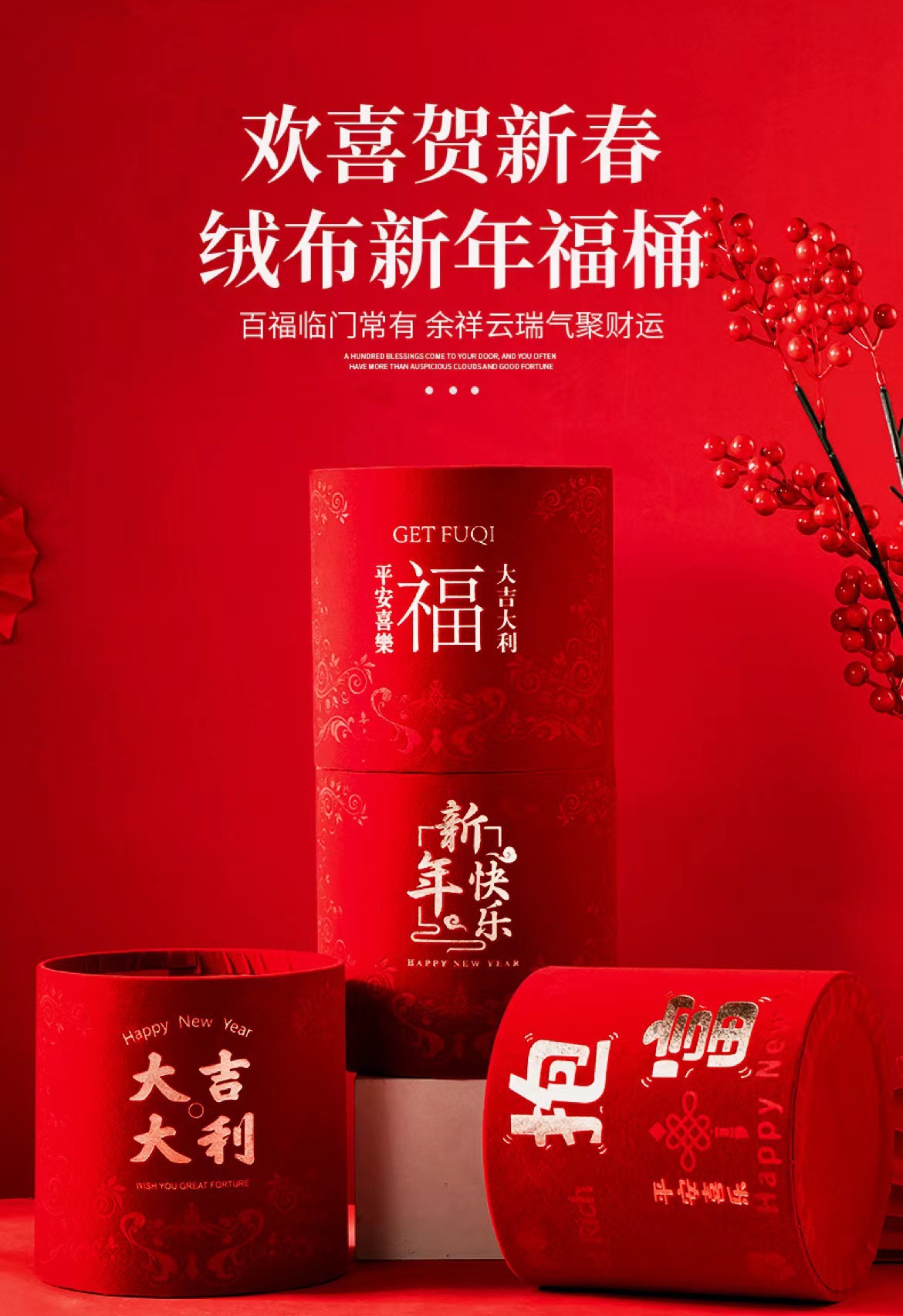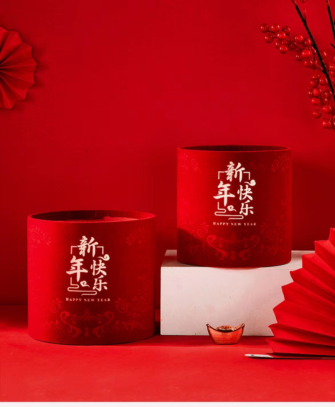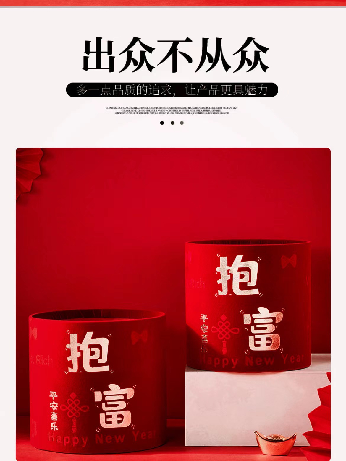 Barril de Año Nuevo cubierto de doble redondo estampado dorado rojo abrazar barril de tela de terciopelo al por mayor barril de flores de flores de Año Nuevo