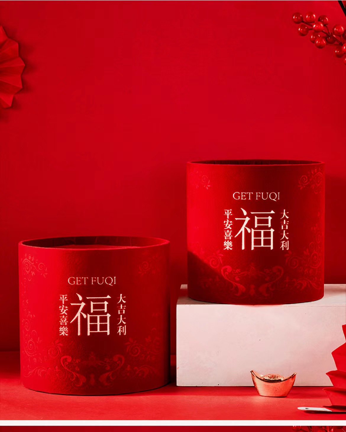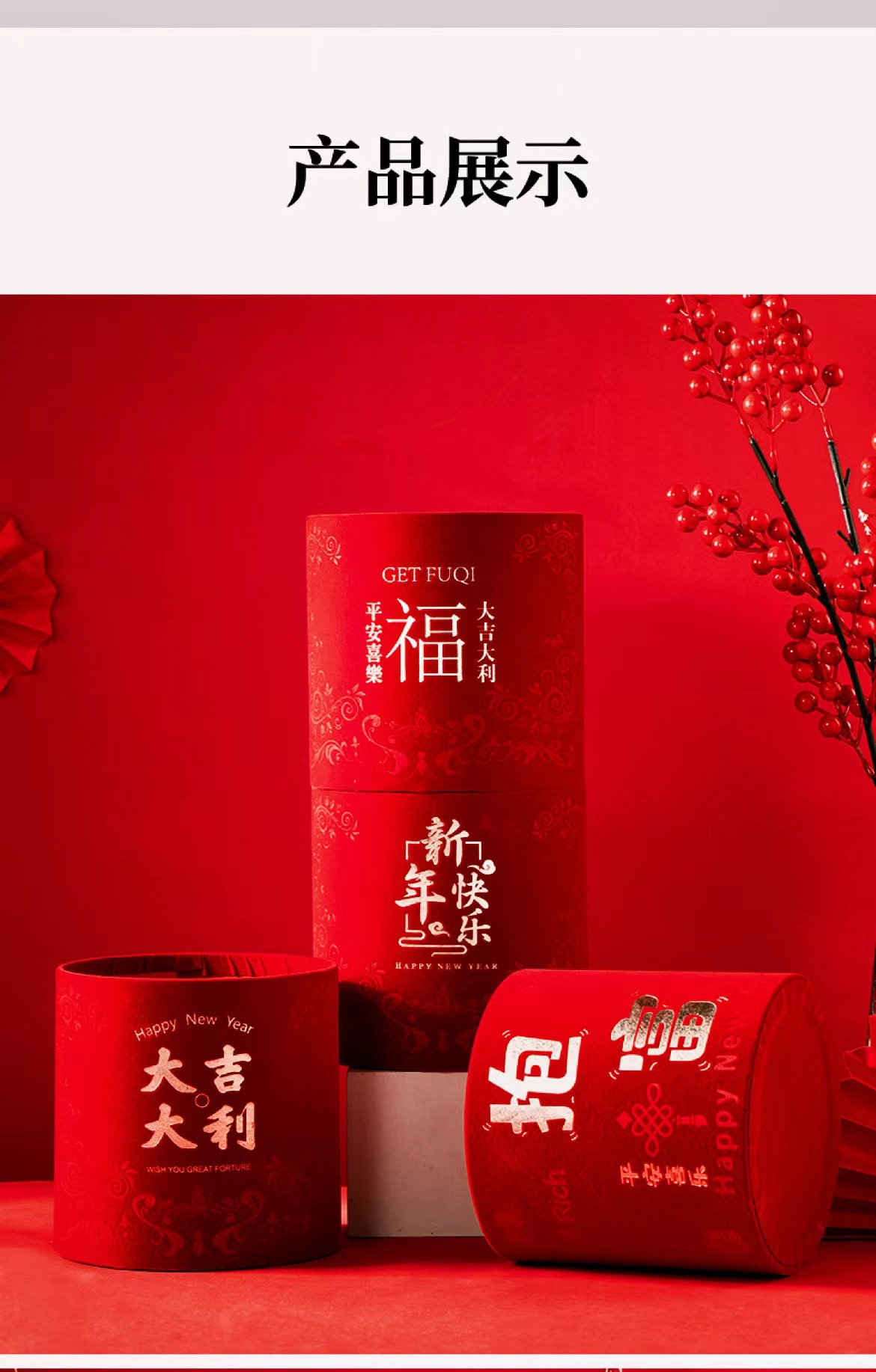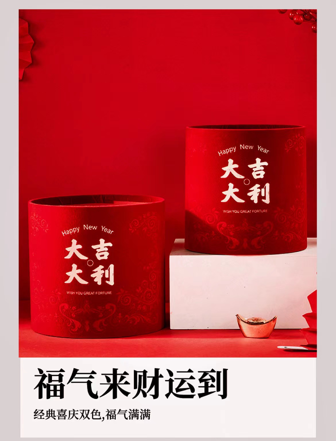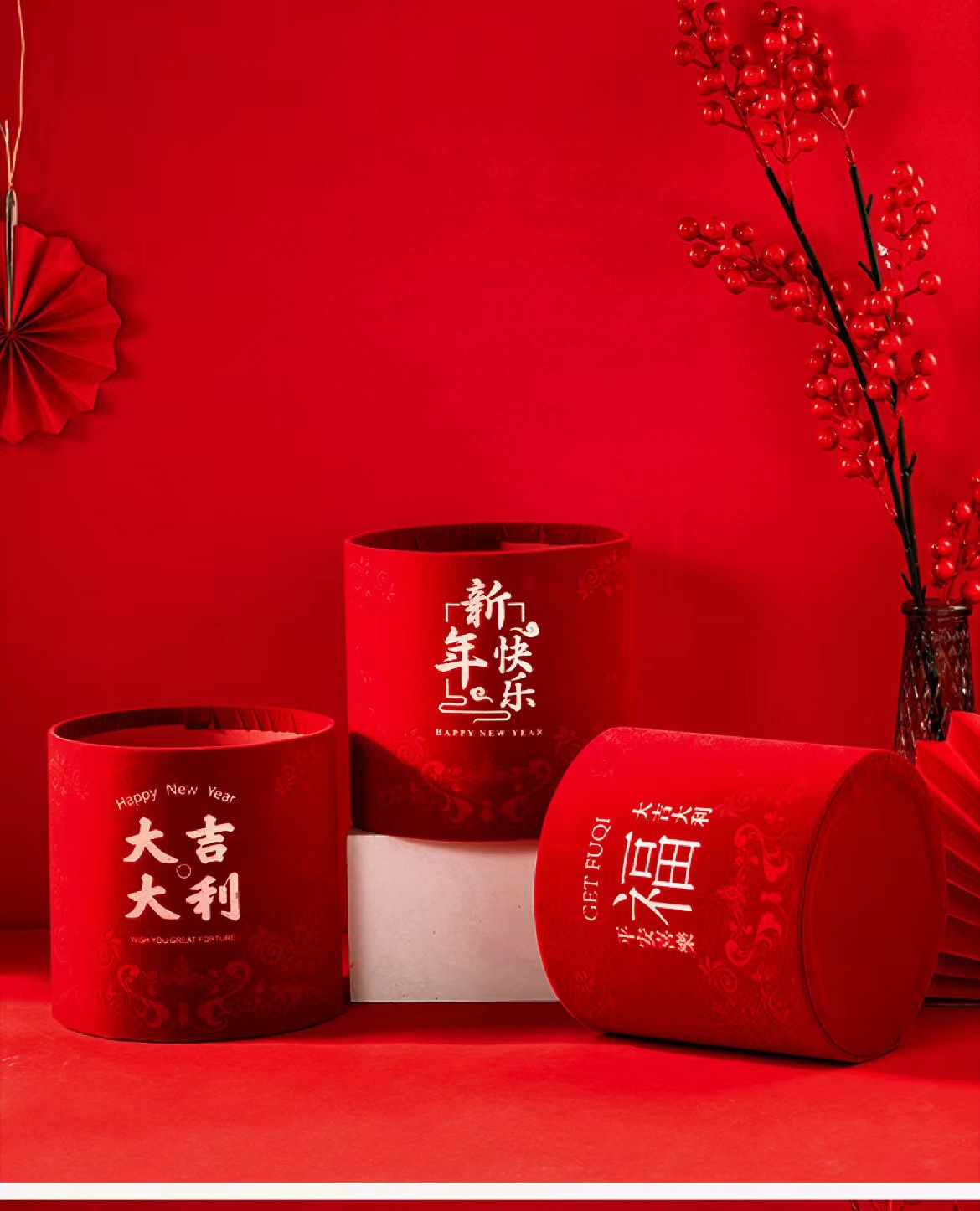 Barril de Año Nuevo cubierto de doble redondo estampado dorado rojo abrazar barril de tela de terciopelo al por mayor barril de flores de flores de Año Nuevo
