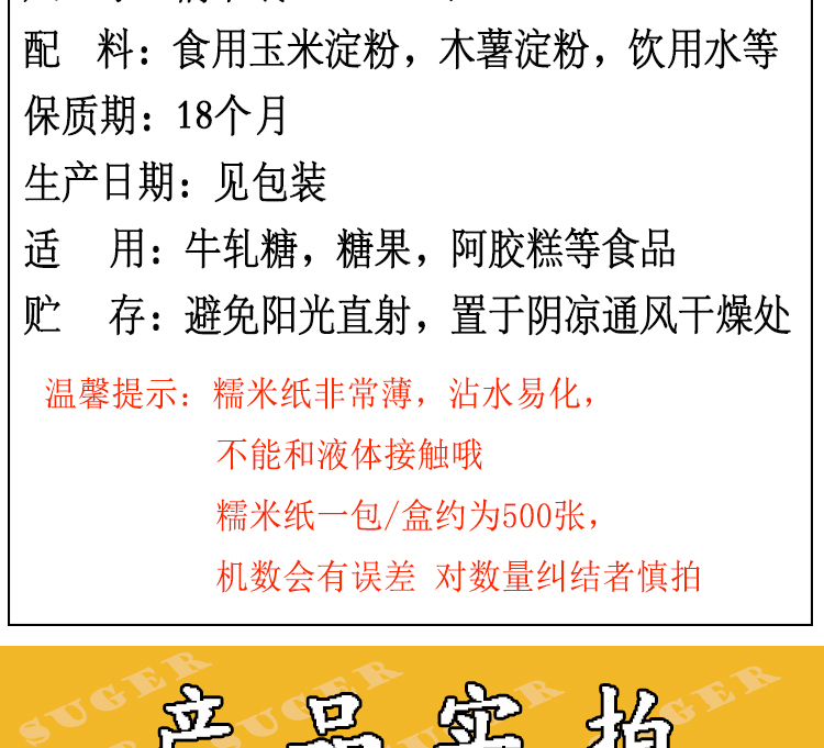 | Especificaciones y modelos | Una bolsa de aproximadamente 100 hojas de nougat 6.5x8 (2 piezas para 3 piezas), una bolsa de aproximadamente 500 hojas de nougat 6.5x8 (2 piezas para 3 piezas), una bolsa de aproximadamente 1000 hojas de nougat 6.5x8 (2 piezas para 3 piezas), una bolsa de aproximadamente 2000 hojas de nougat 6.5x8 y una caja de aproximadamente 500 hojas de nougat 6.5x8 (2 piezas para 3 piezas), una caja de aproximadamente 1000 hojas de nougat 6.5x8 (2 piezas para 3 piezas), una caja de aproximadamente 2000 hojas de nougat 6.5x8, Paste de Jiaojia 6.5x10 alrededor de 500 hojas en bolsas (2 piezas para 3 piezas), paste de Jiaojia 6.5x10 alrededor de 1000 hojas en bolsas (2 piezas para 3 piezas), paste de Jiaojia 6.5x10 alrededor de 2000 hojas en bolsas, paste de Jiaojia 6.5x10 alrededor de 500 hojas en cajas (2 piezas para 3 piezas), paste de Jiaojia 6.5x10 alrededor de 1000 hojas en cajas (2 piezas para 3 piezas), paste de Jiaojia 6.5x10 alrededor de 2000 hojas en cajas, Mini calabaza de azúcar 8x12 alrededor de 200 hojas en bolsas (disparar 2 piezas y enviar 3 piezas), mini calabaza de azúcar 8x12 alrededor de 500 hojas en bolsas (disparar 2 piezas y enviar 3 piezas) |