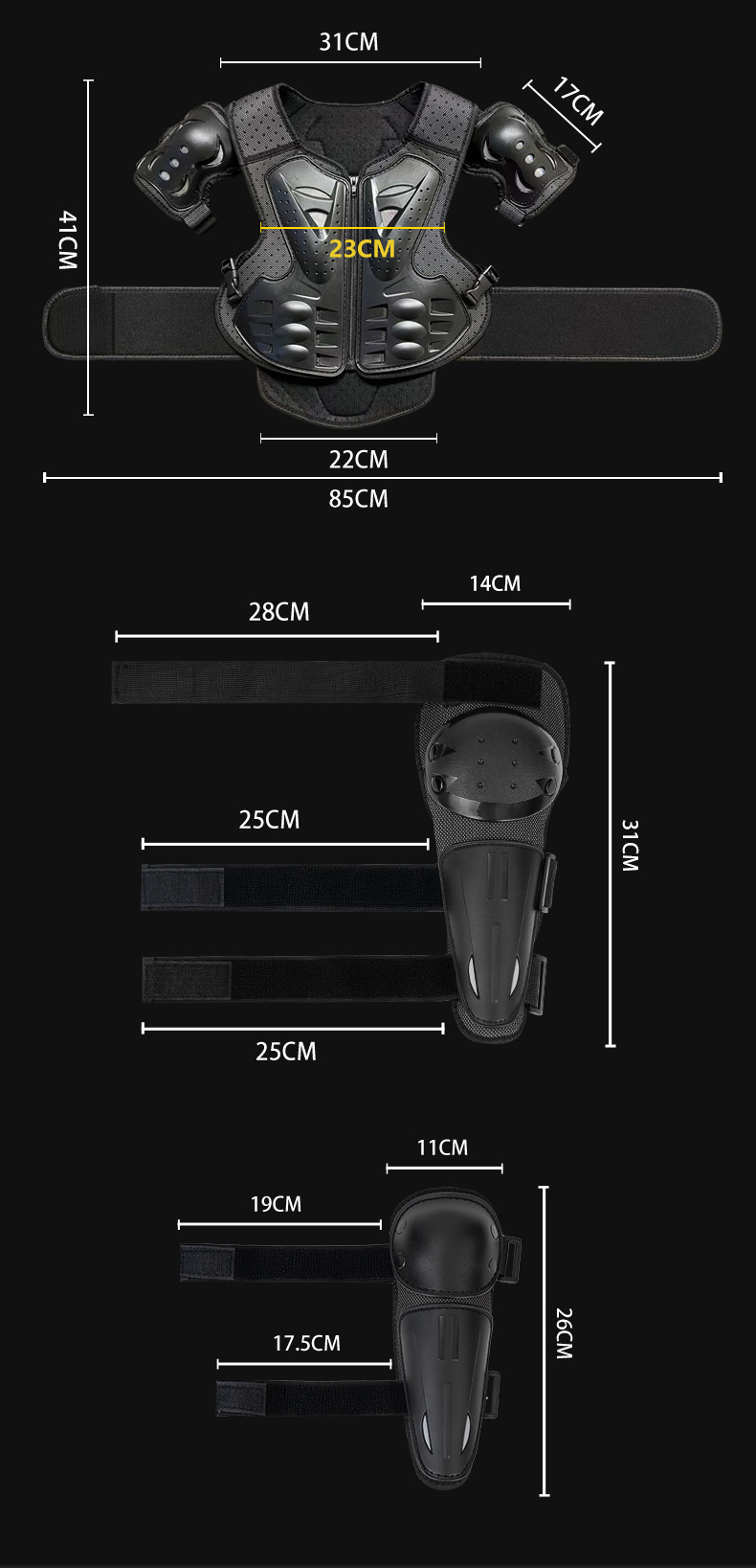 | Color | Armadura de hombro de cinco piezas (armadura de hombro + codo + rodilla), armadura de hombro de niños negro, rodilla negra de niños, codo negro de niños |
