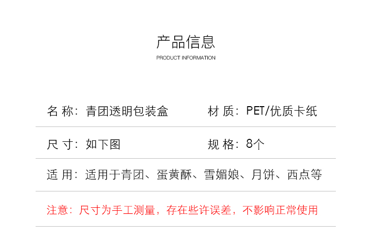 | Especificaciones y modelos | 2格装W060+青团贴纸 【单格70-80克】-50套,2格装W060+青团贴纸 【单格70-80克】-100套,3格装W360+青团贴纸 【单格70-80克】-50套,3格装W360+青团贴纸 【单格70-80克】-100套,4格装W134小号+青团贴纸 【单格45-60克】-50套,4格装W134小号+青团贴纸 【单格45-60克】-100套,4格装W136中号+青团贴纸 【单格70-80克】-50套,4格装W136中号+青团贴纸 【单格70-80克】-100套,4格装W138大号+青团贴纸 【单格100克】-50套,4格装W138大号+青团贴纸 【单格100克】-100套,4格装W064中号+青团贴纸 【单格70-80克】-50套,4格装W064中号+青团贴纸 【单格70-80克】-100套,6格装W206+青团贴纸 【单格70-80克】-50套,6格装W206+青团贴纸 【单格70-80克】-100套,6格装W335小号+青团贴纸 【单格40-50克】-50套,6格装W335小号+青团贴纸 【单格40-50克】-100套,6格装W334中号+青团贴纸 【单格50-60克】-50套,6格装W334中号+青团贴纸 【单格50-60克】-100套,6格装W332大号+青团贴纸 【单格60-70克】-50套,6格装W332大号+青团贴纸 【单格60-70克】-100套,加厚2格装W260+青团贴纸 【单格70-80克】-50套,加厚2格装W260+青团贴纸 【单格70-80克】-100套,加厚4格装W460+青团贴纸 【单格70-80克】-50套,加厚4格装W460+青团贴纸 【单格70-80克】-100套,加厚6格装W666+青团贴纸 【单格70-80克】-50套,加厚6格装W666+青团贴纸 【单格70-80克】-100套,加厚9格装W069+青团贴纸 【单格70-80克】-50套,加厚9格装W069+青团贴纸 【单格70-80克】-100套,单粒装W60黑色+青团贴纸 【约60-80克】-50套,单粒装W60黑色+青团贴纸 【约60-80克】-100套,单粒装W60金色+青团贴纸 【约60-80克】-50套,单粒装W60金色+青团贴纸 【约60-80克】-100套,单粒装W650黑色+青团贴纸 【约60-100克】-50套,单粒装W650黑色+青团贴纸 【约60-100克】-100套,单粒装W650绿色+青团贴纸 【约60-100克】-50套,单粒装W650绿色+青团贴纸 【约60-100克】-100套,粉红色 W650粉色+青团贴-50套,粉红色 W650粉色+青团贴-100套,青色 小号青团贴纸-50套,青色 小号青团贴纸-100套,浅绿色 大号青团贴纸-50套,浅绿色 大号青团贴纸-100套 |