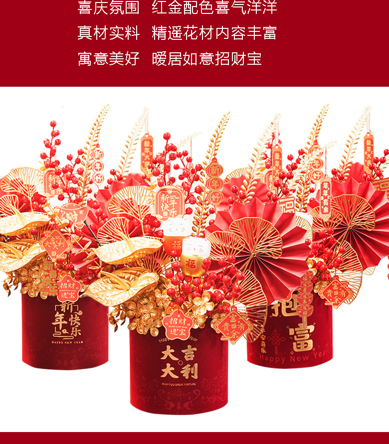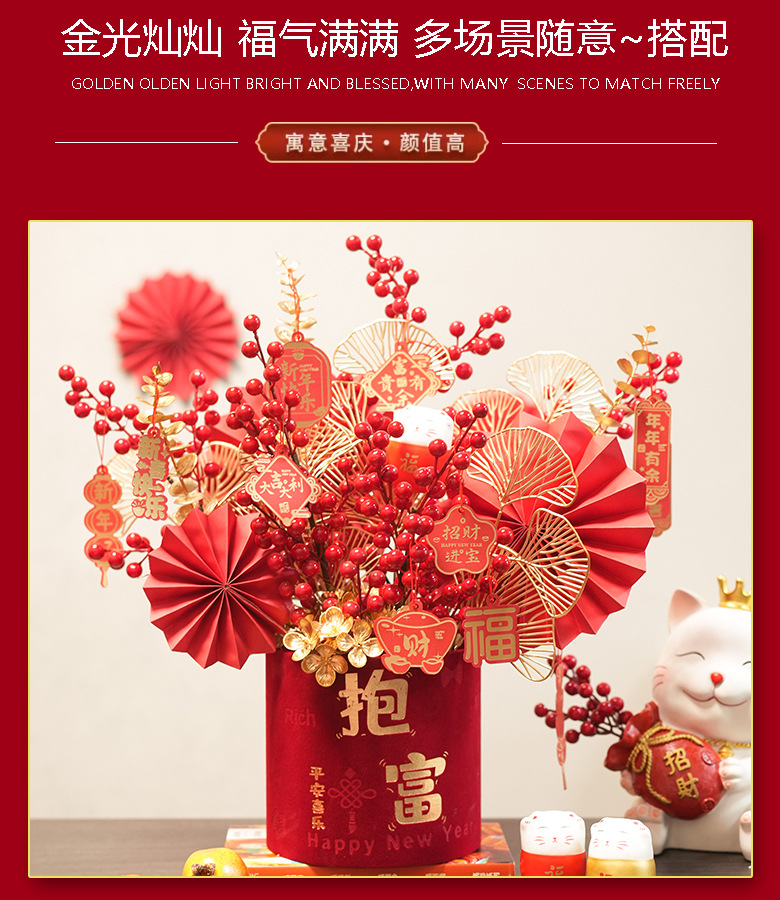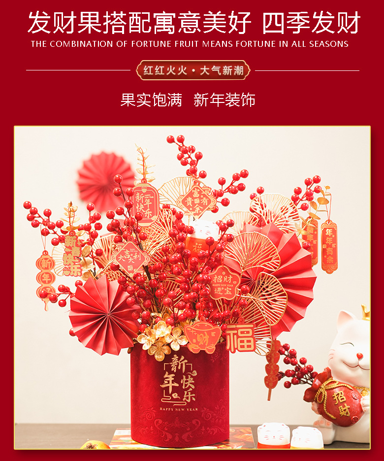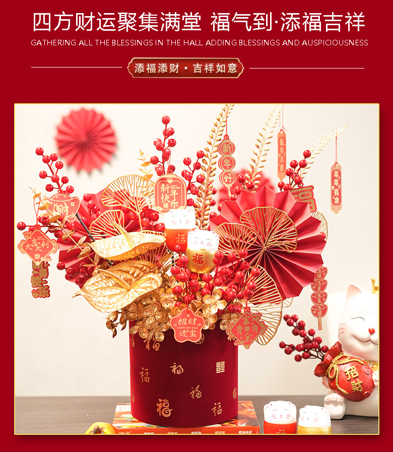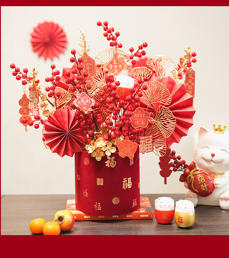 Año Nuevo decoración festivo acabado artificial flor fortuna fruta bendición cubo flor arreglo movimiento de inauguración felicidad en macetas hogar