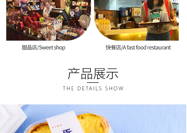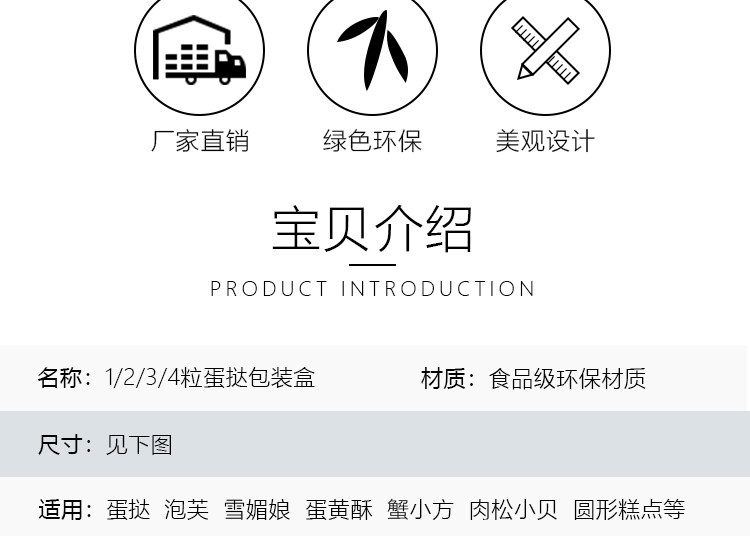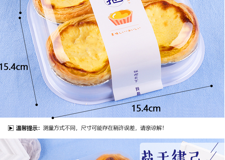 | Especificaciones y modelos | 一粒装白盒-50个/份,一粒装白盒-100个/份,一 粒装白盒+默认白色蛋挞贴-50个/份,一 粒装白盒+默认白色蛋挞贴-100个/份,卡其色 一粒白+蝴蝶结贴-50个/份,卡其色 一粒白+蝴蝶结贴-100个/份,姜黄色 一粒白底+粉杯贴-50个/份,姜黄色 一粒白底+粉杯贴-100个/份,明黄色 一粒白底+蓝杯贴-50个/份,明黄色 一粒白底+蓝杯贴-100个/份,杏色 一粒白+可爱卡通-50个/份,杏色 一粒白+可爱卡通-100个/份,柠檬黄 一粒白+整蛋黄贴-50个/份,柠檬黄 一粒白+整蛋黄贴-100个/份,一粒白底+默认随机发小长雪媚娘 需要其他贴请备注-50个/份,一粒白底+默认随机发小长雪媚娘 需要其他贴请备注-100个/份,一粒白底+默认随机发小长蛋黄酥 需要其他贴请备注-50个/份,一粒白底+默认随机发小长蛋黄酥 需要其他贴请备注-100个/份,两粒装白盒-50个/份,两粒装白盒-100个/份,两粒装白盒+默认白色蛋挞贴-50个/份,两粒装白盒+默认白色蛋挞贴-100个/份,荧光黄 二粒白+蝴蝶结贴-50个/份,荧光黄 二粒白+蝴蝶结贴-100个/份,黄色 二粒白底+蓝杯贴-50个/份,黄色 二粒白底+蓝杯贴-100个/份,金色 二粒白+可爱卡通-50个/份,金色 二粒白+可爱卡通-100个/份,香槟色 二粒白底+粉杯贴-50个/份,香槟色 二粒白底+粉杯贴-100个/份,浅黄色 二粒白+整蛋黄贴-50个/份,浅黄色 二粒白+整蛋黄贴-100个/份,心型白底送纸托-50个/份,心型白底送纸托-100个/份,心型白+蝴蝶结贴-50个/份,心型白+蝴蝶结贴-100个/份,心型白底+蓝杯贴-50个/份,心型白底+蓝杯贴-100个/份,心型白+可爱卡通-50个/份,心型白+可爱卡通-100个/份,心型白底+粉杯贴-50个/份,心型白底+粉杯贴-100个/份,心型白+整蛋黄贴-50个/份,心型白+整蛋黄贴-100个/份,三粒装白盒-50个/份,三粒装白盒-100个/份,三粒装白盒+默认白色蛋挞贴-50个/份,三粒装白盒+默认白色蛋挞贴-100个/份,四粒装白盒-50个/份,四粒装白盒-100个/份,四粒装白盒+默认白色蛋挞贴-50个/份,四粒装白盒+默认白色蛋挞贴-100个/份,荧光绿 四粒白+蝴蝶结贴-50个/份,荧光绿 四粒白+蝴蝶结贴-100个/份,绿色 四粒白底+蓝杯贴-50个/份,绿色 四粒白底+蓝杯贴-100个/份,天蓝色 四粒白+可爱卡通-50个/份,天蓝色 四粒白+可爱卡通-100个/份,青色 四粒白底+粉杯贴-50个/份,青色 四粒白底+粉杯贴-100个/份,军绿色 四粒白+整蛋黄贴-50个/份,军绿色 四粒白+整蛋黄贴-100个/份,2粒装蛋挞盒-50个/份,2粒装蛋挞盒-100个/份,3粒装蛋挞盒-50个/份,3粒装蛋挞盒-100个/份,4粒装蛋挞盒-50个/份,4粒装蛋挞盒-100个/份,蛋挞锡纸托 100个一份-50个/份,蛋挞锡纸托 100个一份-100个/份,蓝 透明2粒蛋挞盒-50个/份,蓝 透明2粒蛋挞盒-100个/份,粉 透明4粒蛋挞盒-50个/份,粉 透明4粒蛋挞盒-100个/份 |