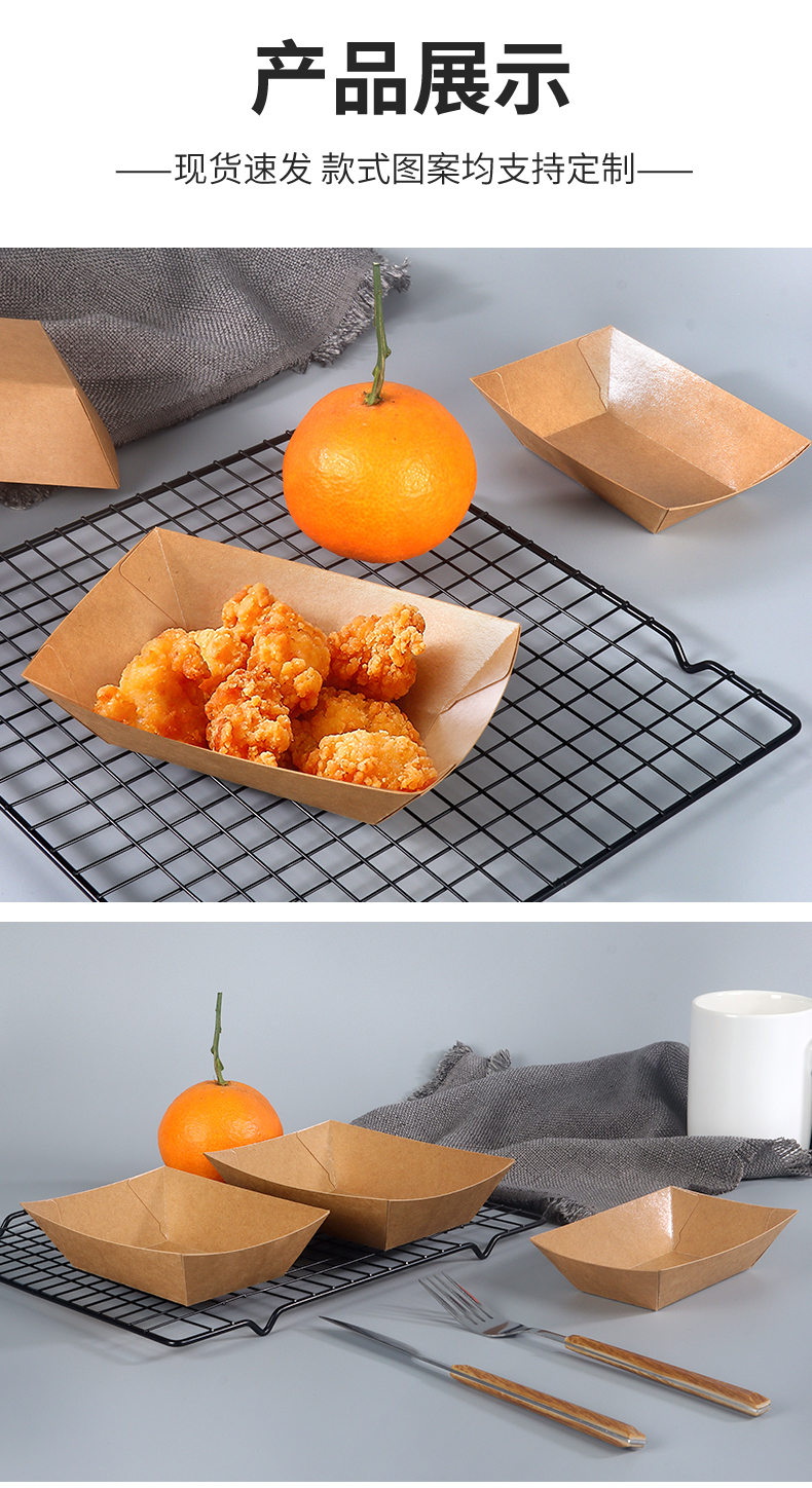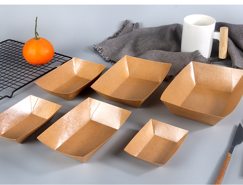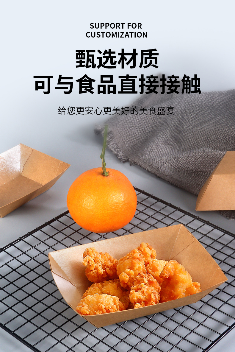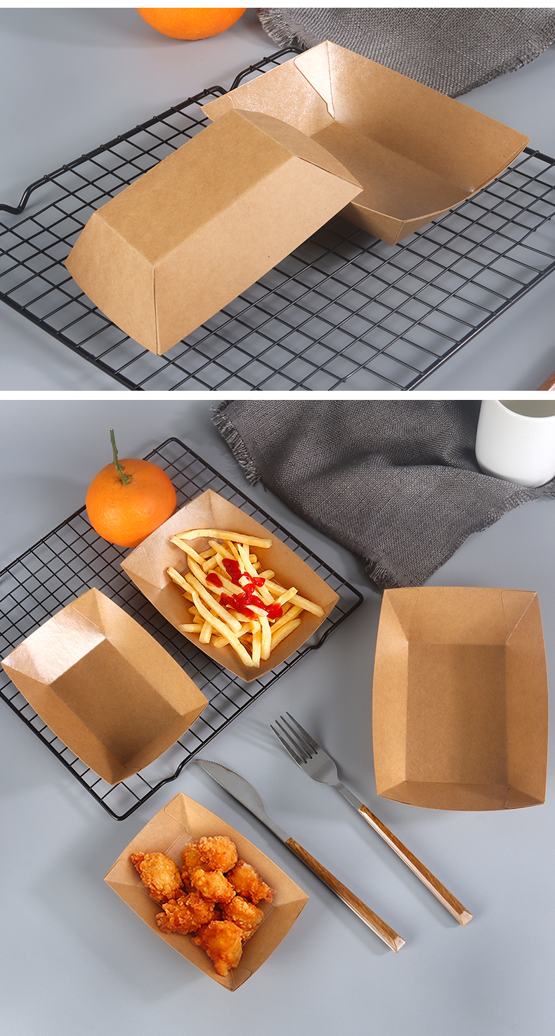 Caja de barco kraft comercial a prueba de aceite gruesa, frita de papas fritas, barbecue, bocadillos en forma de barco, caja de embalaje personalizada