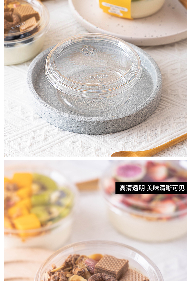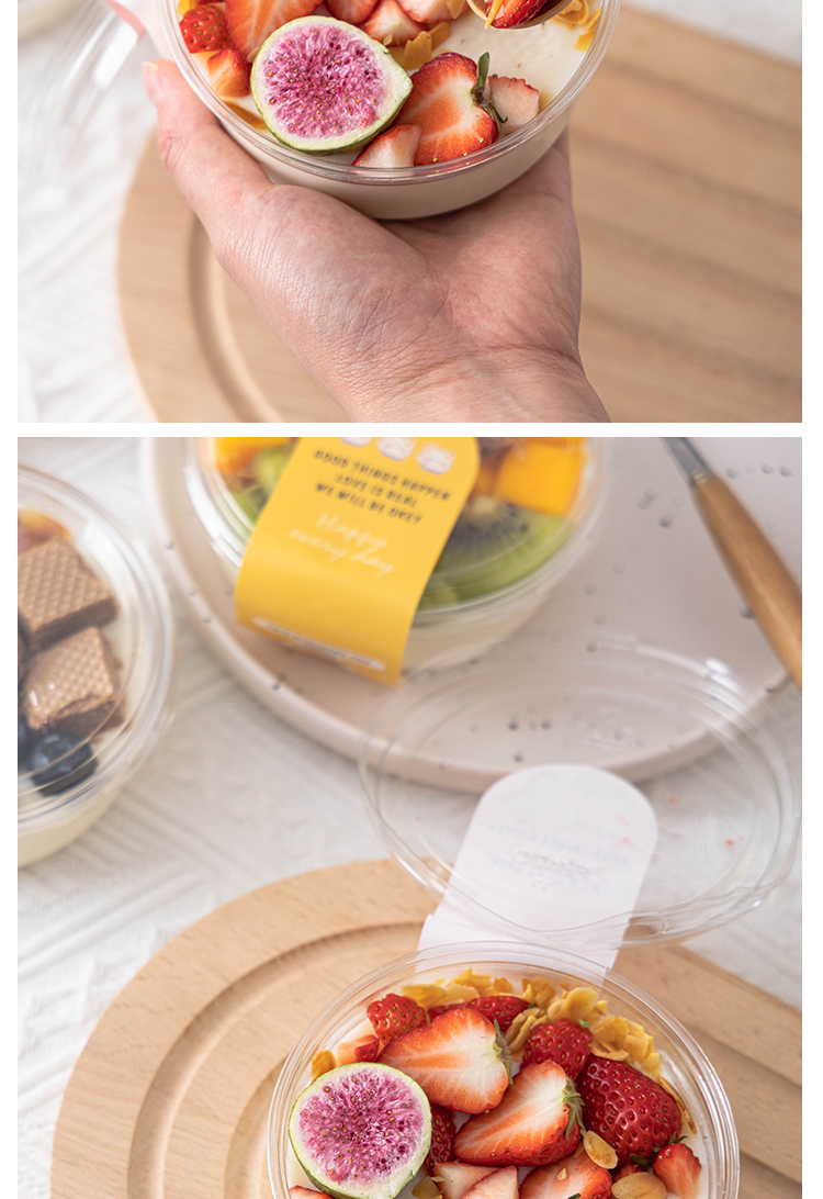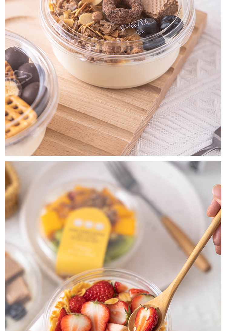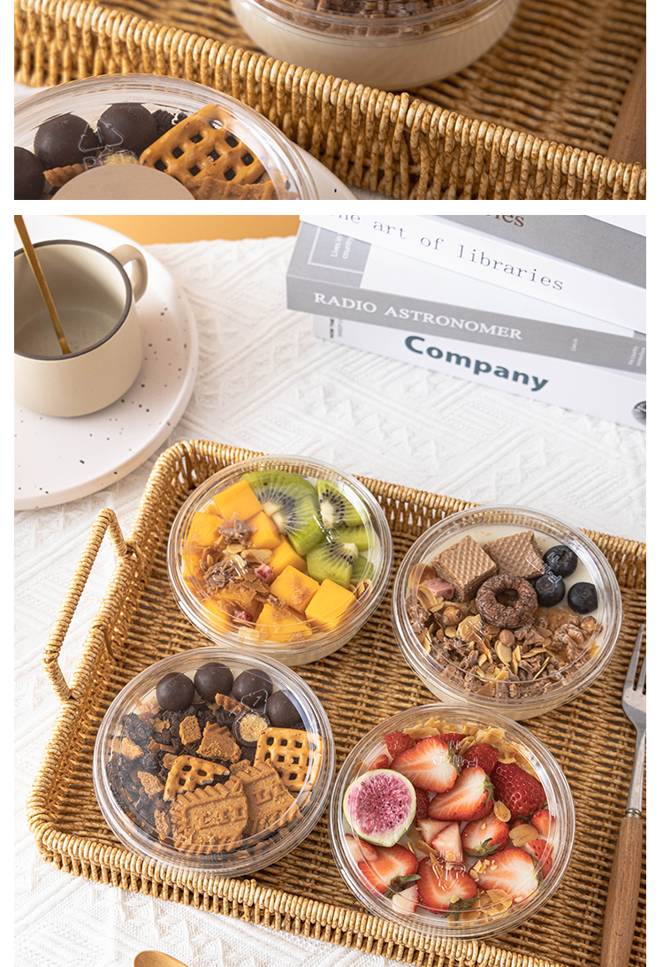 Taza de yogur en frío, arroz, pudín, leche de coco, grano de trigo, fruta, tazón transparente, pastel horneado, caja de embalaje de plástico
