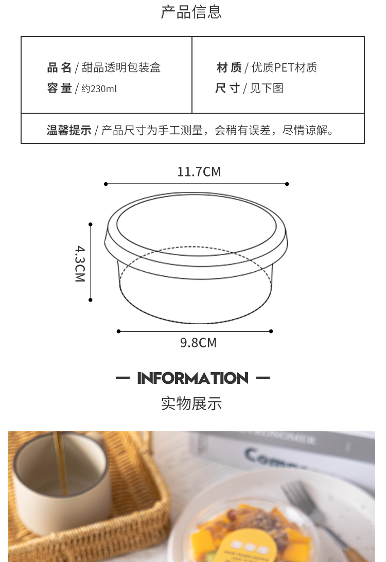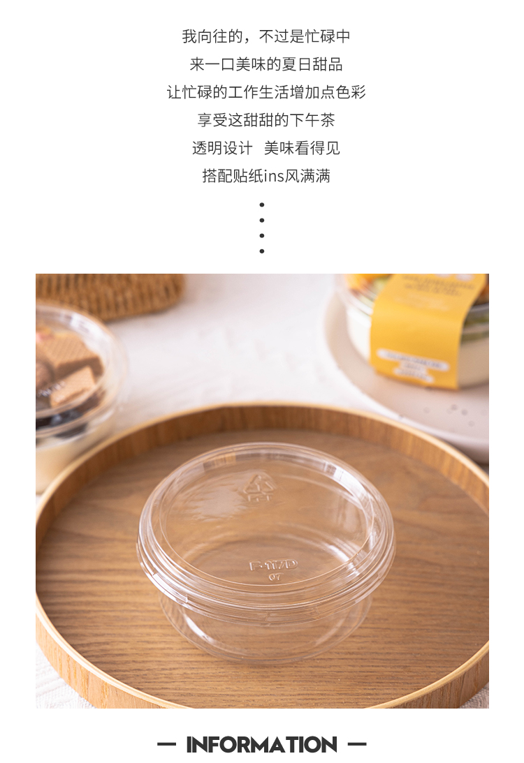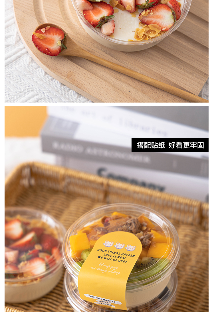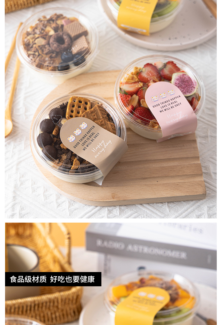 Taza de yogur en frío, arroz, pudín, leche de coco, grano de trigo, fruta, tazón transparente, pastel horneado, caja de embalaje de plástico