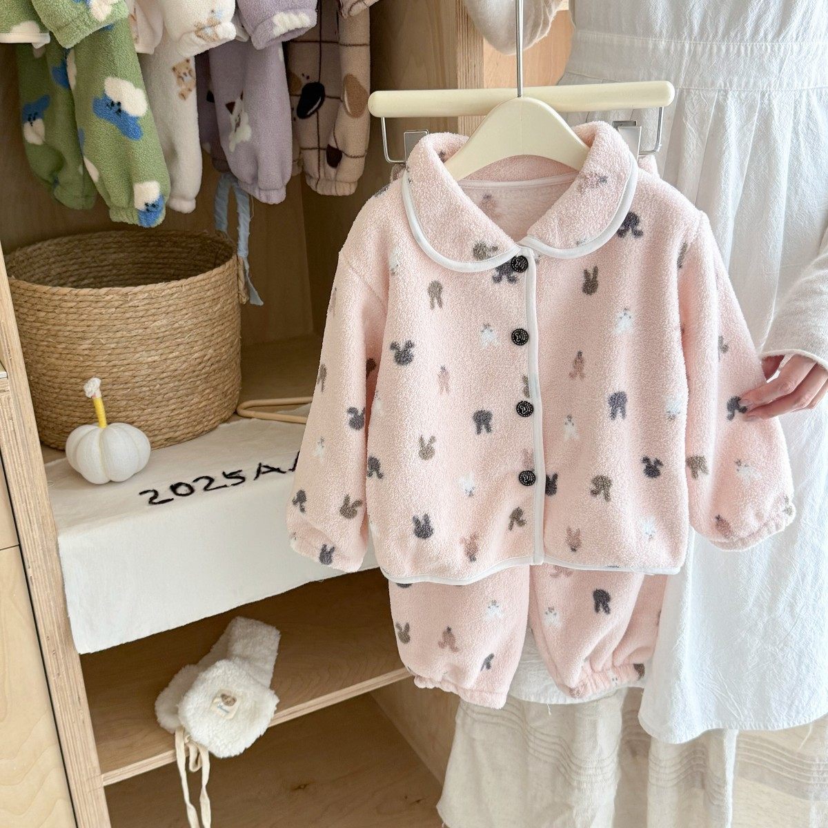 Pijamas para niños engrosados ropa de hogar Cardigan juego de niños y niñas otoño invierno pelusa con collar de peluche caliente dos conjuntos