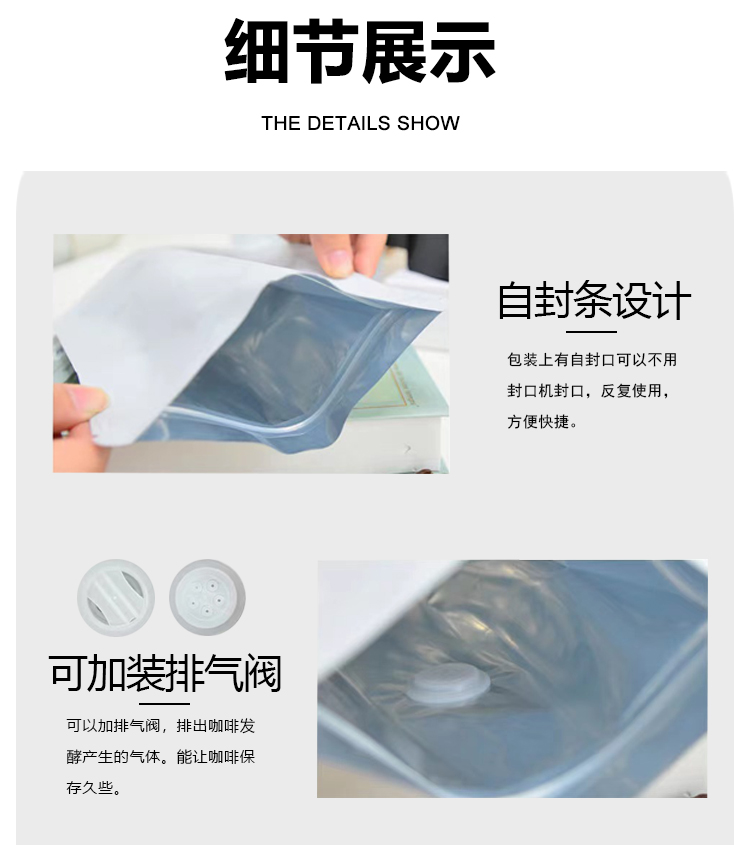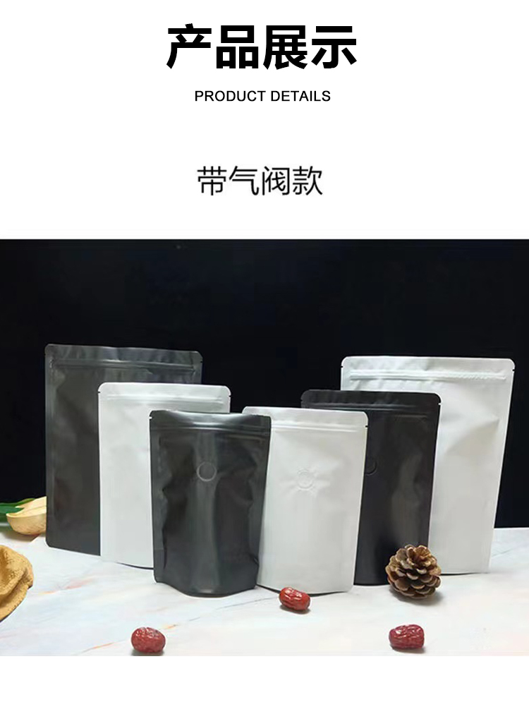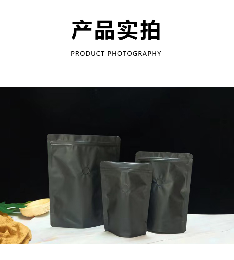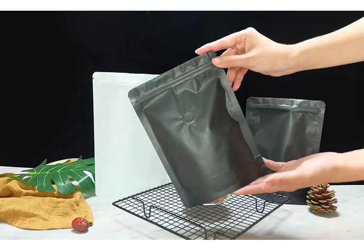 Granos de café bolsa de embalaje cremallera unidireccional válvula de escape gruesa lámina de aluminio alimentos personalizados bocadillos té auto-sellar autosuficiente