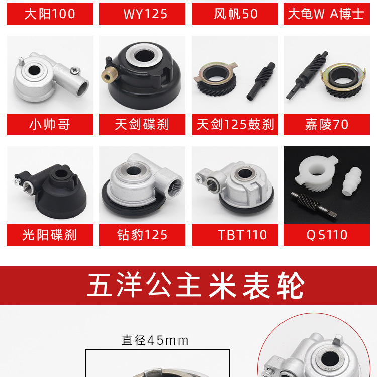 | Especificaciones | Dr. Turtle King Un Metro rueda/pieza,Rueda/pieza del medidor Wuyang Princess,Dayang 100 M reloj Rueda,Tormenta Prince medidor de rueda/pieza,Rueda Reloj Sail 50 m,GS125 medidor de rueda/pieza,Guangyang 125 m rueda de reloj/pieza,TBT110 medidor Rueda,Tianjian 125 m reloj rueda disco freno/pieza,Tianjian 125 m reloj Tipo de freno de tambor de rueda/pieza,WY125 medidor de rueda/Set,Guapo chico medidor rueda/pieza,Leopardo de diamante 125 m rueda de reloj/pieza,Zuma medidor de rueda/pieza,JH70 medidor rueda/Set |