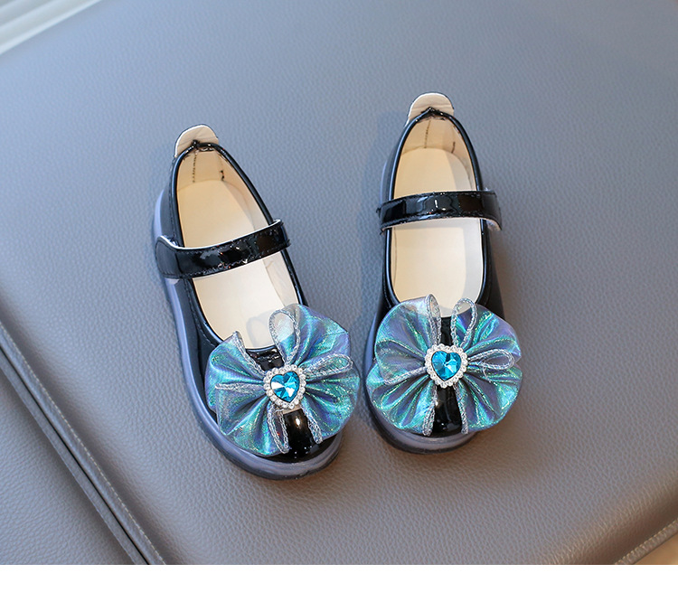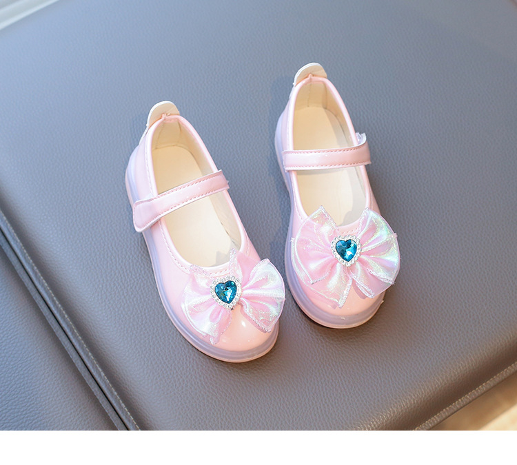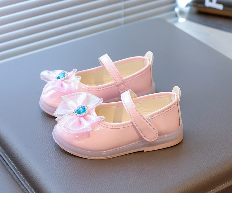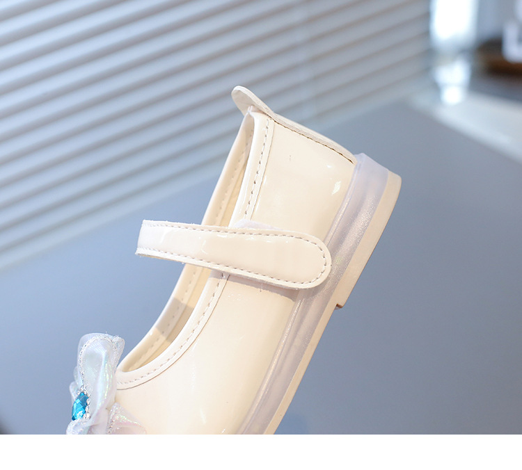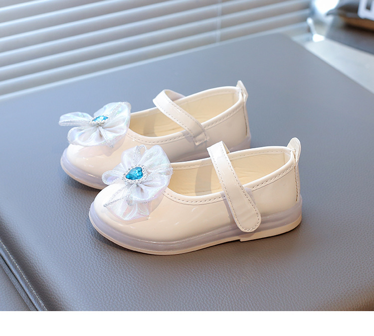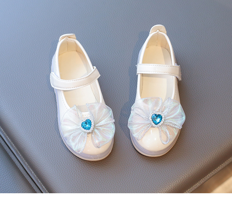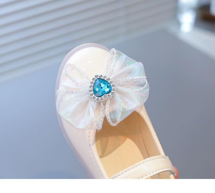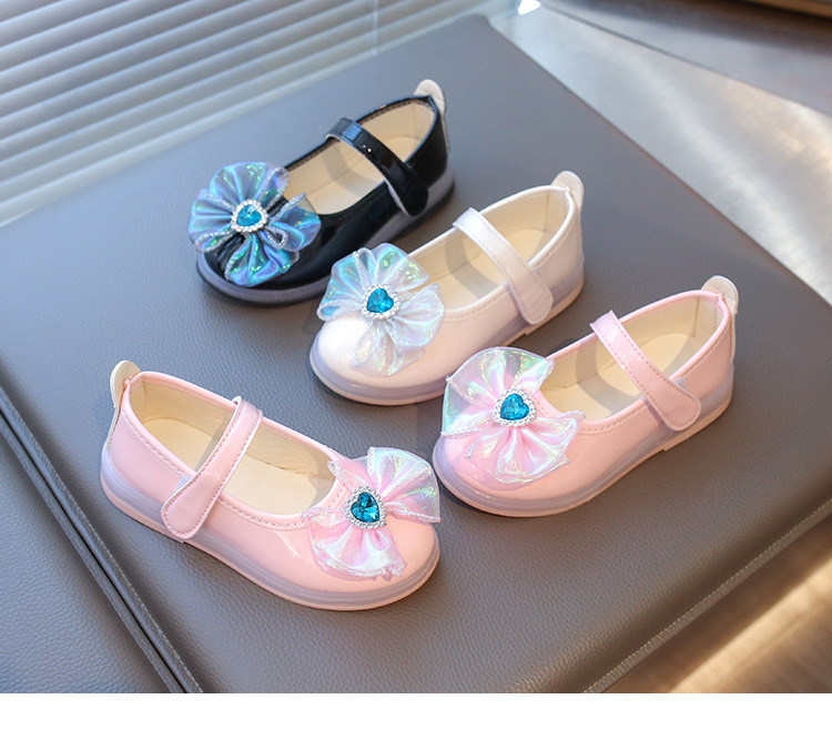 Zapatos de princesa de niñas 2025 primavera nuevo arco de diamante de arco parpadeante zapatos de cuero cuadrados de niña
