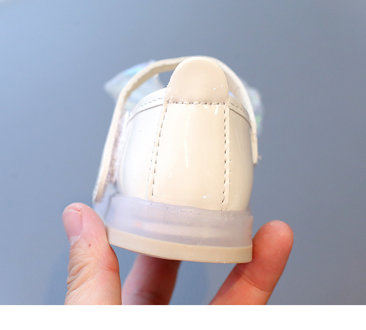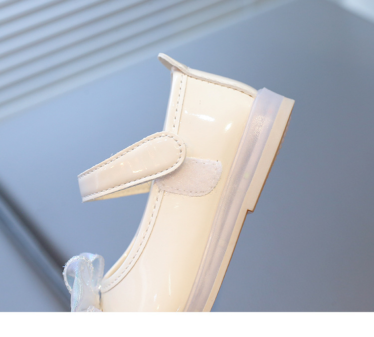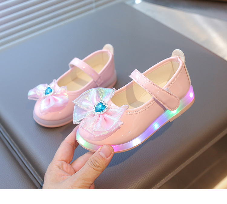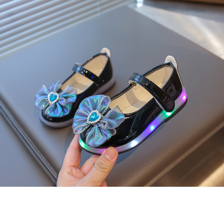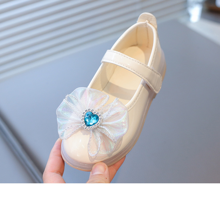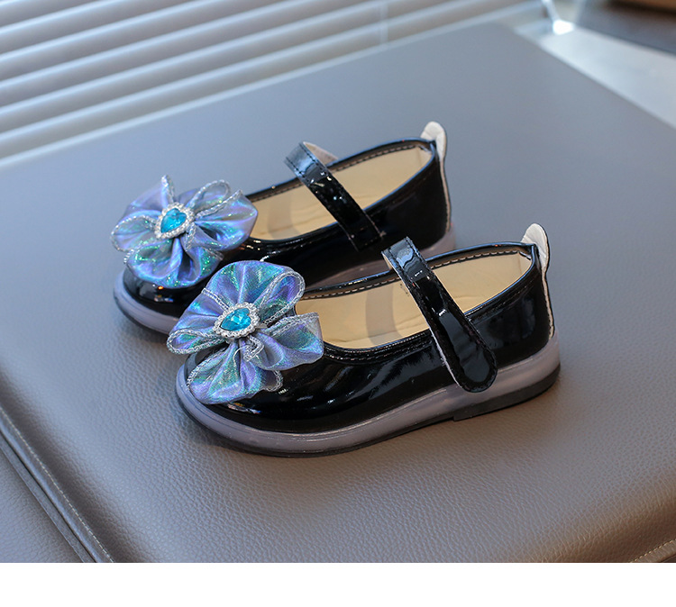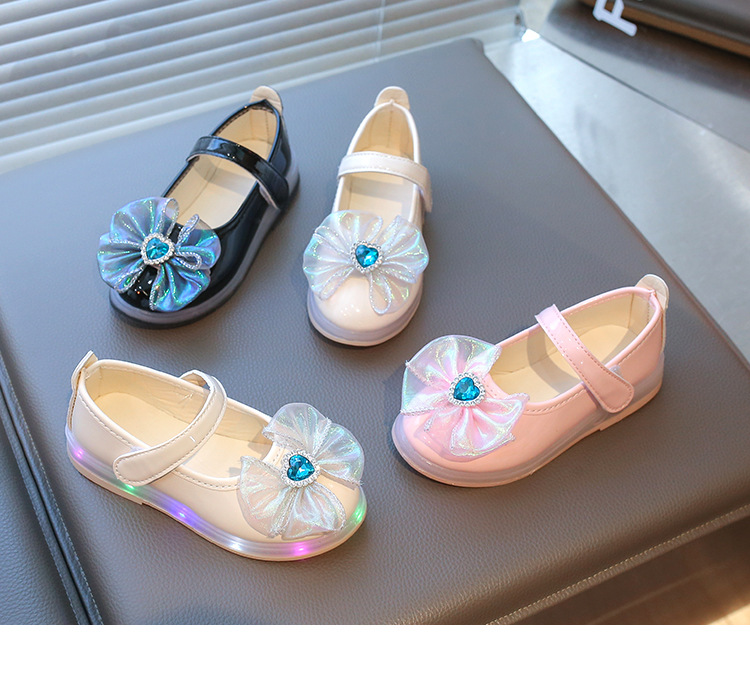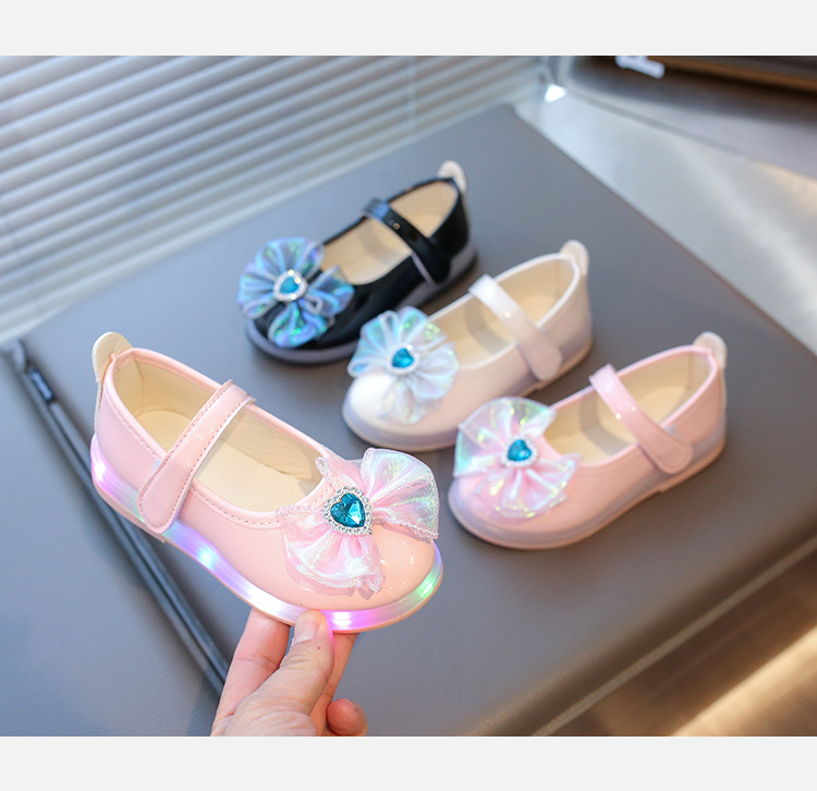 Zapatos de princesa de niñas 2025 primavera nuevo arco de diamante de arco parpadeante zapatos de cuero cuadrados de niña