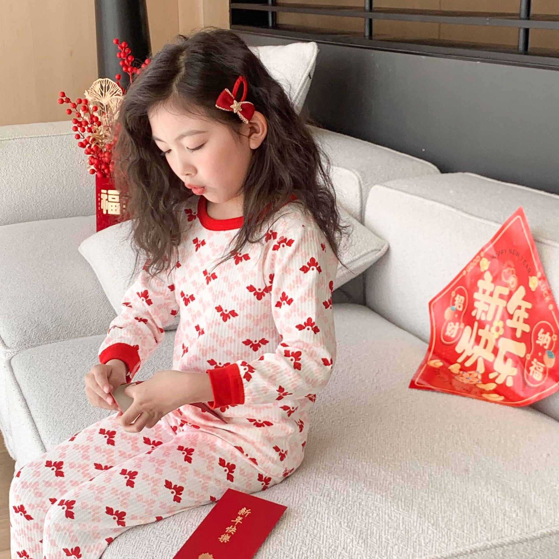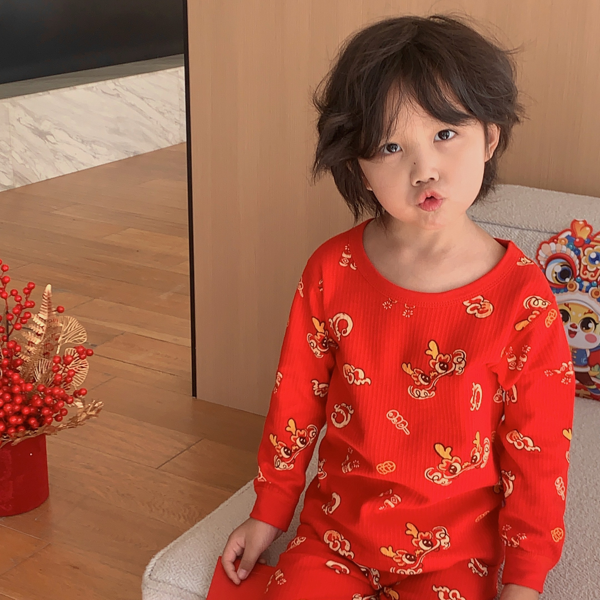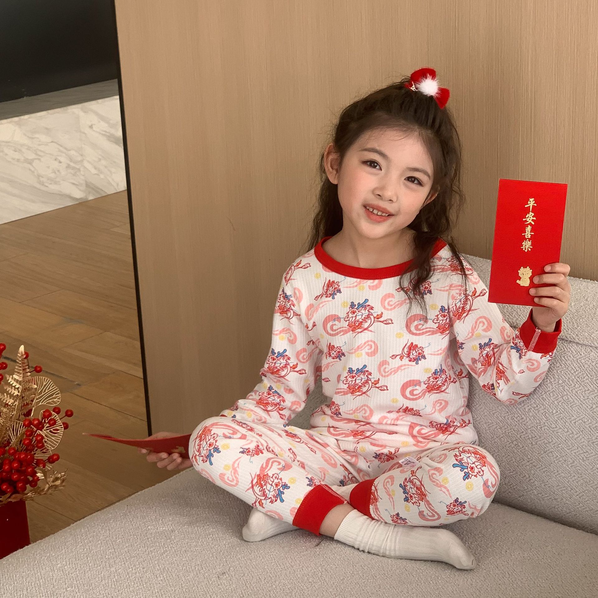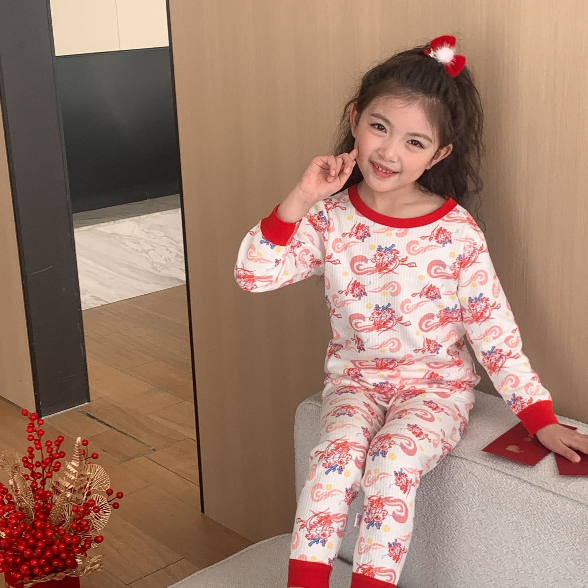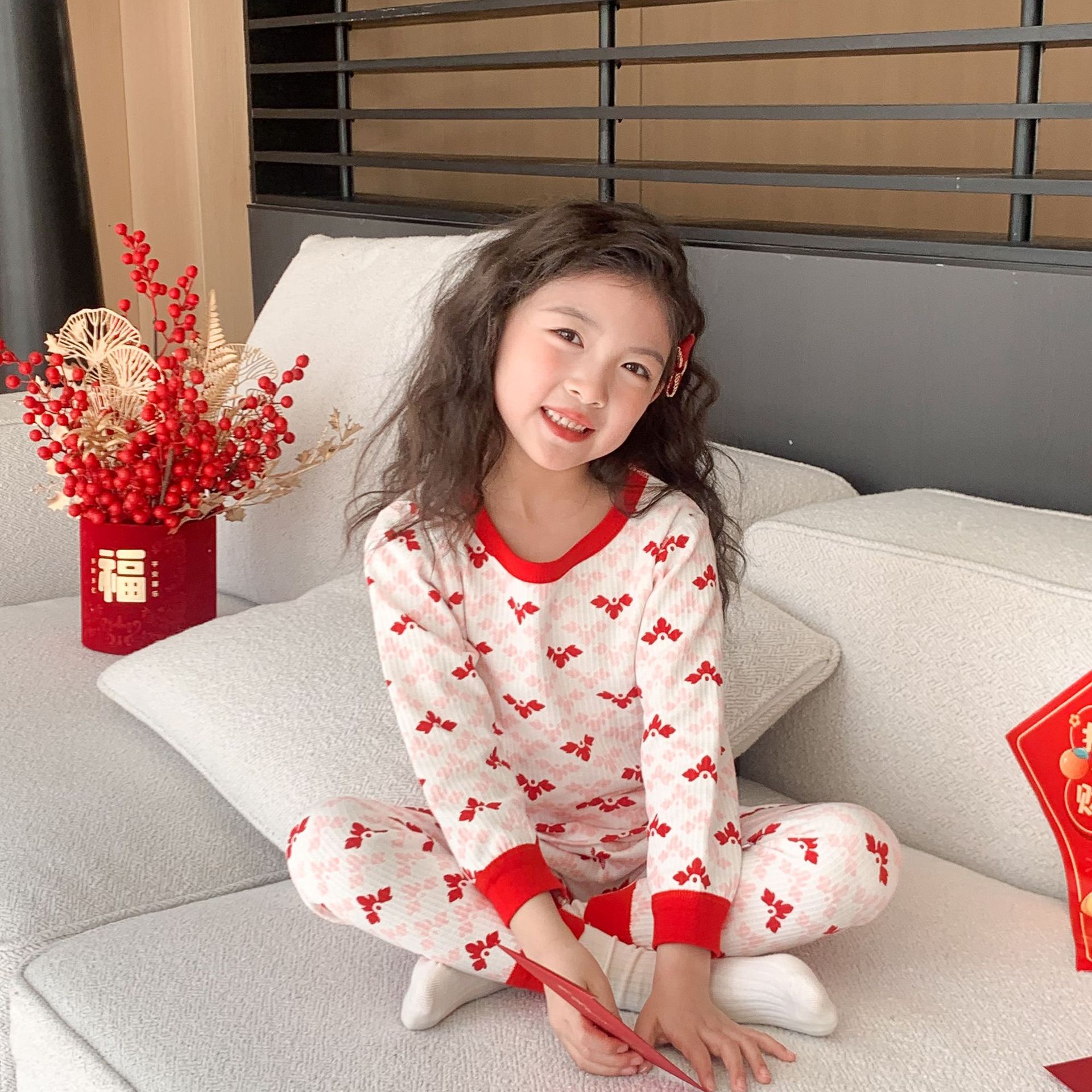 Conjunto de ropa interior de algodón para niños y niñas, ropa y pantalones rojos de otoño, versión engrosada para el año de nacimiento, pijamas y ropa de estar por casa.