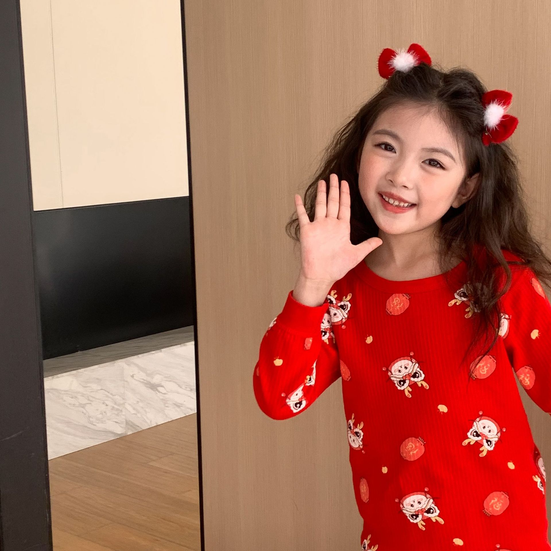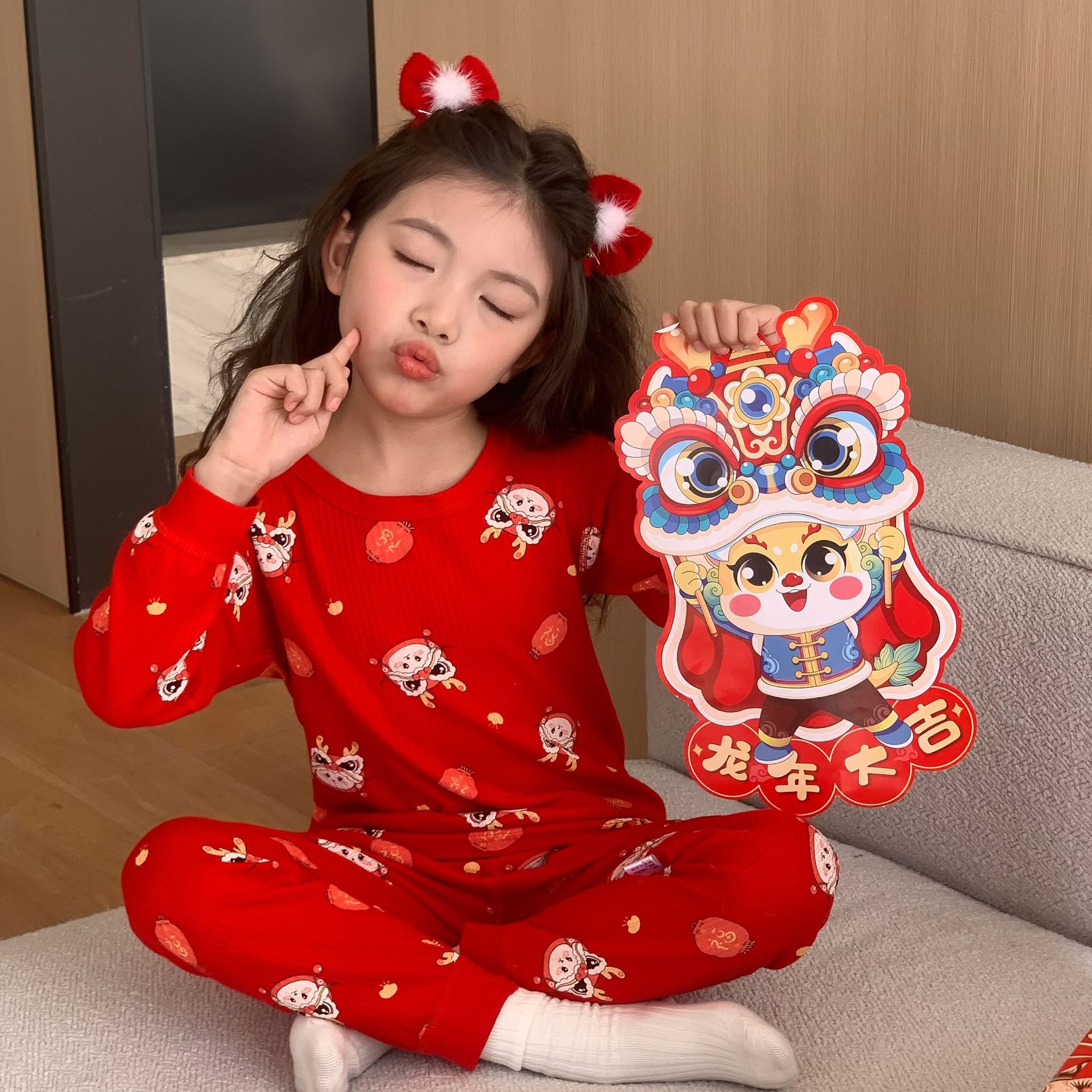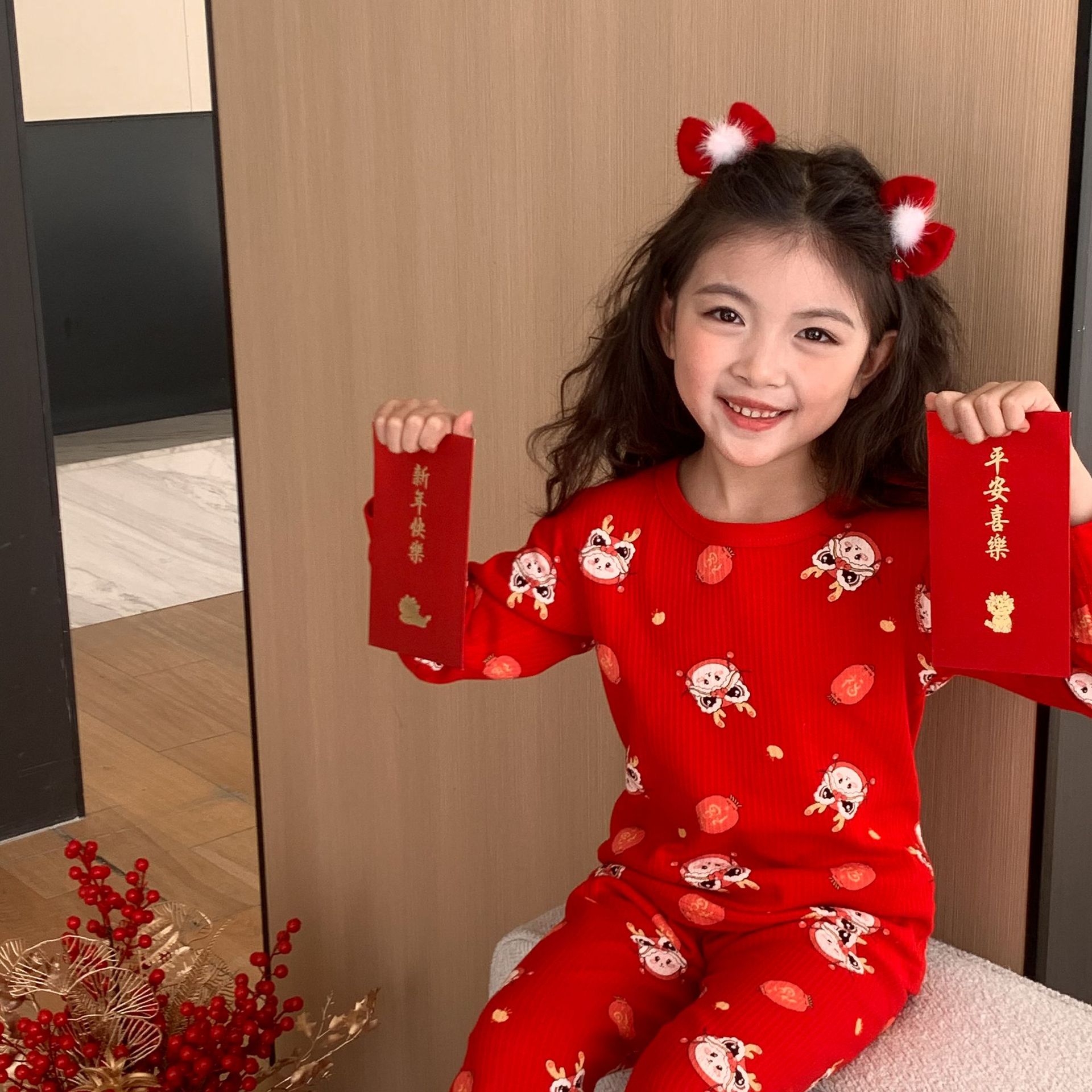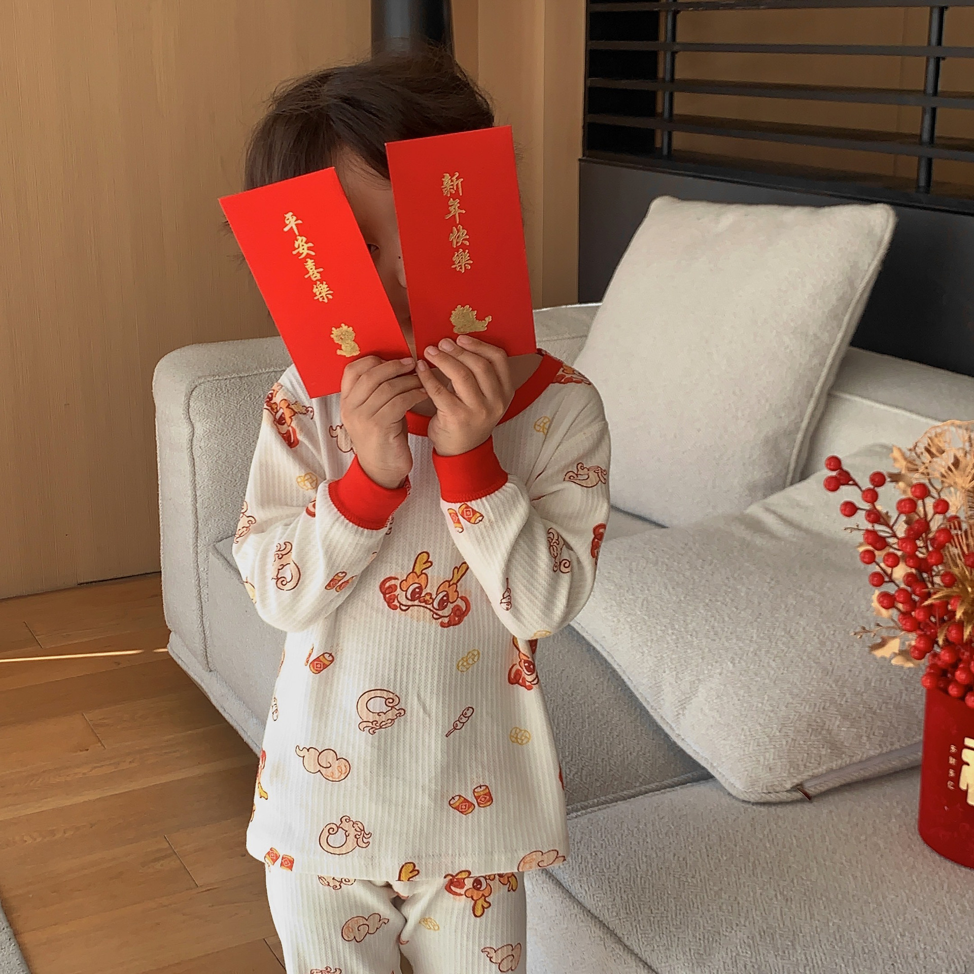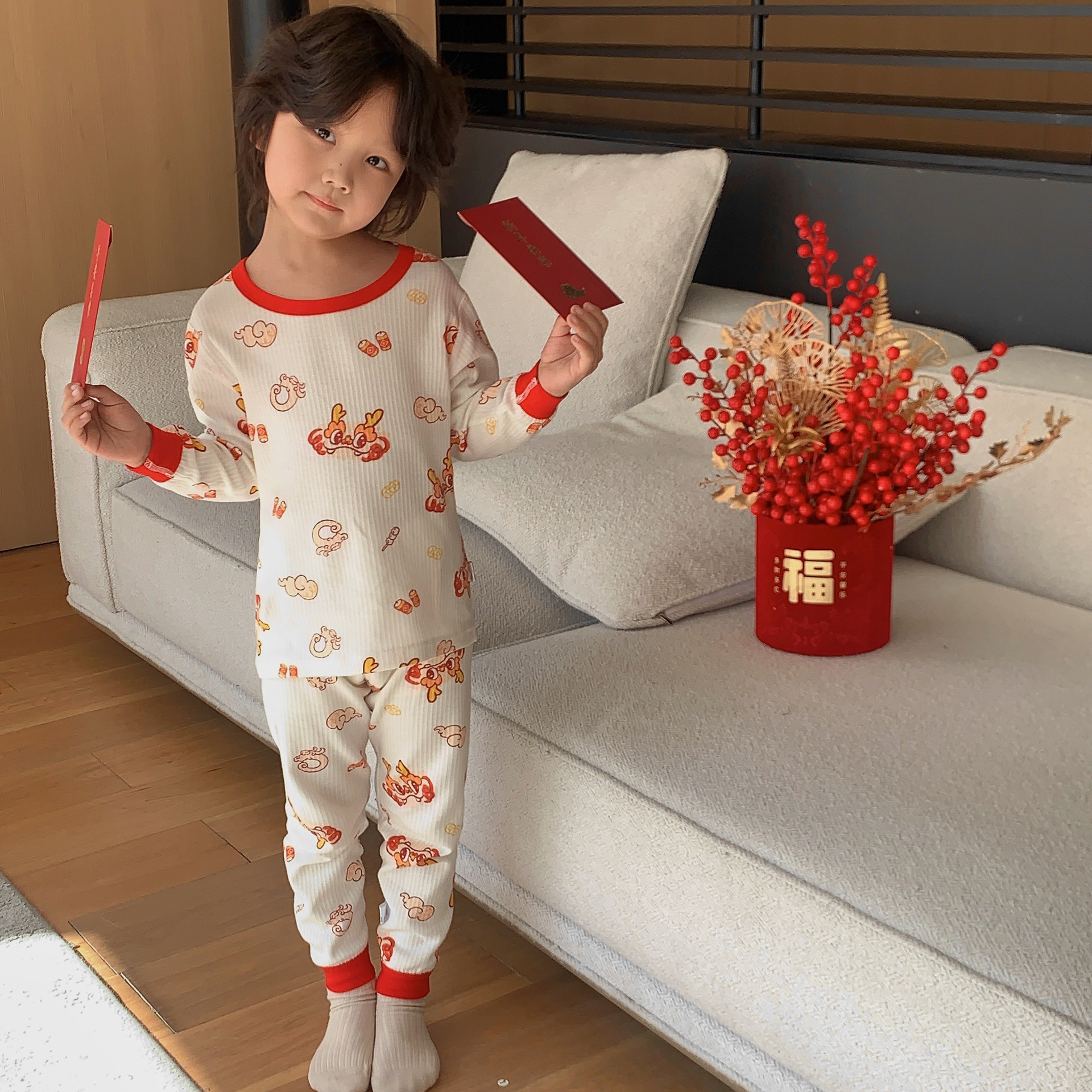 Conjunto de ropa interior de algodón para niños y niñas, ropa y pantalones rojos de otoño, versión engrosada para el año de nacimiento, pijamas y ropa de estar por casa.