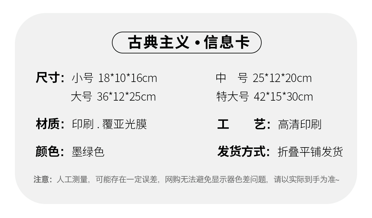 | Especificaciones y modelos | 古典主义 小号 18*10*16cm-1个,古典主义 小号 18*10*16cm-10个,古典主义 小号 18*10*16cm-50个,古典主义 中号 25*12*20cm-1个,古典主义 中号 25*12*20cm-10个,古典主义 中号 25*12*20cm-50个,古典主义 大号 36*12*25cm-1个,古典主义 大号 36*12*25cm-10个,古典主义 大号 36*12*25cm-50个,古典主义 加大号 42*15*30cm-1个,古典主义 加大号 42*15*30cm-10个,古典主义 加大号 42*15*30cm-50个,(新)兰语如梦-小号 18*10*16cm-1个,(新)兰语如梦-小号 18*10*16cm-10个,(新)兰语如梦-小号 18*10*16cm-50个,(新)兰语如梦-中号 25*12*20-1个,(新)兰语如梦-中号 25*12*20-10个,(新)兰语如梦-中号 25*12*20-50个,大理金沙 小号 18*10*16cm-1个,大理金沙 小号 18*10*16cm-10个,大理金沙 小号 18*10*16cm-50个,大理金沙 小号【空白处可印刷,贴纸,烫金】 18*10*16cm-1个,大理金沙 小号【空白处可印刷,贴纸,烫金】 18*10*16cm-10个,大理金沙 小号【空白处可印刷,贴纸,烫金】 18*10*16cm-50个,大理金沙 中号 25*12*20cm-1个,大理金沙 中号 25*12*20cm-10个,大理金沙 中号 25*12*20cm-50个,大理金沙 大号 36*12*25cm-1个,大理金沙 大号 36*12*25cm-10个,大理金沙 大号 36*12*25cm-50个,璀璨蝶影 小号 18*10*16cm-1个,璀璨蝶影 小号 18*10*16cm-10个,璀璨蝶影 小号 18*10*16cm-50个,璀璨蝶影 中号 25*12*20cm-1个,璀璨蝶影 中号 25*12*20cm-10个,璀璨蝶影 中号 25*12*20cm-50个,璀璨蝶影 大号 36*12*25cm-1个,璀璨蝶影 大号 36*12*25cm-10个,璀璨蝶影 大号 36*12*25cm-50个,璀璨蝶影 特大 42*15*30cm-1个,璀璨蝶影 特大 42*15*30cm-10个,璀璨蝶影 特大 42*15*30cm-50个,春晓拂花 小号 18*10*16cm-1个,春晓拂花 小号 18*10*16cm-10个,春晓拂花 小号 18*10*16cm-50个,春晓拂花 中号 25*12*20cm-1个,春晓拂花 中号 25*12*20cm-10个,春晓拂花 中号 25*12*20cm-50个,春晓拂花 大号 36*12*25cm-1个,春晓拂花 大号 36*12*25cm-10个,春晓拂花 大号 36*12*25cm-50个,春晓拂花 加大号 42*15*30cm-1个,春晓拂花 加大号 42*15*30cm-10个,春晓拂花 加大号 42*15*30cm-50个,凤丹繁花 小号 18*10*16cm-1个,凤丹繁花 小号 18*10*16cm-10个,凤丹繁花 小号 18*10*16cm-50个,凤丹繁花 中号 25*12*20cm-1个,凤丹繁花 中号 25*12*20cm-10个,凤丹繁花 中号 25*12*20cm-50个,凤丹繁花 大号 36*12*25cm-1个,凤丹繁花 大号 36*12*25cm-10个,凤丹繁花 大号 36*12*25cm-50个,凤丹繁花 加大号 42*15*30cm-1个,凤丹繁花 加大号 42*15*30cm-10个,凤丹繁花 加大号 42*15*30cm-50个 |