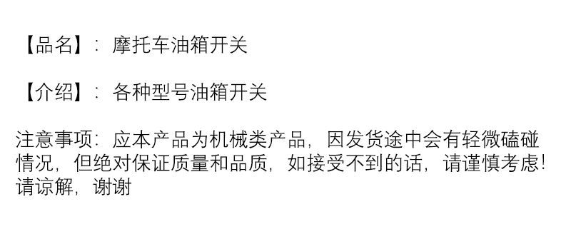 | Especificaciones | Interruptor/Unidad del aceite JH70,Interruptor/Unidad del depósito de combustible GS125,CG125 tanque de combustible interruptor/unidad,Interruptor/Unidad del tanque de combustible WY125,Interruptor/Unidad del depósito de combustible TH90,Interruptor/pieza del tanque de combustible Tianji 125,Interruptor/pieza del tanque de combustible de Tianjian 125,Guangyang 125 tanque de combustible interruptor/unidad,Interruptor del tanque de combustible GT125,Neptuno interruptor/Unidad del depósito de combustible,Interruptor del tanque de combustible F8 C8 E8,Saichi Guangyang 50 interruptor del tanque de combustible/pieza |