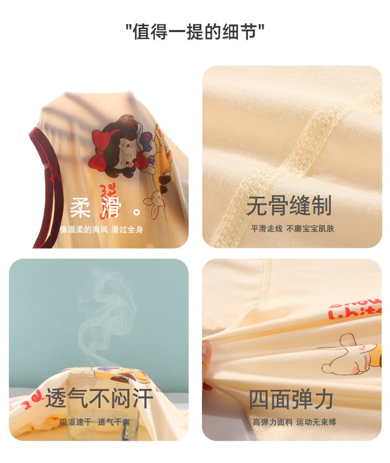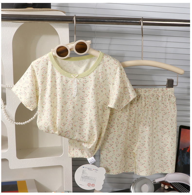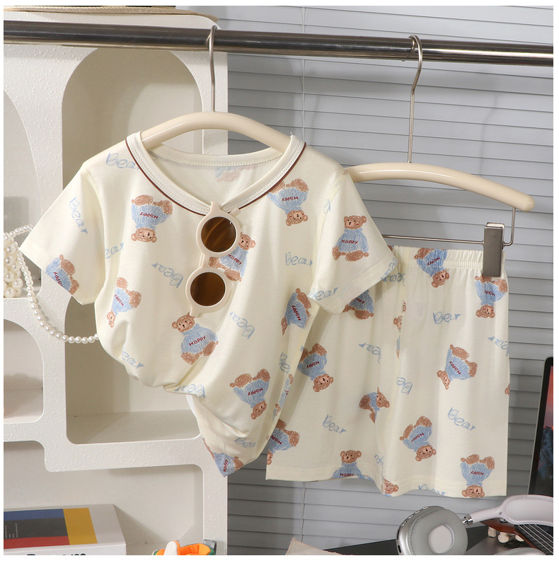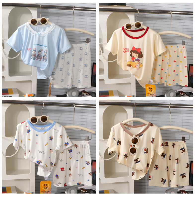 Conjunto de verano de pantalones cortos de manga corta de lyocell para niños y niñas, ropa de dibujos animados con efecto refrescante para niñas.