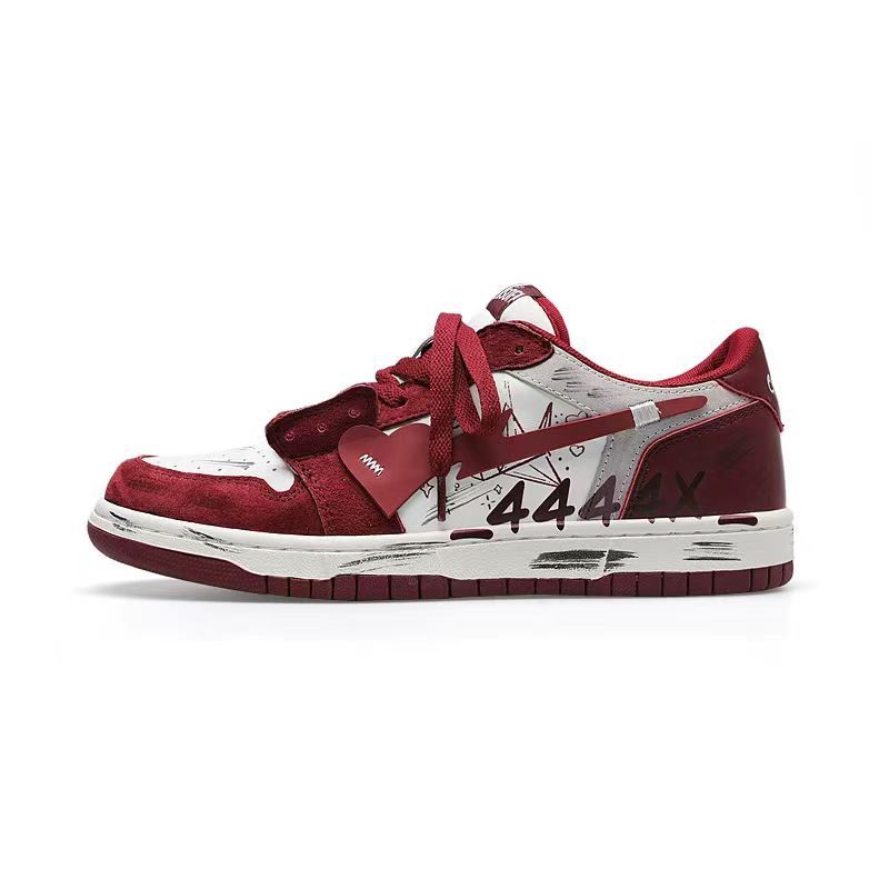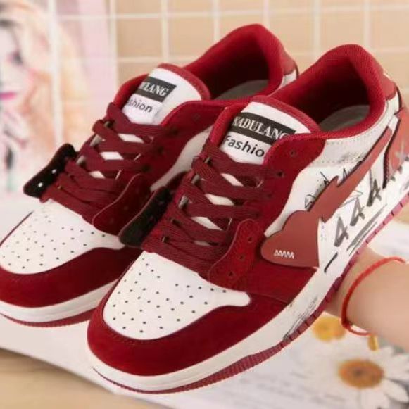 Retro rojo graffiti hacer viejos nichos de chicas corazón skateboardería en la escuela de viento de otoño con zapatos deportivos de lana para estudiantes