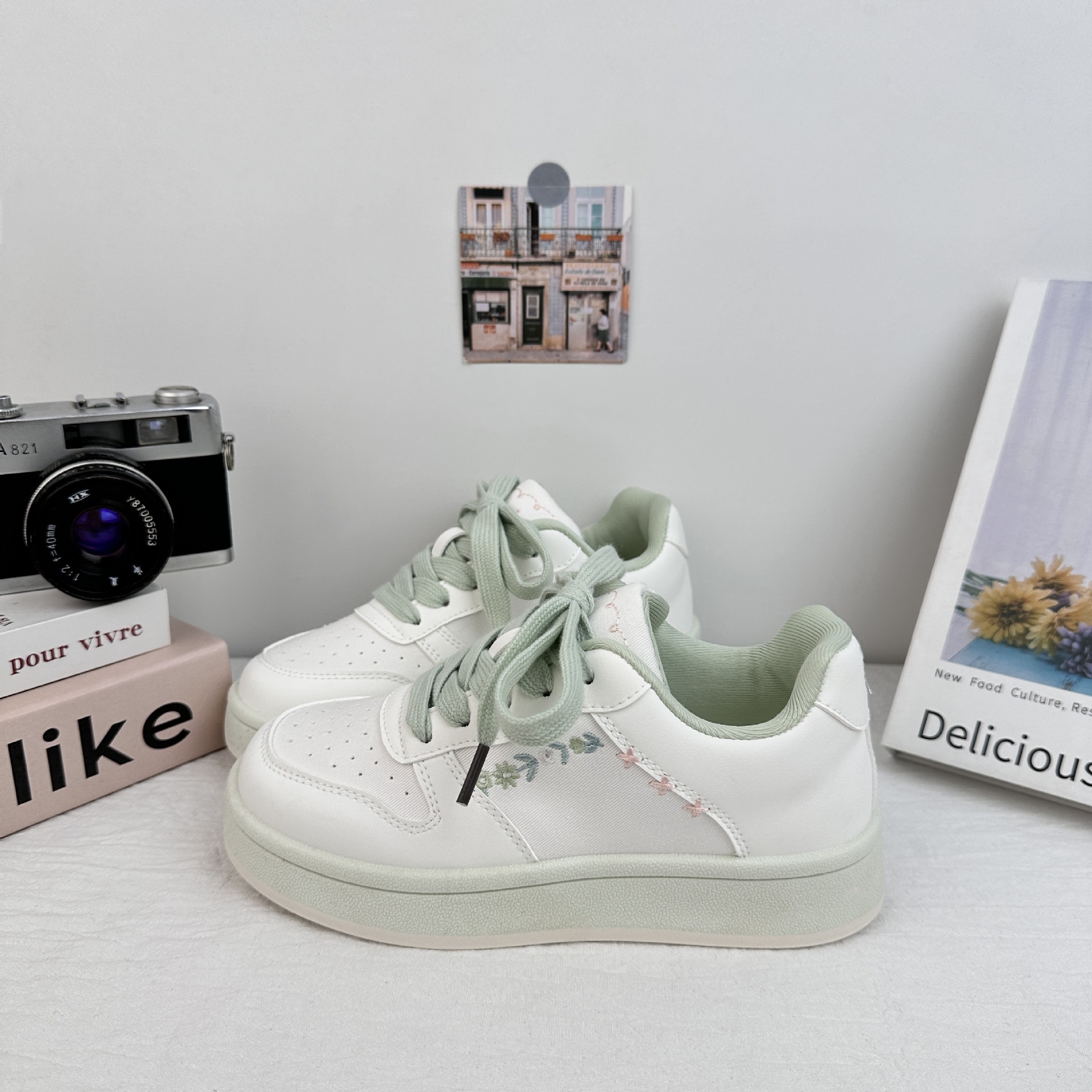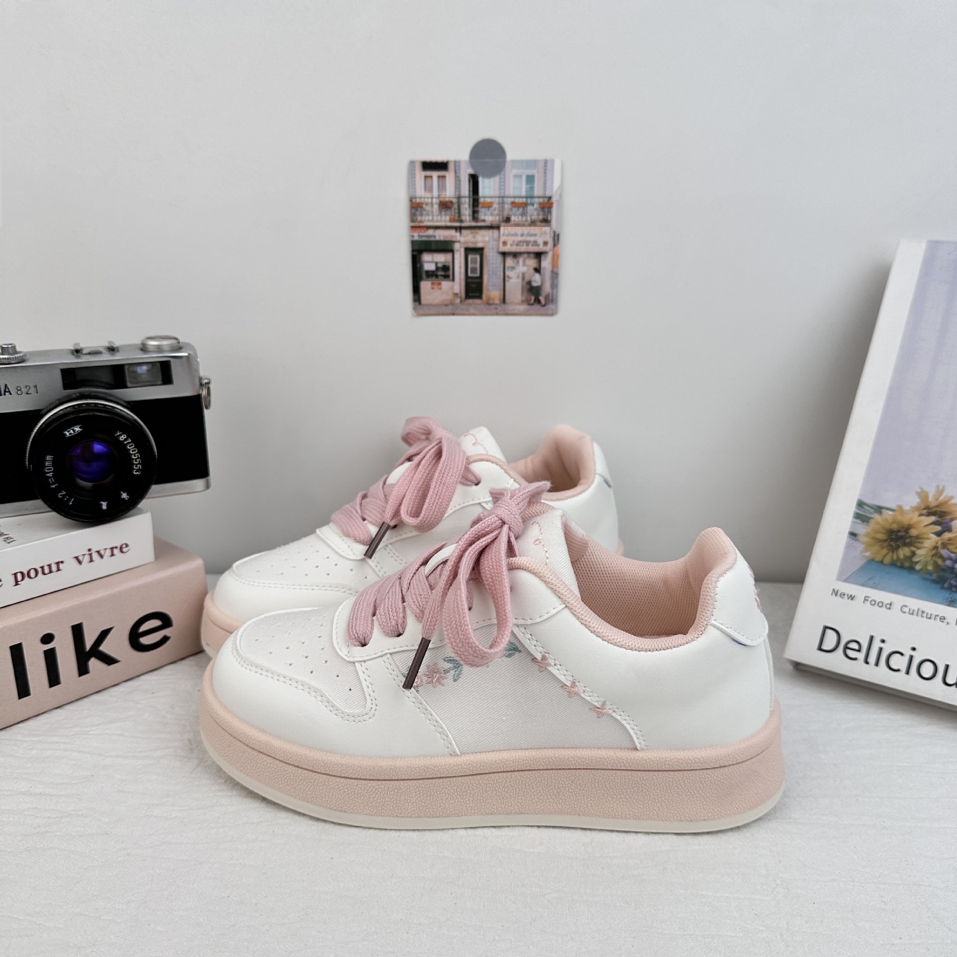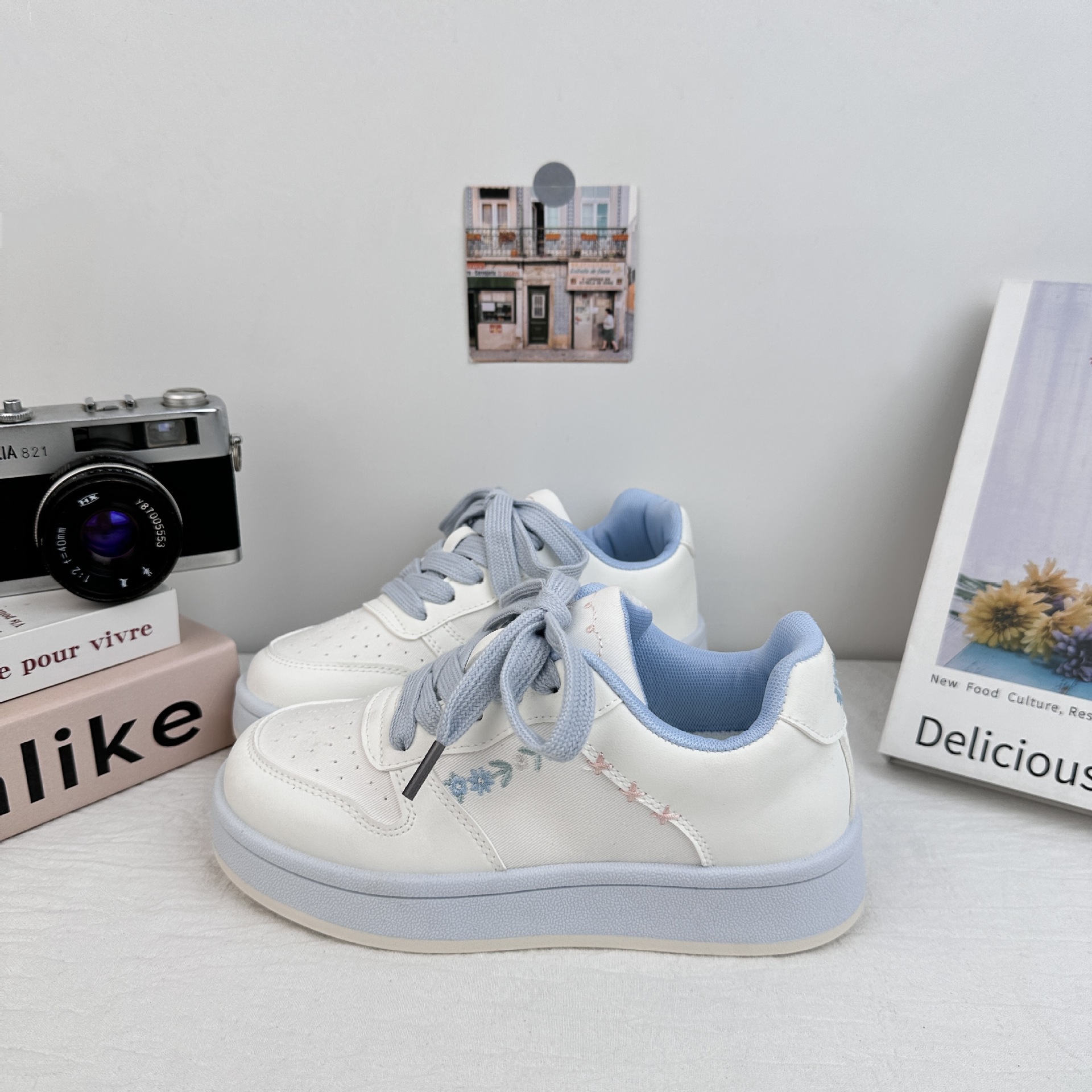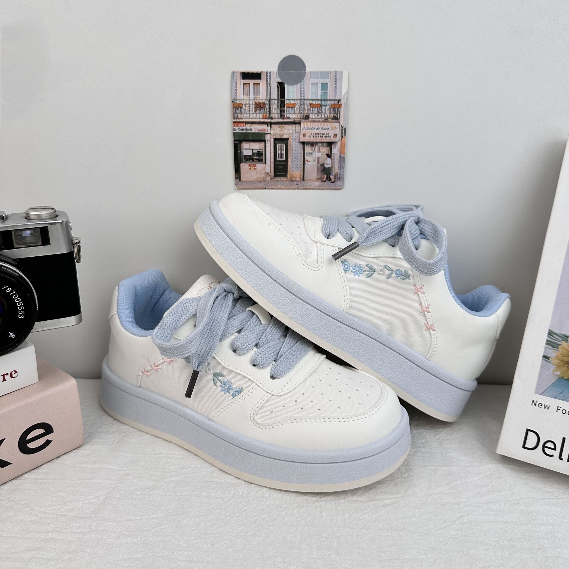 Zapatos de patinaje casuales de ondas distantes para mujeres 2025 verano pequeños zapatos blancos bordados frescos versátiles con suela gruesa aumentando el cabello de zapatos de pan