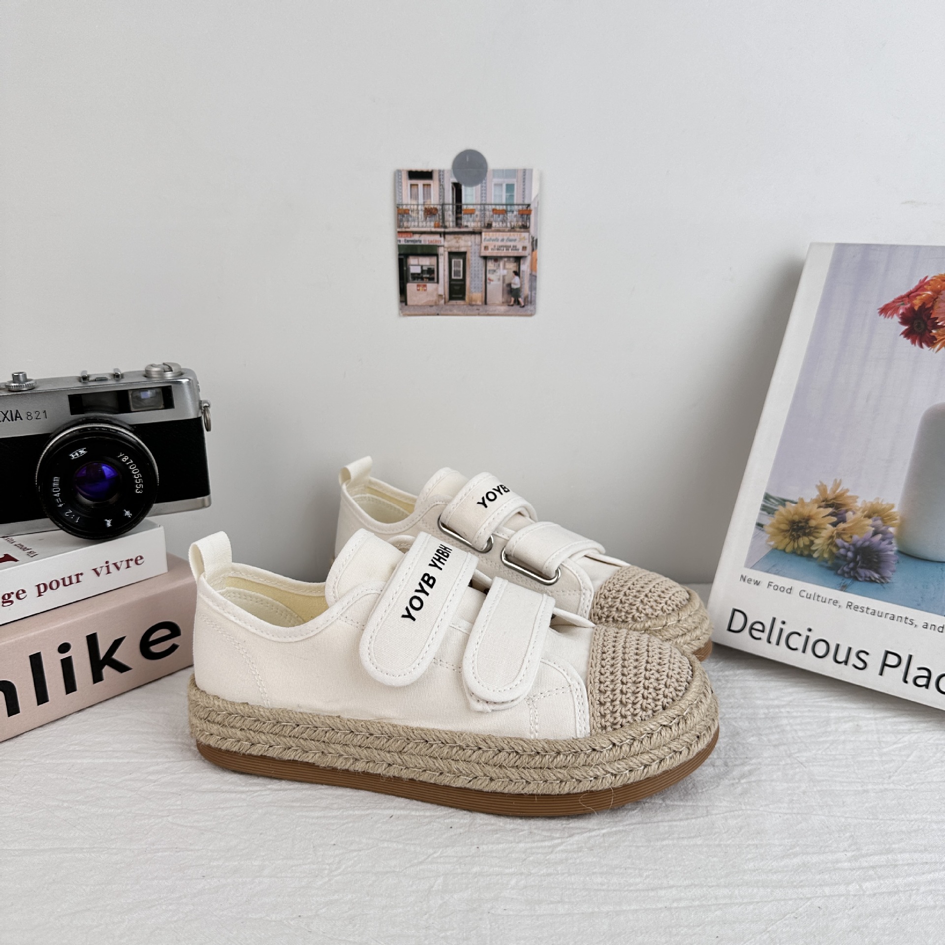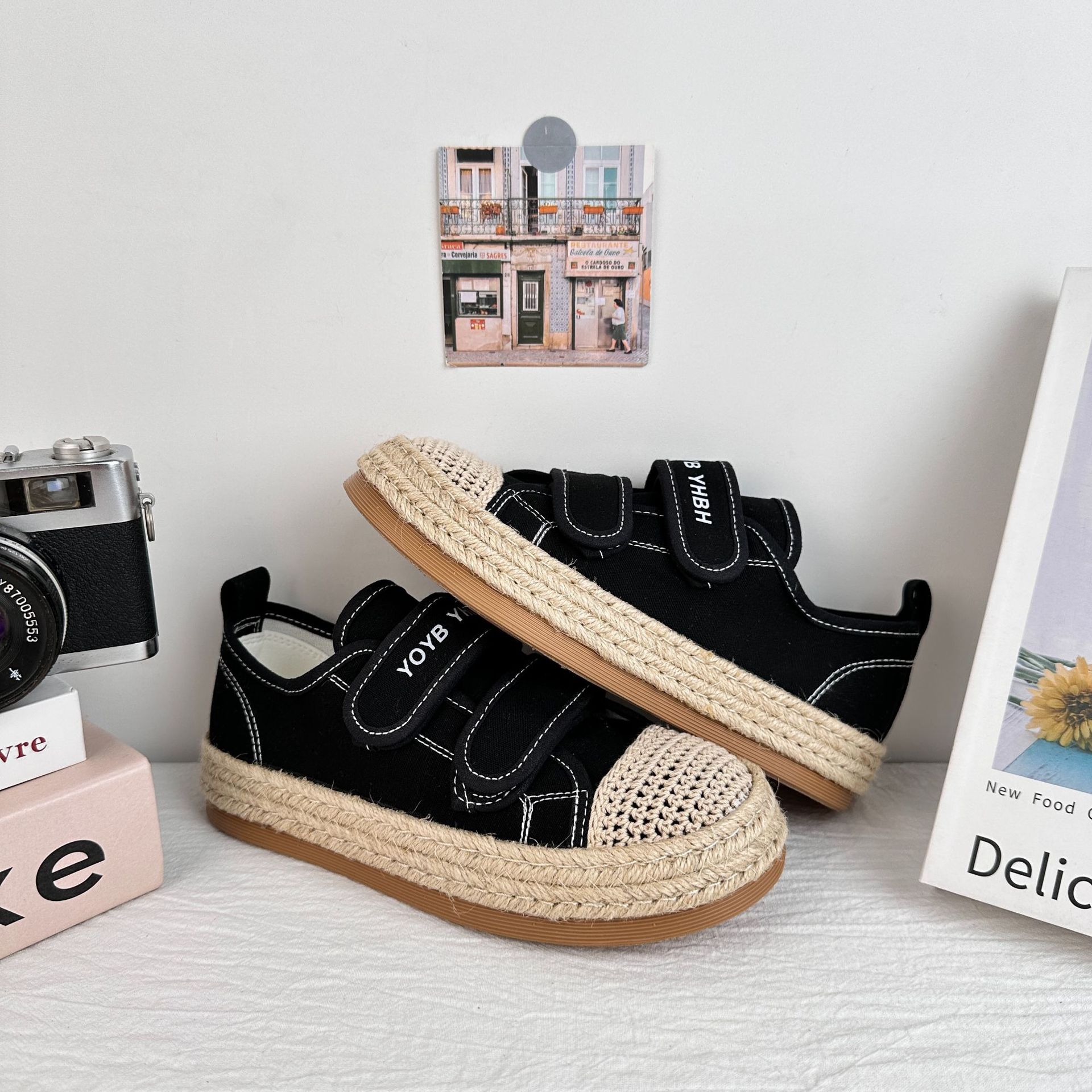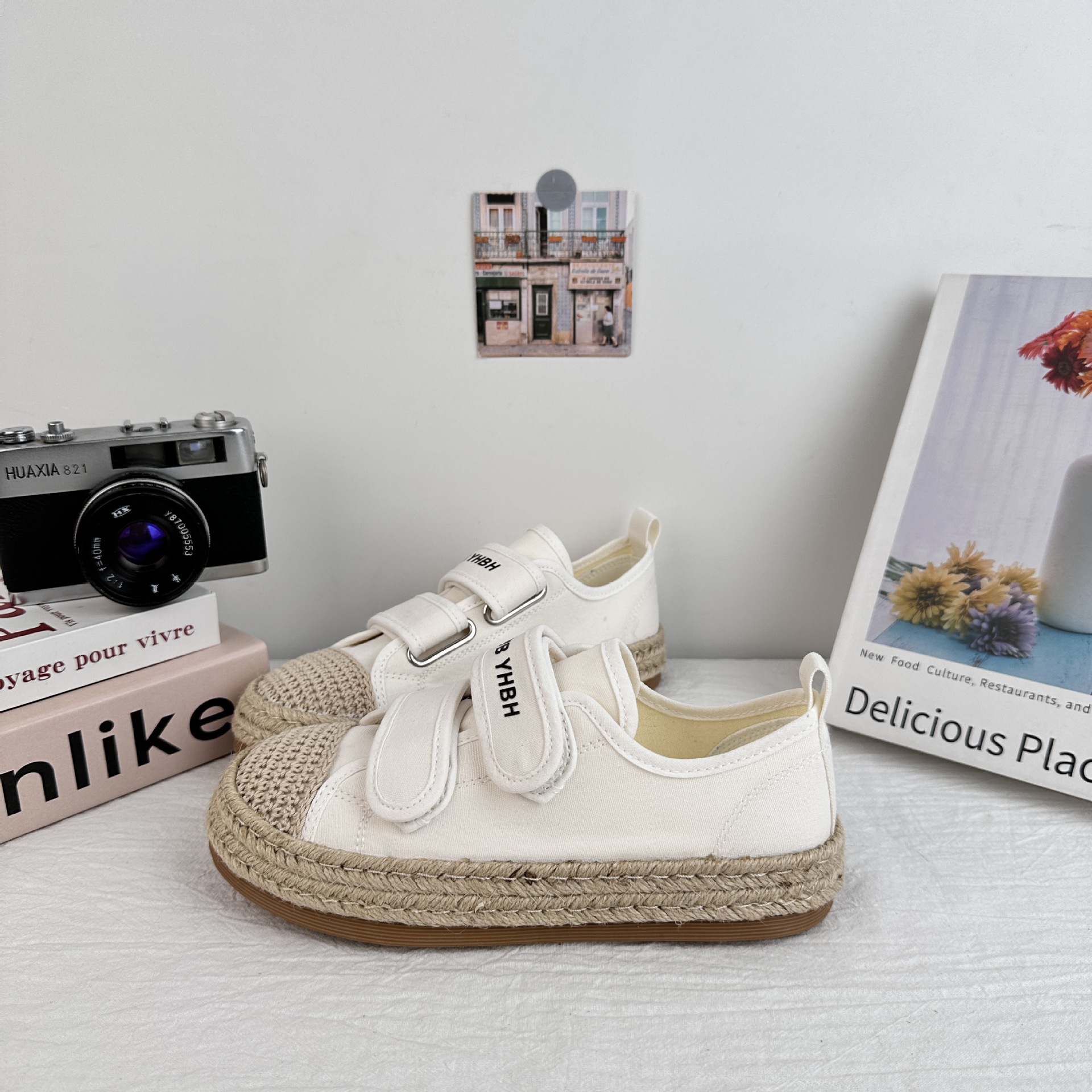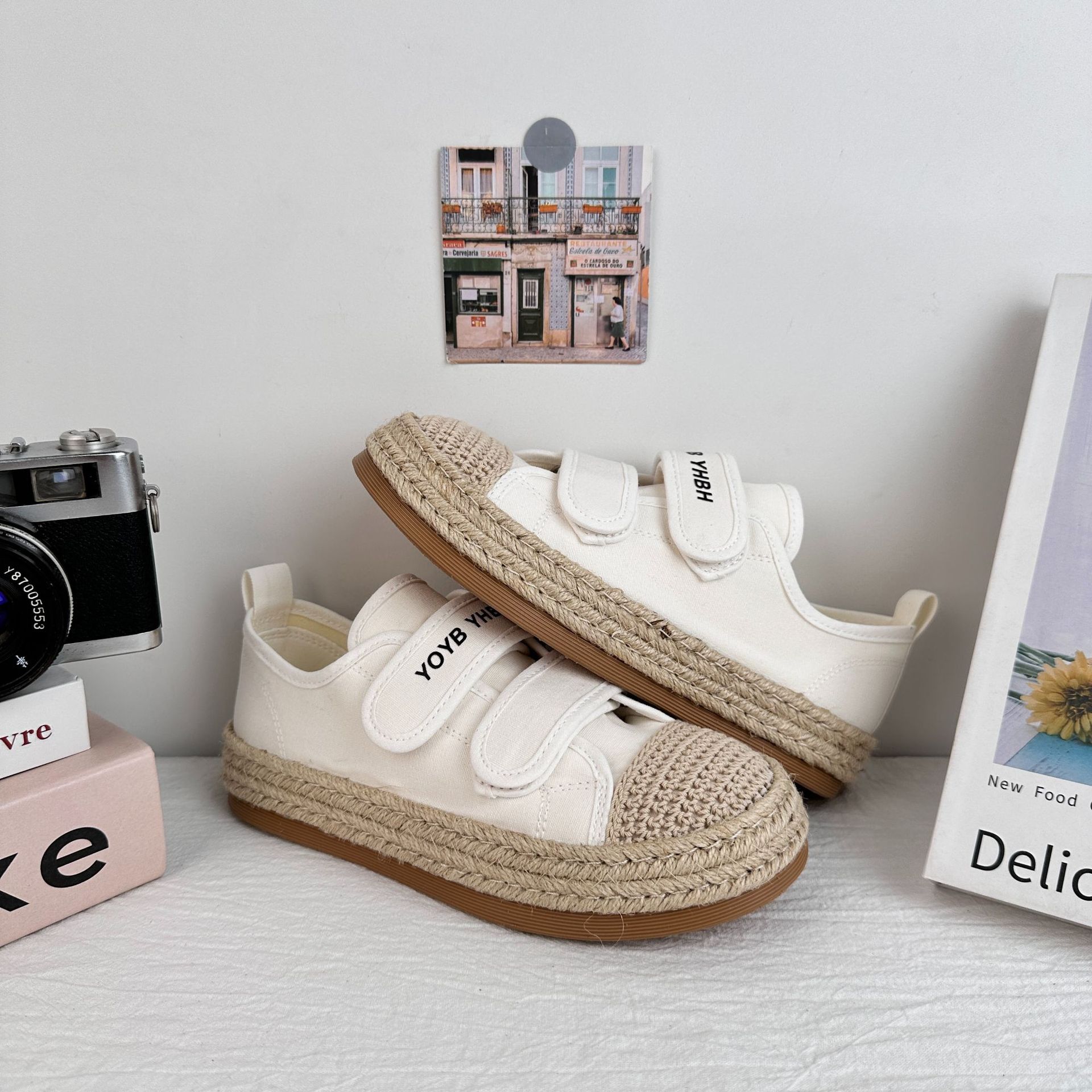 Zapatos de pescador de onda lejana para mujer, nuevas zapatillas de velcro de verano 2025, zapatos casuales de paja de todo fósforo, zapatos blancos pequeños