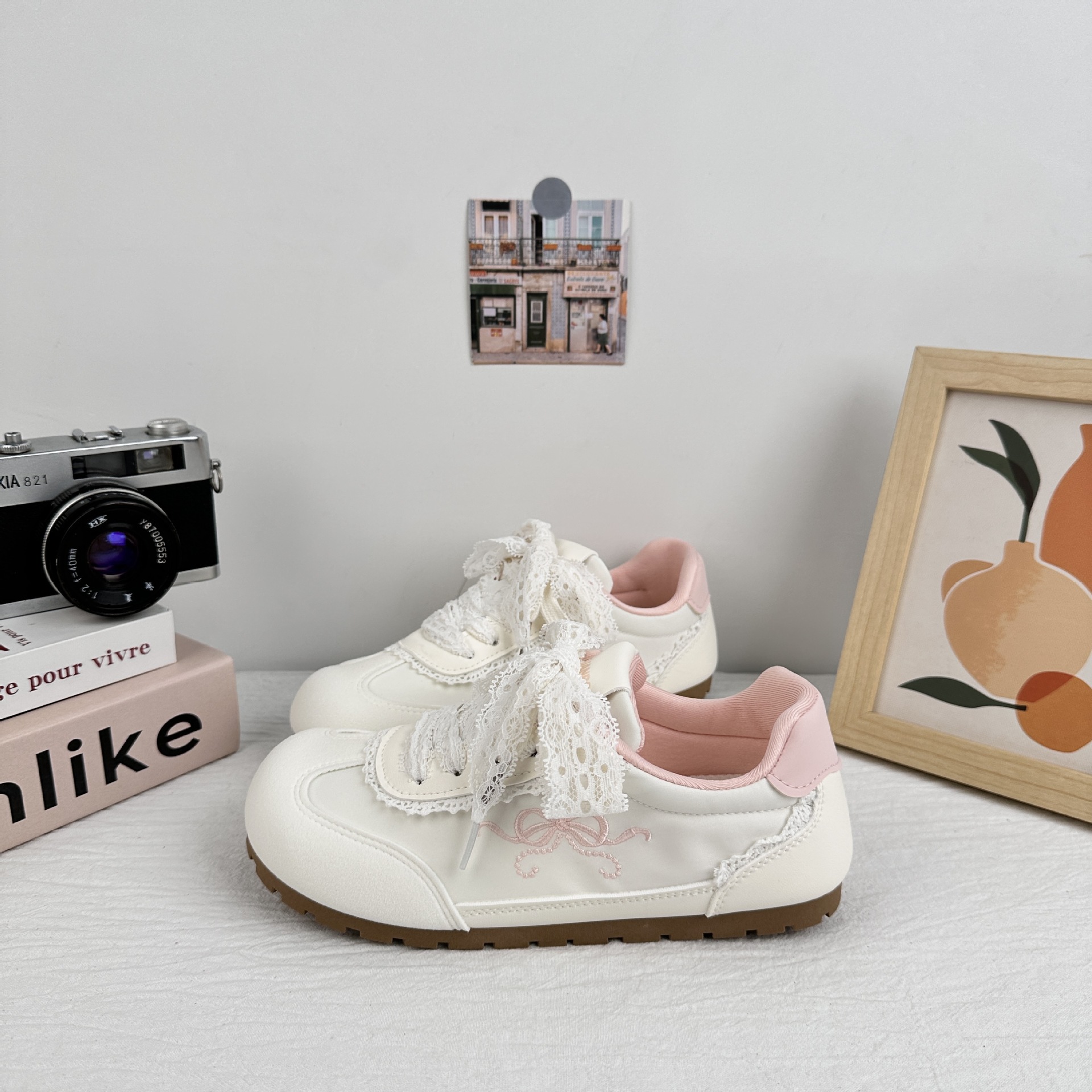 Zapatos blancos de ondas distantes de 2025 mujeres de verano ballet de encaje de zapatos de entrenamiento de estilo alemán, zapatos de skate casuales de nicho