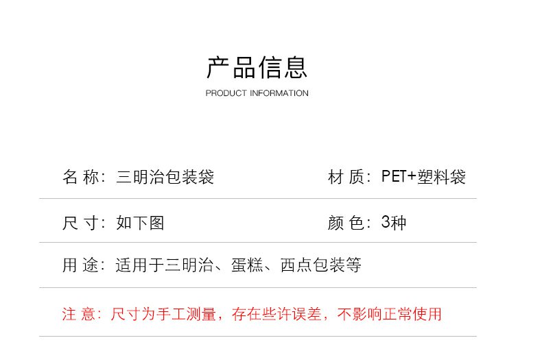 | Especificaciones y modelos | 【款】全透明三角包装底托【没包装袋】 【加厚加固底托】-100个【特惠价】,【款】全透明三角包装底托【没包装袋】 【加厚加固底托】-200个【特惠价】,【款】65#全透明包装袋【袋口6.5cm】 【没搭配内托】-100个【特惠价】,【款】65#全透明包装袋【袋口6.5cm】 【没搭配内托】-200个【特惠价】,【款】123#新橙色包装袋【袋口6.5cm】 【没搭配内托】-100个【特惠价】,【款】123#新橙色包装袋【袋口6.5cm】 【没搭配内托】-200个【特惠价】,【款】123#新绿色包装袋【袋口6.5cm】 【没搭配内托】-100个【特惠价】,【款】123#新绿色包装袋【袋口6.5cm】 【没搭配内托】-200个【特惠价】,【款】123#新蓝色包装袋【袋口6.5cm】 【没搭配内托】-100个【特惠价】,【款】123#新蓝色包装袋【袋口6.5cm】 【没搭配内托】-200个【特惠价】,【款】133#星期红包装袋【袋口6.5cm】 【没搭配内托】-100个【特惠价】,【款】133#星期红包装袋【袋口6.5cm】 【没搭配内托】-200个【特惠价】,【款】133#星期绿包装袋【袋口6.5cm】 【没搭配内托】-100个【特惠价】,【款】133#星期绿包装袋【袋口6.5cm】 【没搭配内托】-200个【特惠价】,【款】133#星期蓝包装袋【袋口6.5cm】 【没搭配内托】-100个【特惠价】,【款】133#星期蓝包装袋【袋口6.5cm】 【没搭配内托】-200个【特惠价】,星期1#包装袋【袋口6.5cm】 【没搭配内托】-100个【特惠价】,星期1#包装袋【袋口6.5cm】 【没搭配内托】-200个【特惠价】,星期2#包装袋【袋口6.5cm】 【没搭配内托】-100个【特惠价】,星期2#包装袋【袋口6.5cm】 【没搭配内托】-200个【特惠价】,星期3#包装袋【袋口6.5cm】 【没搭配内托】-100个【特惠价】,星期3#包装袋【袋口6.5cm】 【没搭配内托】-200个【特惠价】,星期4#包装袋【袋口6.5cm】 【没搭配内托】-100个【特惠价】,星期4#包装袋【袋口6.5cm】 【没搭配内托】-200个【特惠价】,星期5#包装袋【袋口6.5cm】 【没搭配内托】-100个【特惠价】,星期5#包装袋【袋口6.5cm】 【没搭配内托】-200个【特惠价】,星期6#包装袋【袋口6.5cm】 【没搭配内托】-100个【特惠价】,星期6#包装袋【袋口6.5cm】 【没搭配内托】-200个【特惠价】,星期7#包装袋【袋口6.5cm】 【没搭配内托】-100个【特惠价】,星期7#包装袋【袋口6.5cm】 【没搭配内托】-200个【特惠价】,白色三明治纸盒【纸口6.5cm】 【加厚纸卡材质】-100个【特惠价】,白色三明治纸盒【纸口6.5cm】 【加厚纸卡材质】-200个【特惠价】,粉色三明治纸盒【纸口6.5cm】 【加厚纸卡材质】-100个【特惠价】,粉色三明治纸盒【纸口6.5cm】 【加厚纸卡材质】-200个【特惠价】,橙色三明治纸盒【纸口6.5cm】 【加厚纸卡材质】-100个【特惠价】,橙色三明治纸盒【纸口6.5cm】 【加厚纸卡材质】-200个【特惠价】,绿色三明治纸盒【纸口6.5cm】 【加厚纸卡材质】-100个【特惠价】,绿色三明治纸盒【纸口6.5cm】 【加厚纸卡材质】-200个【特惠价】,黄色怪兽三明治纸盒【纸口6.5cm】 【开窗镂空没透明膜】-100个【特惠价】,黄色怪兽三明治纸盒【纸口6.5cm】 【开窗镂空没透明膜】-200个【特惠价】,紫色怪兽三明治纸盒【纸口6.5cm】 【开窗镂空没透明膜】-100个【特惠价】,紫色怪兽三明治纸盒【纸口6.5cm】 【开窗镂空没透明膜】-200个【特惠价】,绿色怪兽三明治纸盒【纸口6.5cm】 【开窗镂空没透明膜】-100个【特惠价】,绿色怪兽三明治纸盒【纸口6.5cm】 【开窗镂空没透明膜】-200个【特惠价】,【款】65#全透明包装袋+全透明底托 【袋口6.5cm】-100个【特惠价】,【款】65#全透明包装袋+全透明底托 【袋口6.5cm】-200个【特惠价】,【款】123#新橙色包装袋+全透明底托 【袋口6.5cm】-100个【特惠价】,【款】123#新橙色包装袋+全透明底托 【袋口6.5cm】-200个【特惠价】,【款】123#新绿色包装袋+全透明底托 【袋口6.5cm】-100个【特惠价】,【款】123#新绿色包装袋+全透明底托 【袋口6.5cm】-200个【特惠价】,【款】123#新蓝色包装袋+全透明底托 【袋口6.5cm】-100个【特惠价】,【款】123#新蓝色包装袋+全透明底托 【袋口6.5cm】-200个【特惠价】,【款】133#星期红包装袋+全透明底托 【袋口6.5cm】-100个【特惠价】,【款】133#星期红包装袋+全透明底托 【袋口6.5cm】-200个【特惠价】,【款】133#星期绿包装袋+全透明底托 【袋口6.5cm】-100个【特惠价】,【款】133#星期绿包装袋+全透明底托 【袋口6.5cm】-200个【特惠价】,【款】133#星期蓝包装袋+全透明底托 【袋口6.5cm】-100个【特惠价】,【款】133#星期蓝包装袋+全透明底托 【袋口6.5cm】-200个【特惠价】,星期1#包装袋+全透明底托 【袋口6.5cm】-100个【特惠价】,星期1#包装袋+全透明底托 【袋口6.5cm】-200个【特惠价】,星期2#包装袋+全透明底托 【袋口6.5cm】-100个【特惠价】,星期2#包装袋+全透明底托 【袋口6.5cm】-200个【特惠价】,星期3#包装袋+全透明底托 【袋口6.5cm】-100个【特惠价】,星期3#包装袋+全透明底托 【袋口6.5cm】-200个【特惠价】,星期4#包装袋+全透明底托 【袋口6.5cm】-100个【特惠价】,星期4#包装袋+全透明底托 【袋口6.5cm】-200个【特惠价】,星期5#包装袋+全透明底托 【袋口6.5cm】-100个【特惠价】,星期5#包装袋+全透明底托 【袋口6.5cm】-200个【特惠价】,星期6#包装袋+全透明底托 【袋口6.5cm】-100个【特惠价】,星期6#包装袋+全透明底托 【