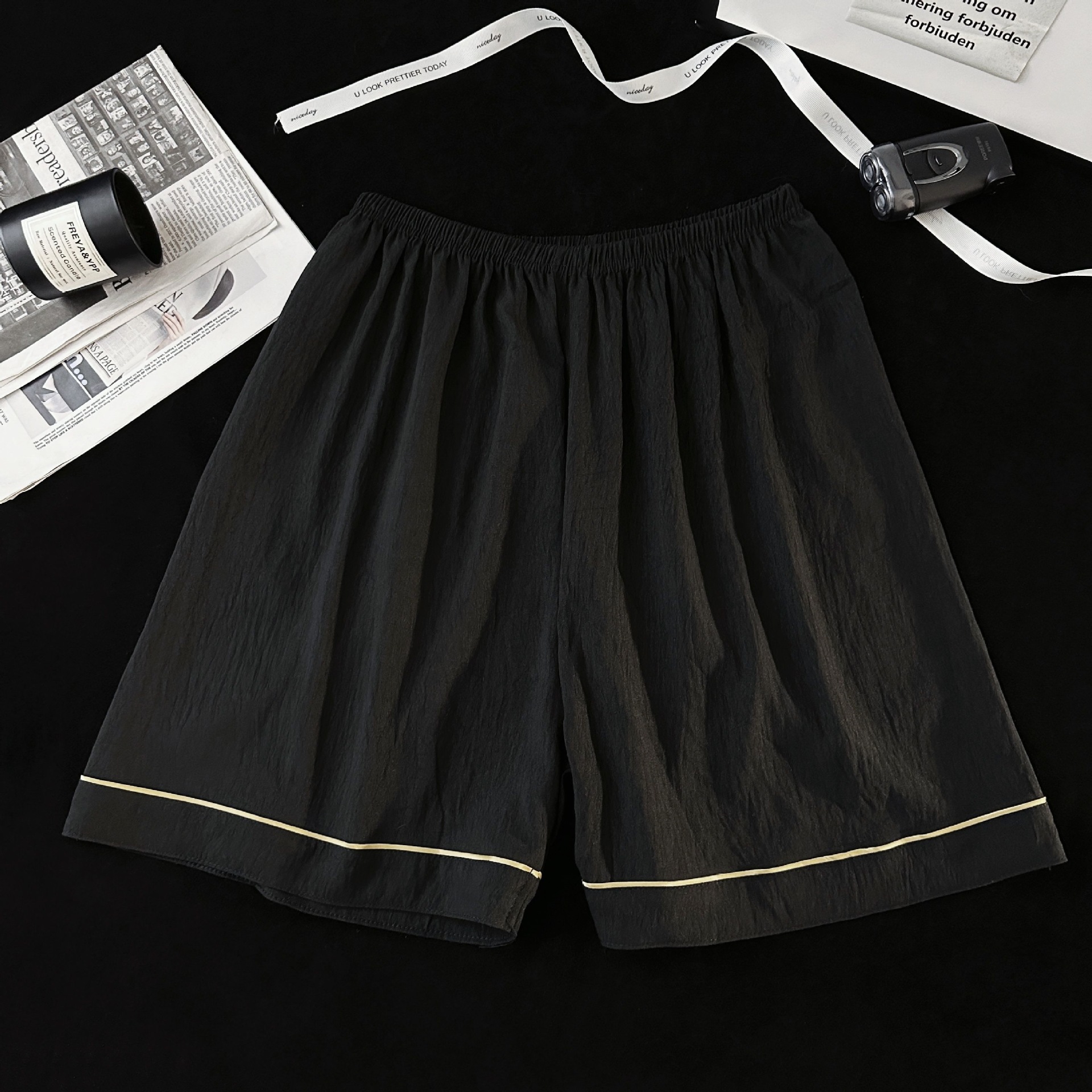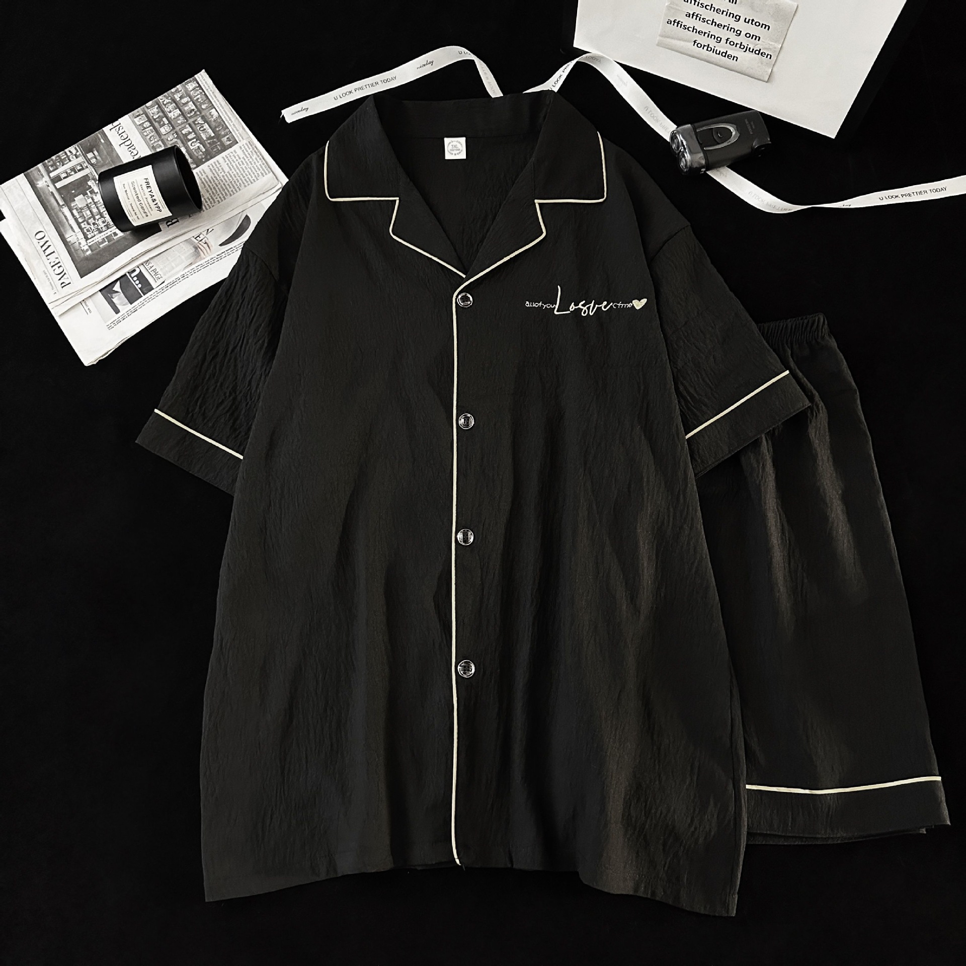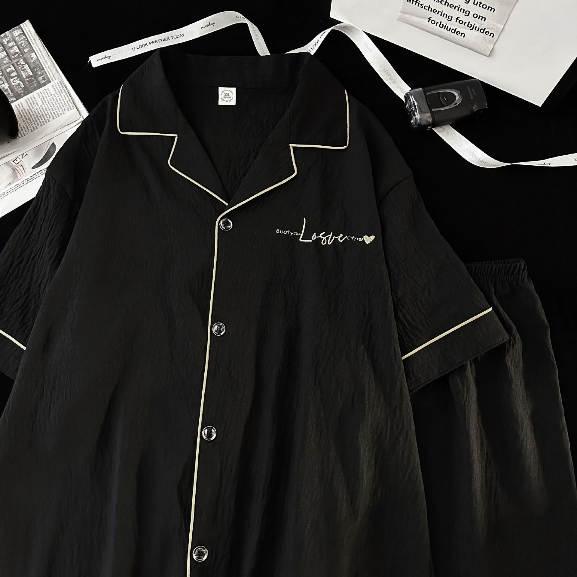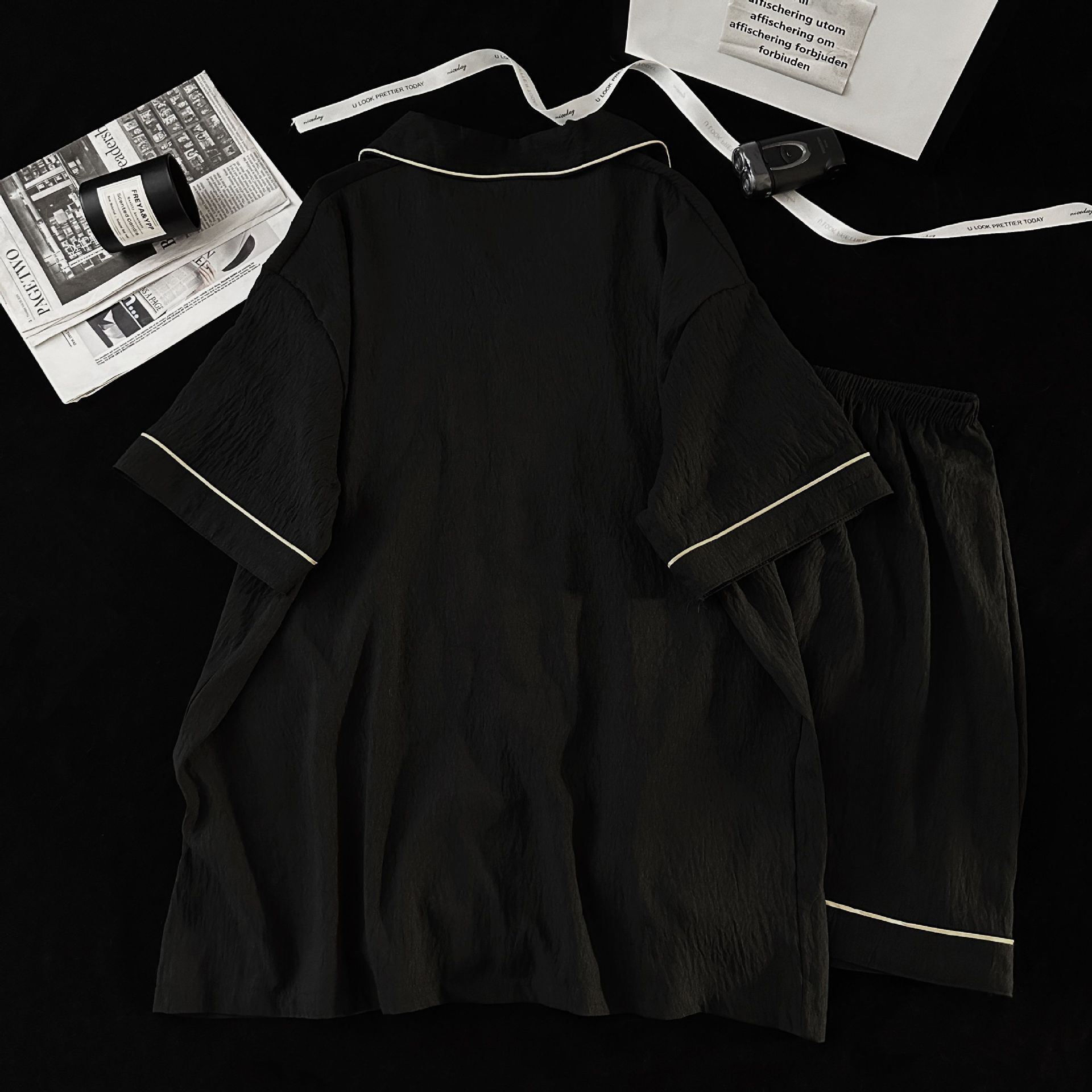 Pijamas de hombre de hilo de algodón de nube negra simple pantalones cortos de verano de manga corta ropa de hogar de gran tamaño casual traje de verano