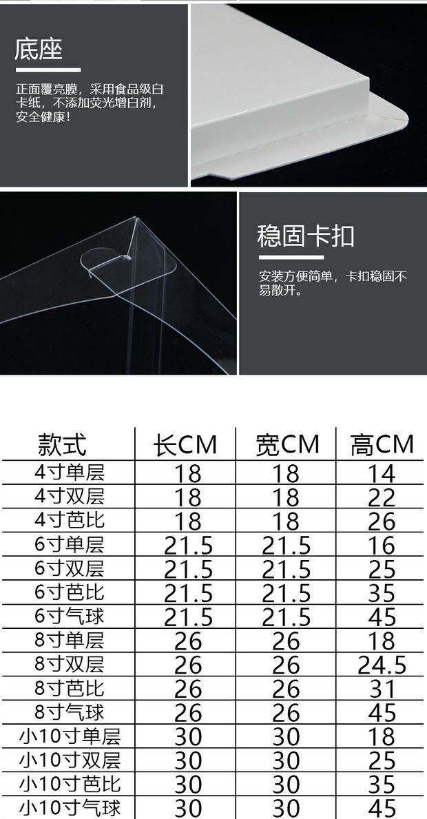 | Especificaciones y modelos | 透明盖白色底托-4寸单层(18*18*14CM)五套,透明盖白色底托-4寸双层(18*18*22CM)五套,透明盖白色底托-6寸单层(21.5*21.5*16CM)五套,透明盖白色底托-6寸双层(21.5*21.5*25CM)五套,透明盖白色底托-6寸芭比(21.5*21.5*31CM)五套,透明盖白色底托-6寸气球(21.5*21.5*45CM)五套,透明盖白色底托-8寸单层(26*26*18CM)五套,透明盖白色底托-8寸双层(26*26*24.5CM)五套,透明盖白色底托-8寸芭比(26*26*31CM)五套,透明盖白色底托-8寸气球(26*26*45CM)五套,透明盖白色底托-小10寸单层(30*30*18CM)五套,透明盖白色底托-小10寸双层(30*30*25CM)五套,透明盖白色底托-小10寸芭比(30*30*35CM)五套,透明盖白色底托-10寸单层(32*32*18CM)五套,透明盖白色底托-10寸双层(32*32*25CM)五套,透明盖白色底托-10寸芭比(32*32*35CM)五套,透明盖白色底托-10寸气球(32*32*45CM)五套,透明盖白色底托-小12寸单层(34*34*18CM)五套,透明盖白色底托-小12寸双层(34*34*28CM)五套,透明盖白色底托-小12寸芭比(34*34*38CM)五套,透明盖白色底托-12寸单层(36*36*18CM)五套,透明盖白色底托-12寸双层(36*36*28CM)五套,透明盖白色底托-12寸芭比(36*36*38CM)五套,透明盖蓝色底托-4寸单层(18*18*14CM)五套,透明盖蓝色底托-4寸双层(18*18*22CM)五套,透明盖蓝色底托-6寸单层(21.5*21.5*16CM)五套,透明盖蓝色底托-6寸双层(21.5*21.5*25CM)五套,透明盖蓝色底托-6寸芭比(21.5*21.5*31CM)五套,透明盖蓝色底托-6寸气球(21.5*21.5*45CM)五套,透明盖蓝色底托-8寸单层(26*26*18CM)五套,透明盖蓝色底托-8寸双层(26*26*24.5CM)五套,透明盖蓝色底托-8寸芭比(26*26*31CM)五套,透明盖蓝色底托-8寸气球(26*26*45CM)五套,透明盖蓝色底托-小10寸单层(30*30*18CM)五套,透明盖蓝色底托-小10寸双层(30*30*25CM)五套,透明盖蓝色底托-小10寸芭比(30*30*35CM)五套,透明盖蓝色底托-10寸单层(32*32*18CM)五套,透明盖蓝色底托-10寸双层(32*32*25CM)五套,透明盖蓝色底托-10寸芭比(32*32*35CM)五套,透明盖蓝色底托-10寸气球(32*32*45CM)五套,透明盖蓝色底托-小12寸单层(34*34*18CM)五套,透明盖蓝色底托-小12寸双层(34*34*28CM)五套,透明盖蓝色底托-小12寸芭比(34*34*38CM)五套,透明盖蓝色底托-12寸单层(36*36*18CM)五套,透明盖蓝色底托-12寸双层(36*36*28CM)五套,透明盖蓝色底托-12寸芭比(36*36*38CM)五套,透明盖胭脂粉底托-6寸单层(21.5*21.5*16CM)五套,透明盖胭脂粉底托-6寸双层(21.5*21.5*25CM)五套,透明盖胭脂粉底托-6寸芭比(21.5*21.5*31CM)五套,透明盖胭脂粉底托-6寸气球(21.5*21.5*45CM)五套,透明盖胭脂粉底托-8寸单层(26*26*18CM)五套,透明盖胭脂粉底托-8寸双层(26*26*24.5CM)五套,透明盖胭脂粉底托-8寸芭比(26*26*31CM)五套,透明盖胭脂粉底托-8寸气球(26*26*45CM)五套,透明盖胭脂粉底托-小10寸单层(30*30*18CM)五套,透明盖胭脂粉底托-小10寸双层(30*30*25CM)五套,透明盖胭脂粉底托-小10寸芭比(30*30*35CM)五套,透明盖胭脂粉底托-小12寸单层(34*34*18CM)五套,透明盖胭脂粉底托-小12寸双层(34*34*28CM)五套,透明盖胭脂粉底托-小12寸芭比(34*34*38CM)五套 |
