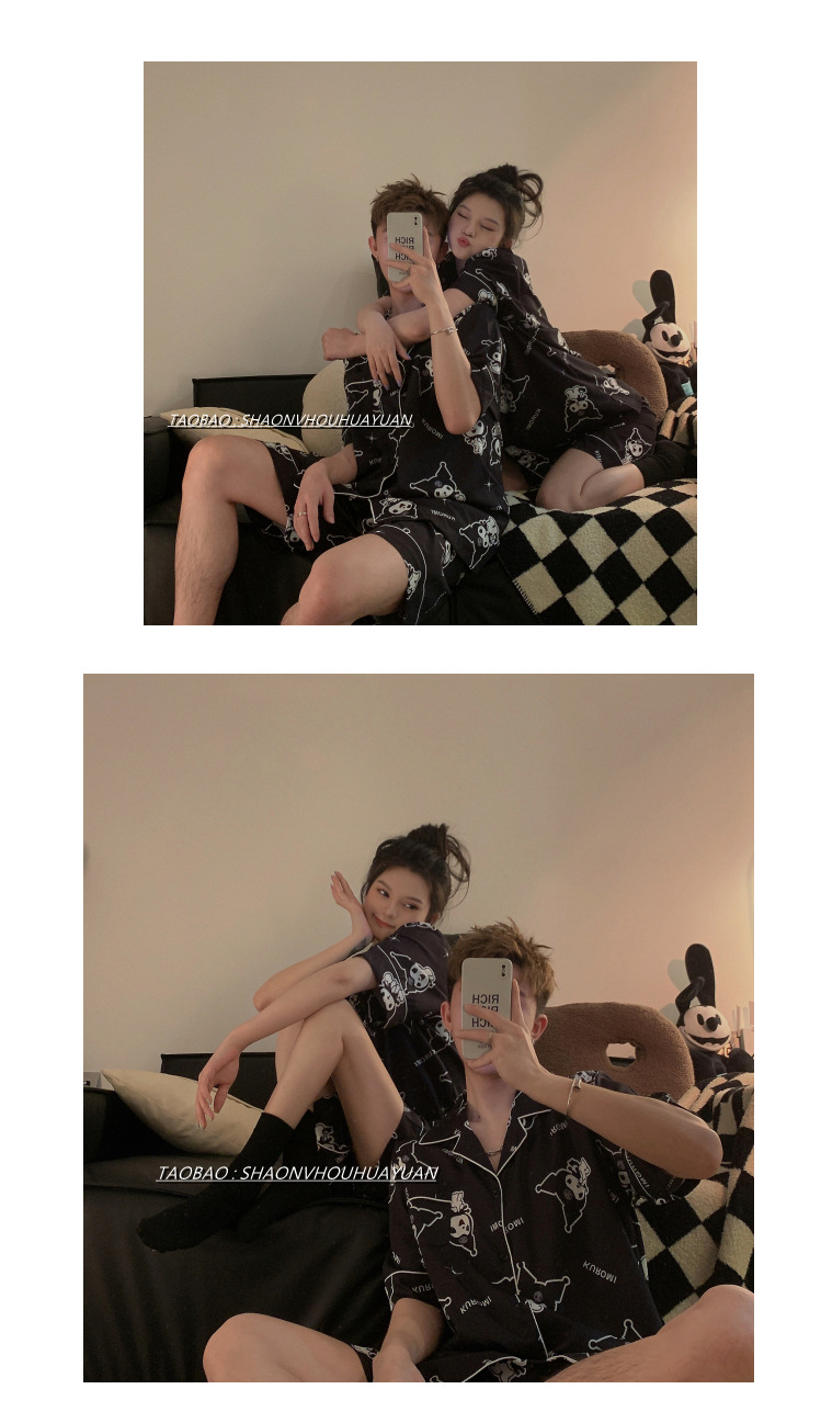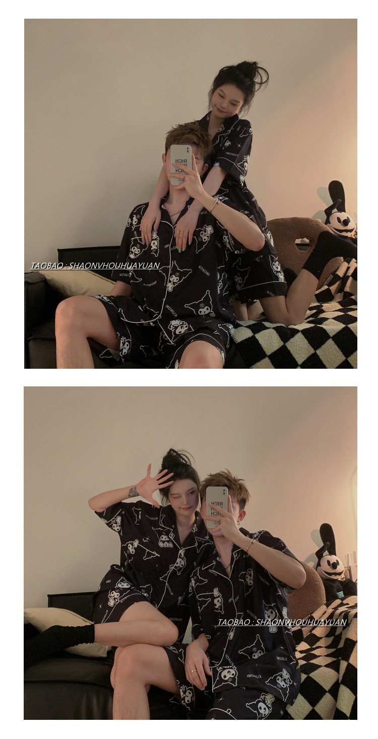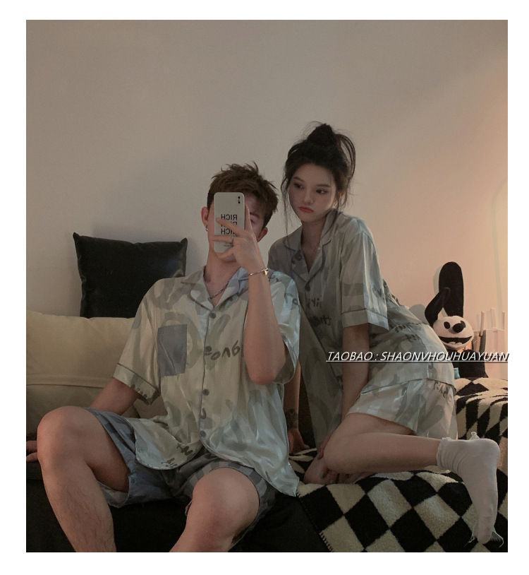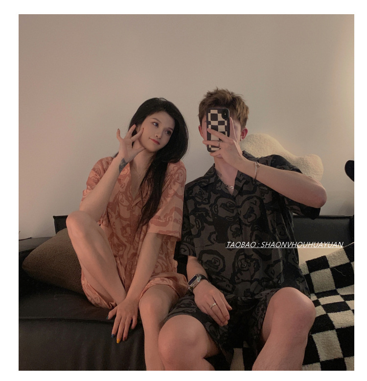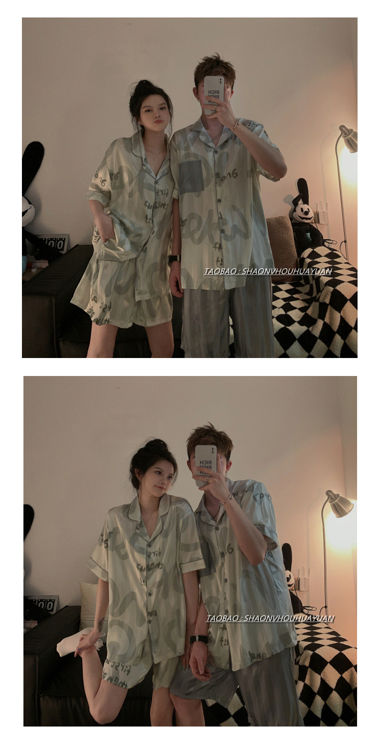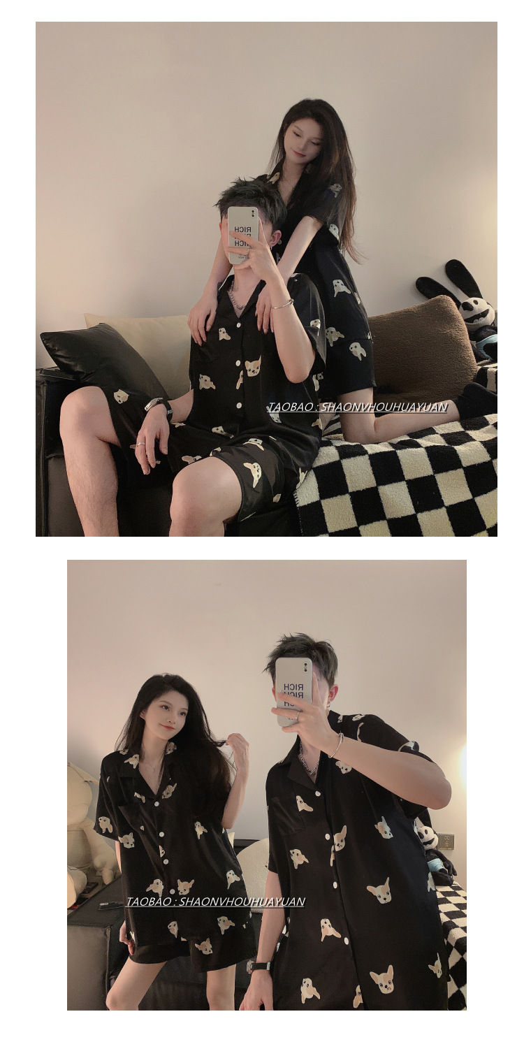Pajamas de pareja de mangas cortas para mujeres de verano seda suave encantadora caricatura para hombres seda delgada alta sensación set de ropa para el hogar