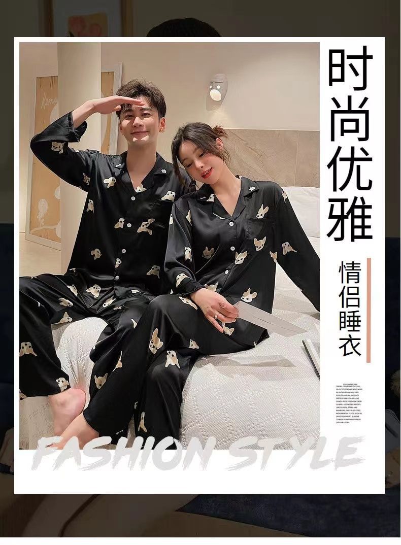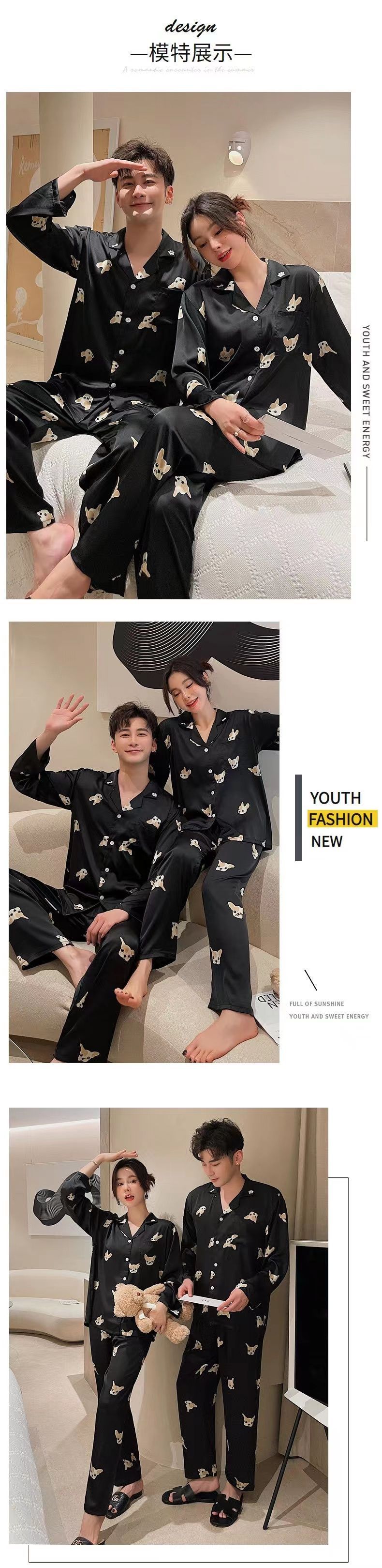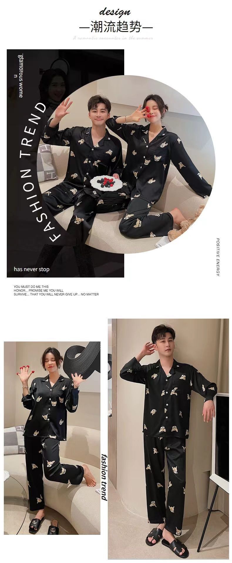 Pajamas de pareja primavera y otoño de mujeres de manga larga seda delgada japonesa inns perrito hombre imitación de seda ropa para el hogar verano