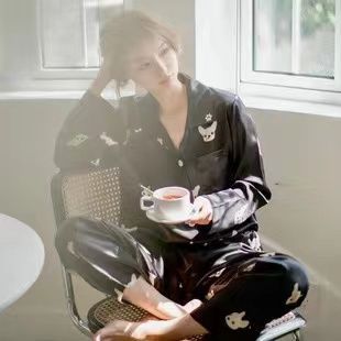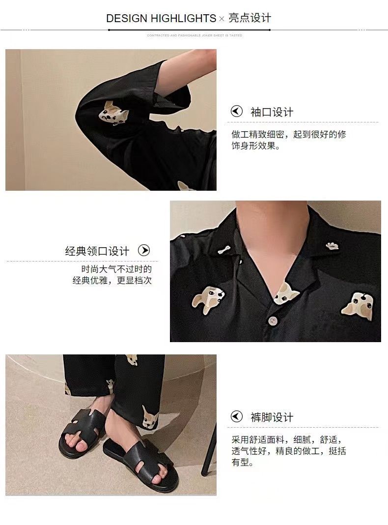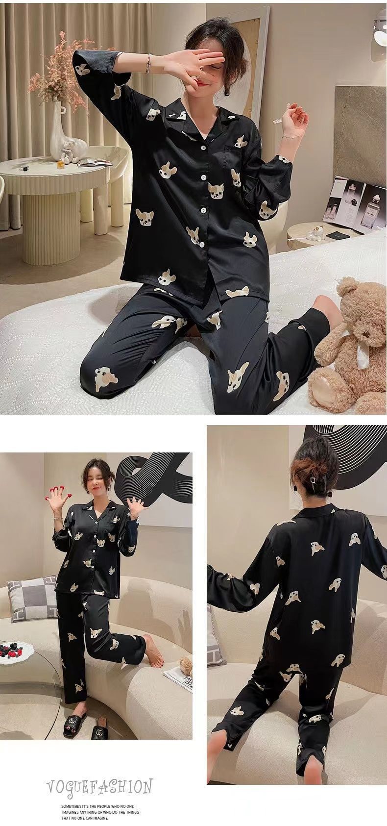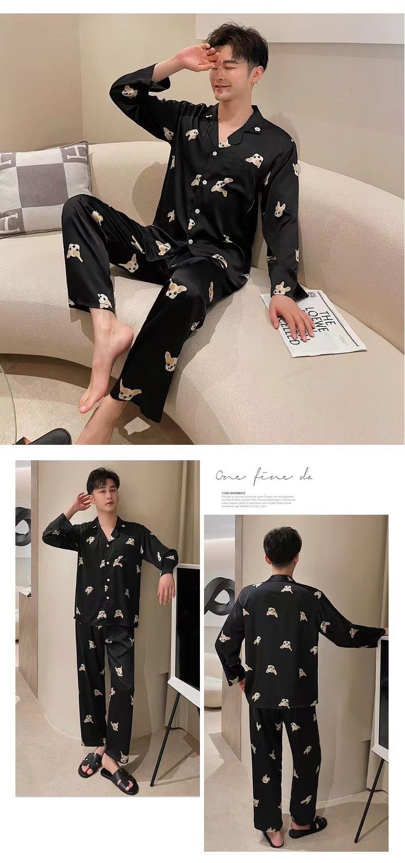 Pajamas de pareja primavera y otoño de mujeres de manga larga seda delgada japonesa inns perrito hombre imitación de seda ropa para el hogar verano