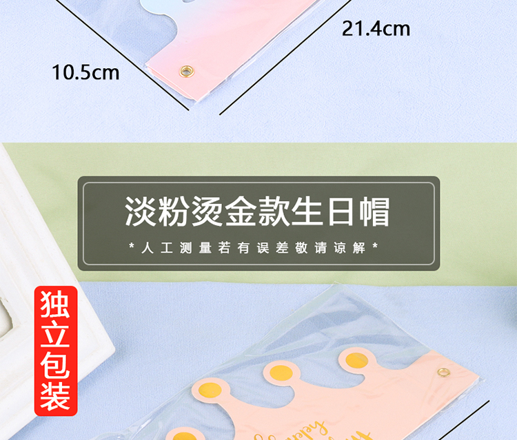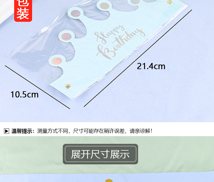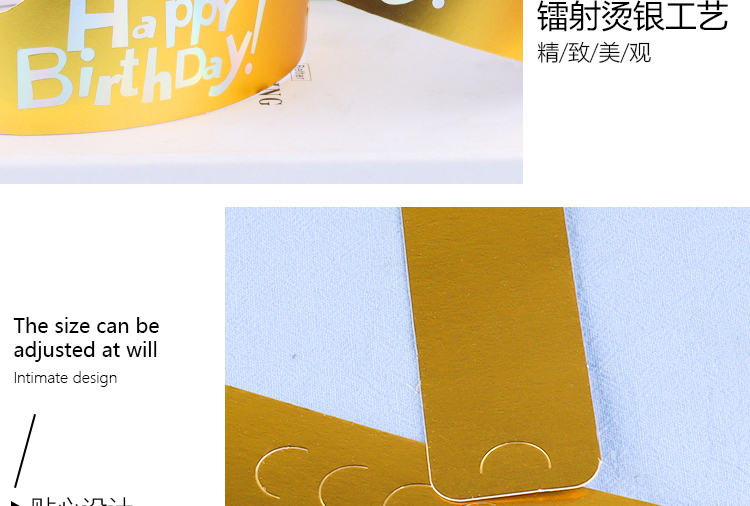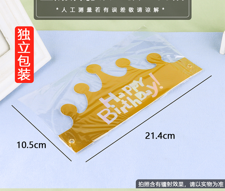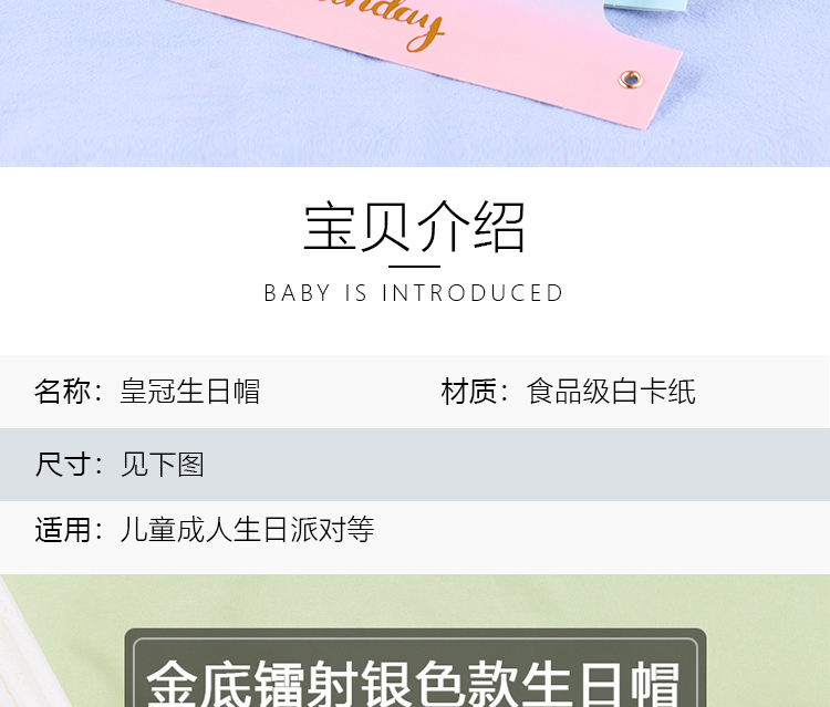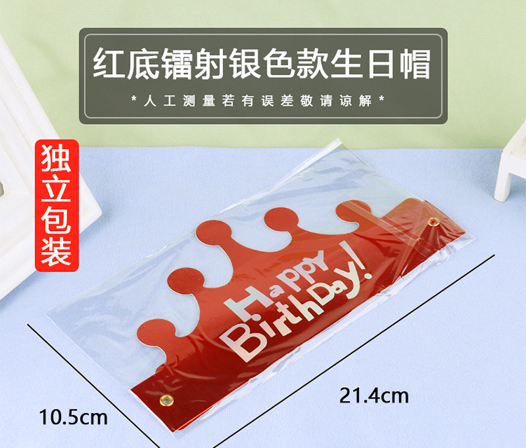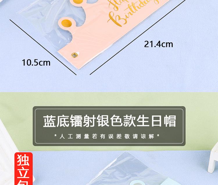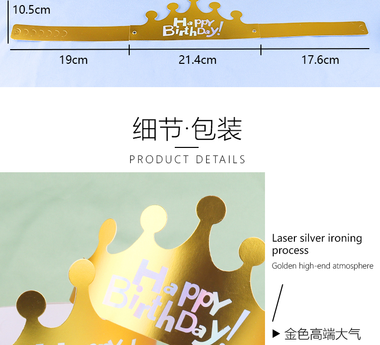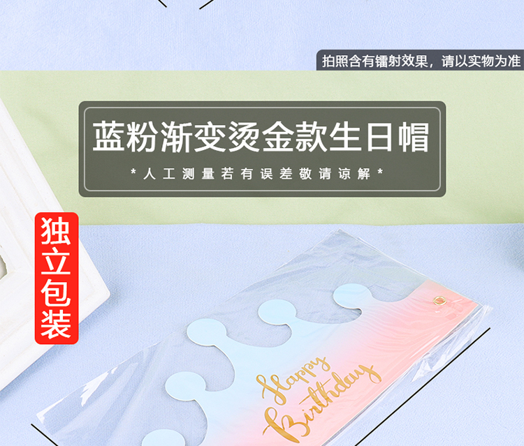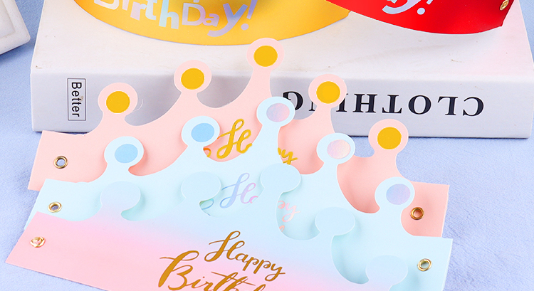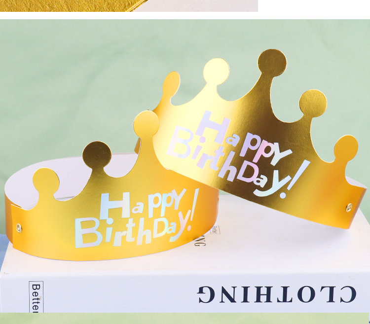 | Color | Sombrero de cumpleaños de plata láser de fondo dorado, sombrero de cumpleaños de plata láser de fondo rojo, sombrero de cumpleaños de estampado azul en polvo, sombrero de cumpleaños de estampado en polvo pálido, sombrero de cumpleaños de plata láser de fondo azul. |