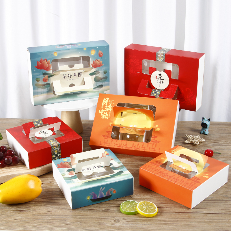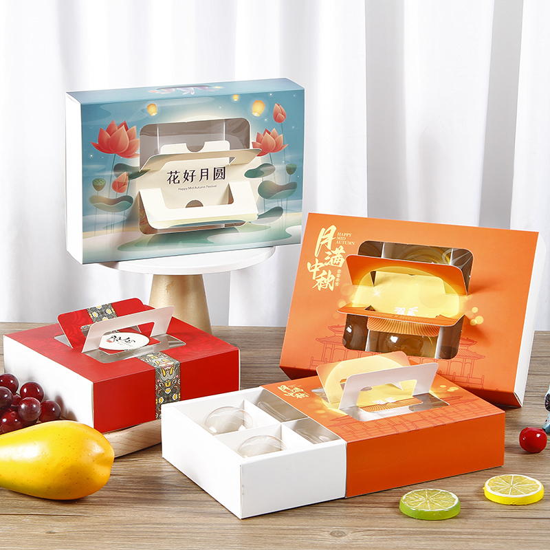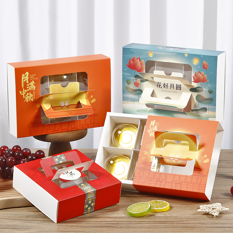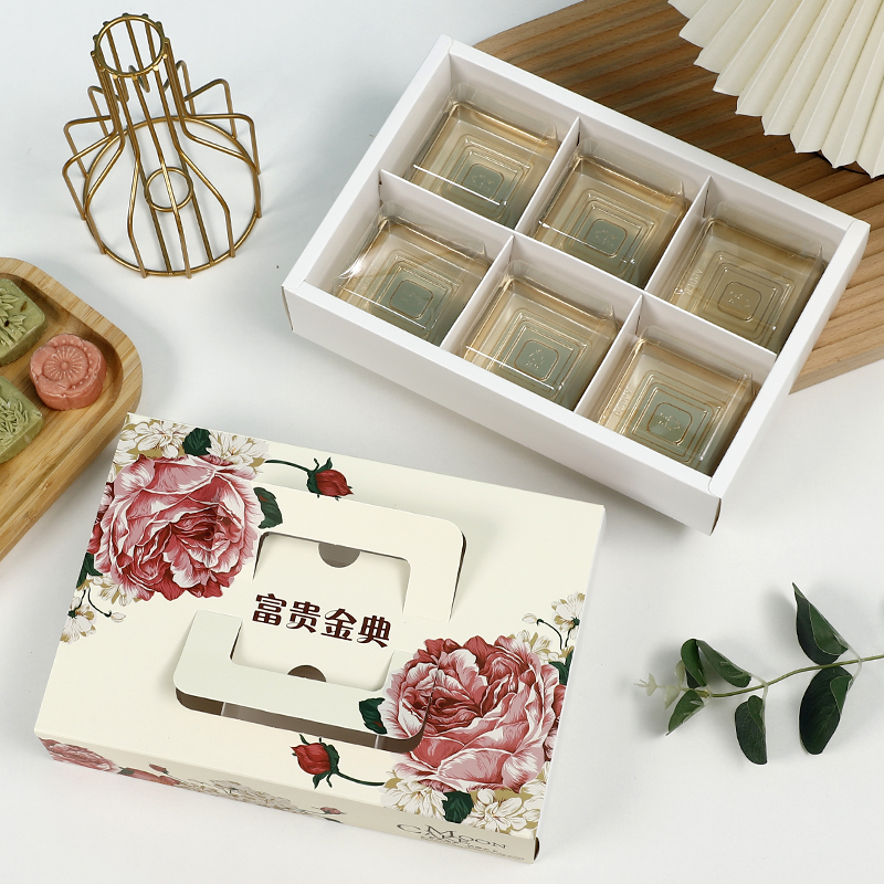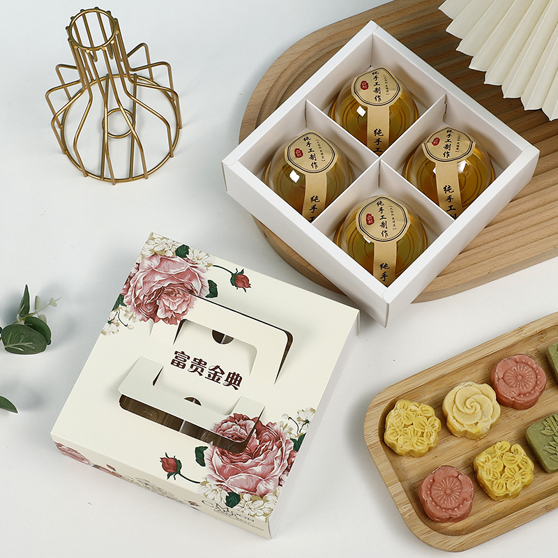Caja de pastel de luna de mediodía de otoño, caja de embalaje portátil de yemas de huevo, caja de regalo de 4 / 6 cápsulas, belleza de nieve, flores de nieve, 80g.