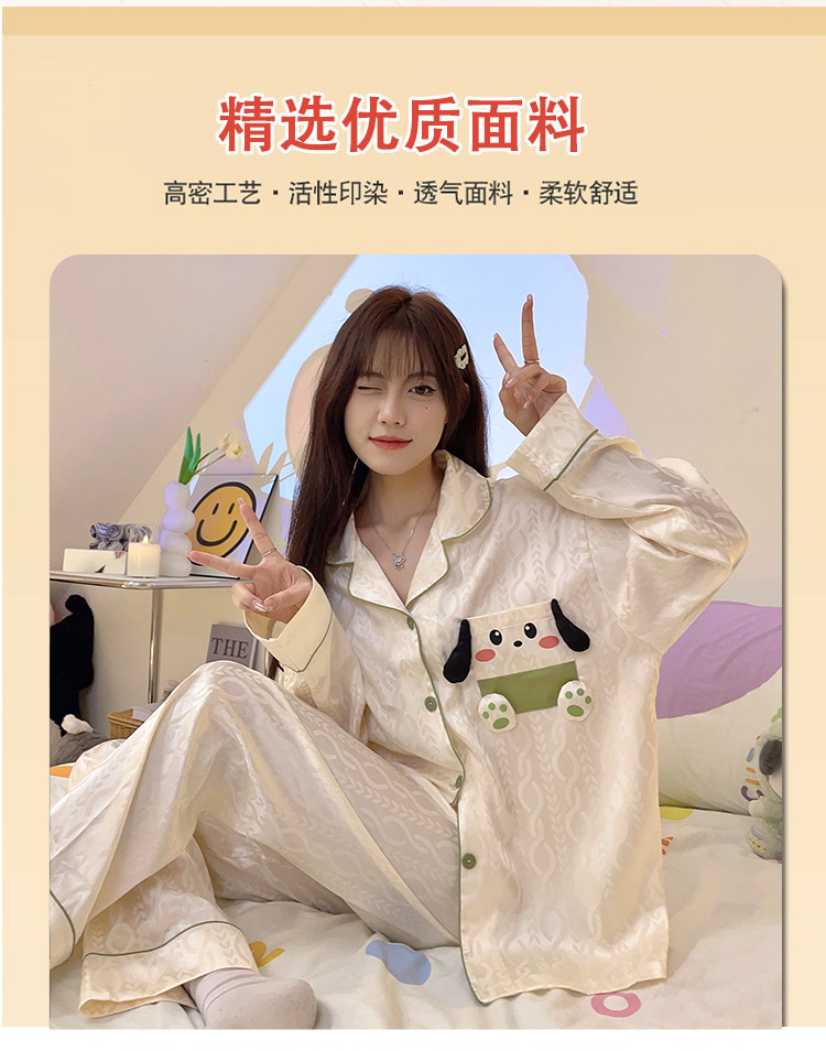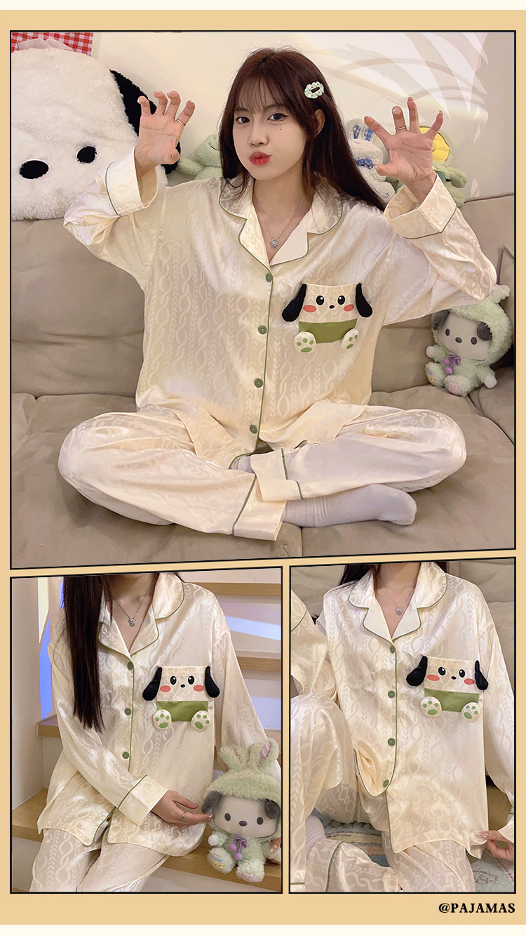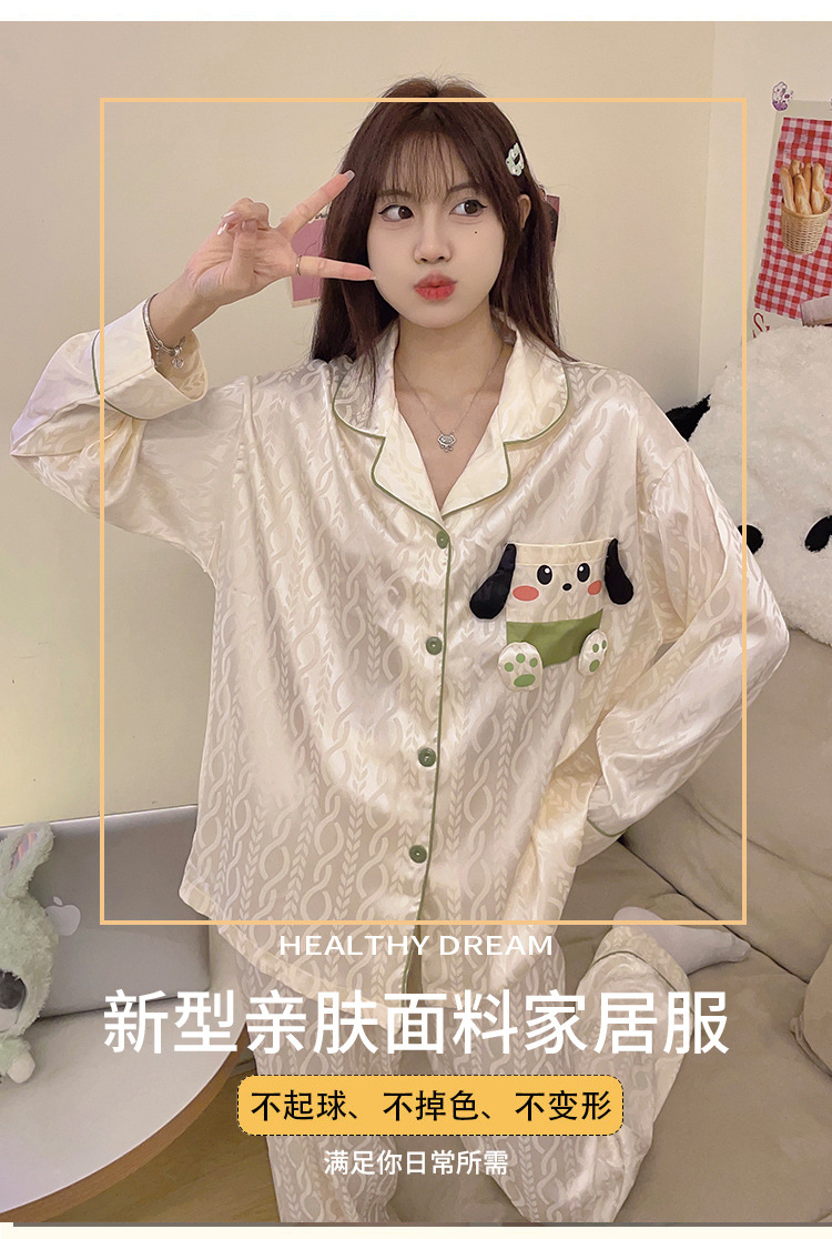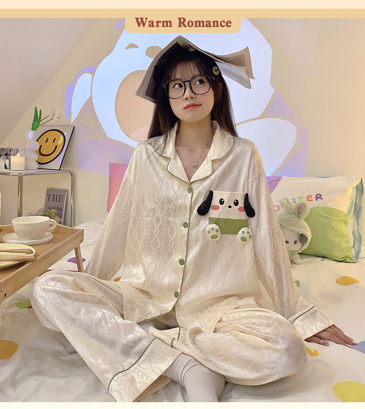 Bolsillo cachorro de dibujos animados pijamas las mujeres solapa seda del hielo cardigan manga larga Otoño e Invierno lindo dulce chica desgaste en casa traje