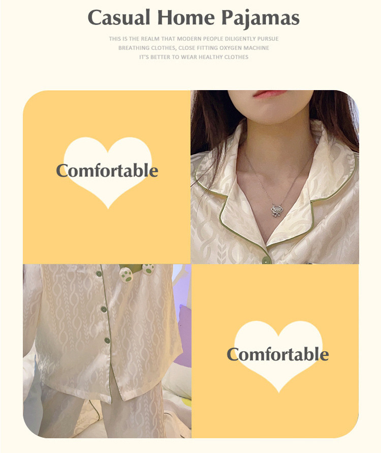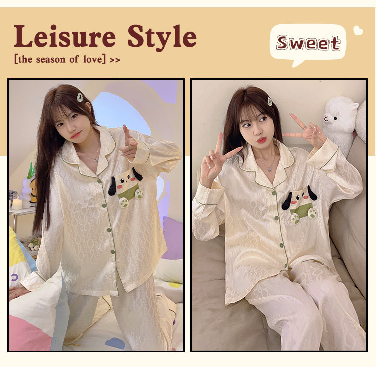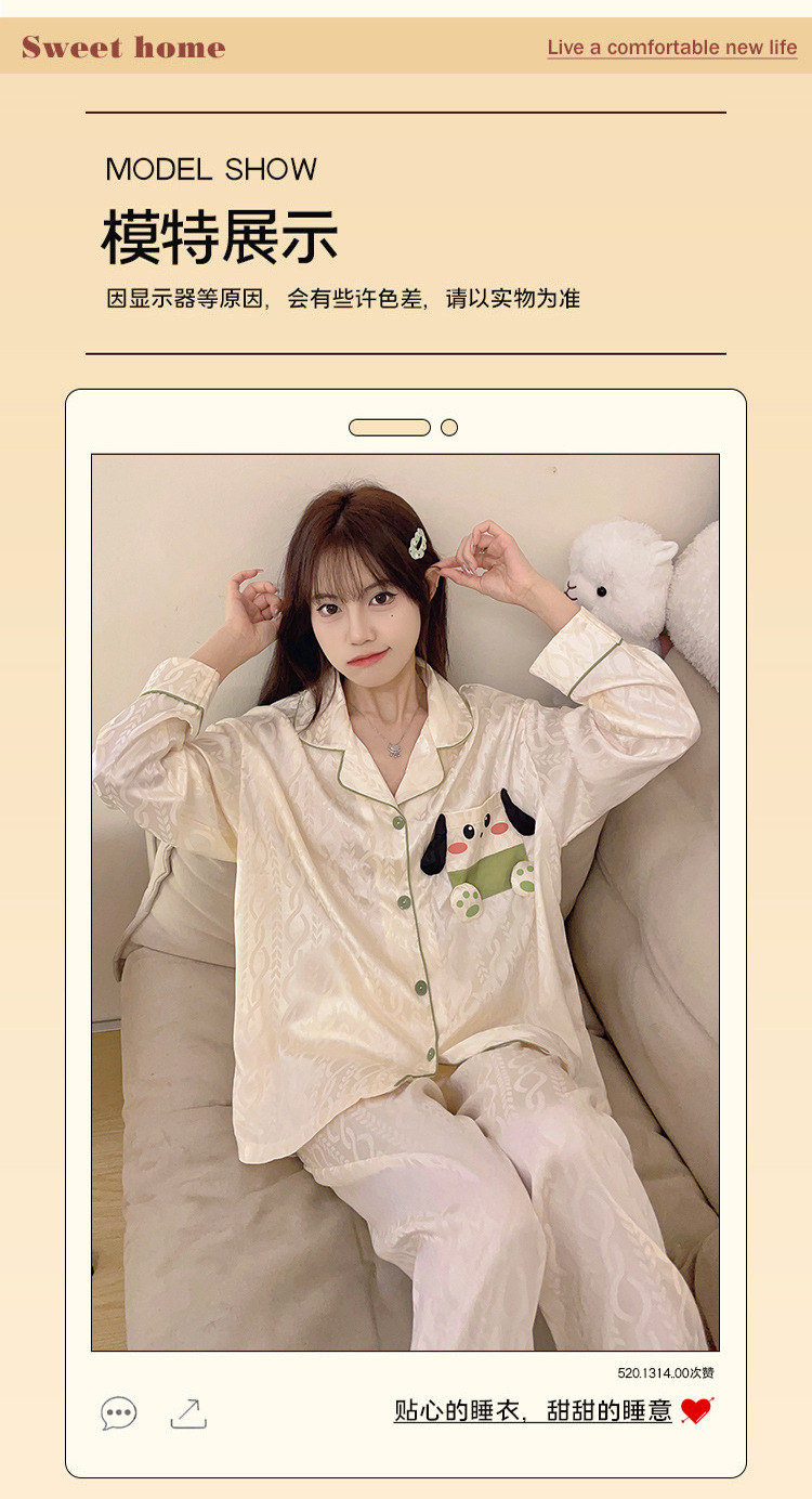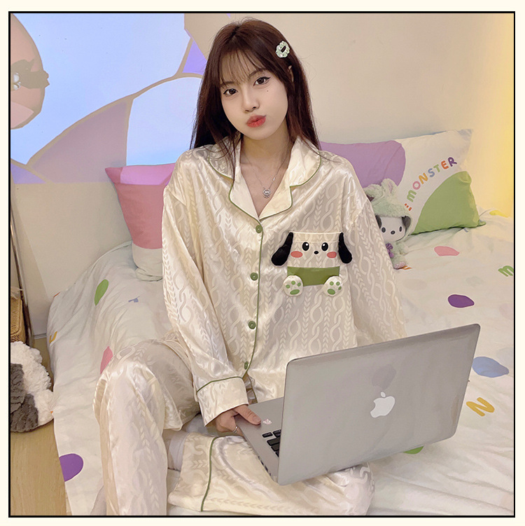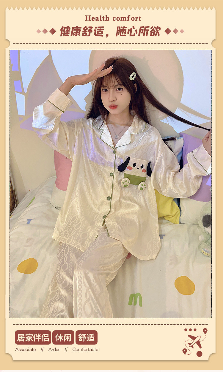 Bolsillo cachorro de dibujos animados pijamas las mujeres solapa seda del hielo cardigan manga larga Otoño e Invierno lindo dulce chica desgaste en casa traje