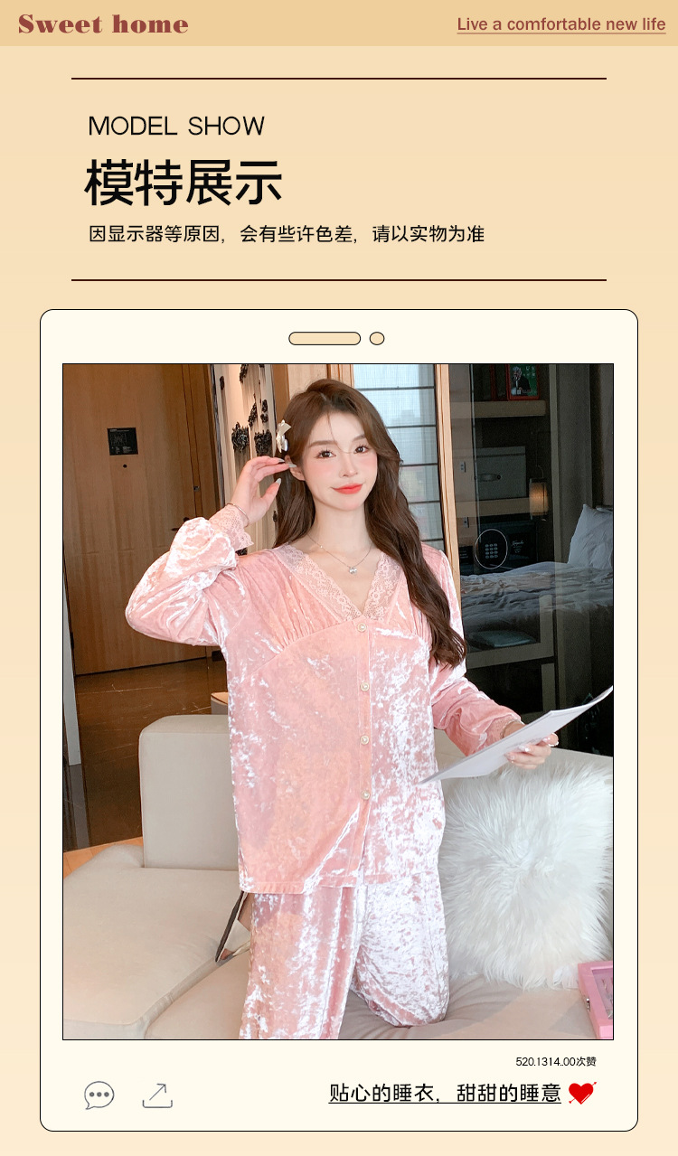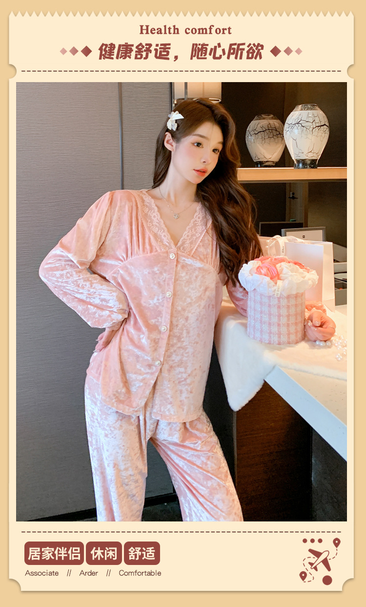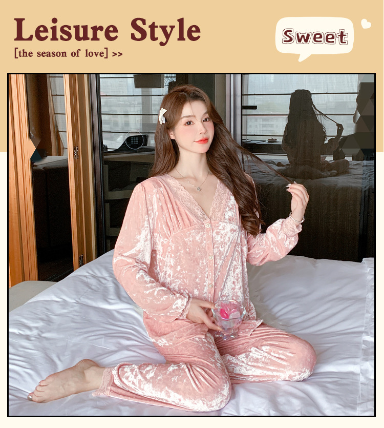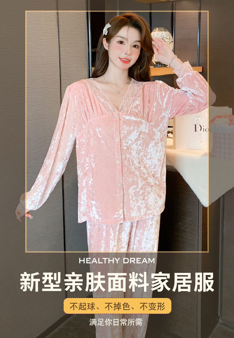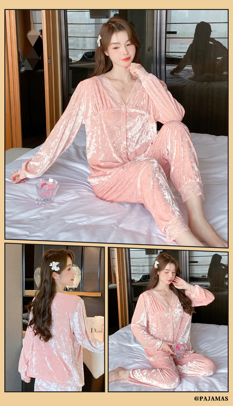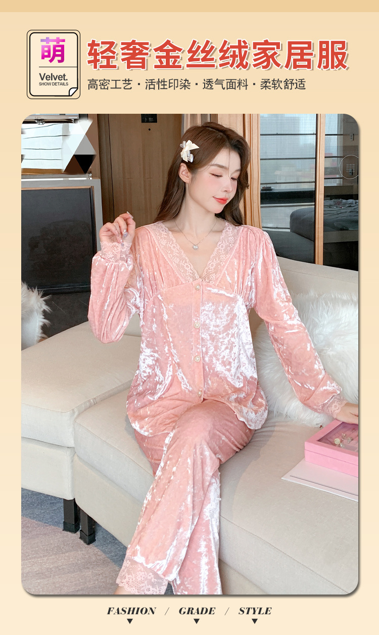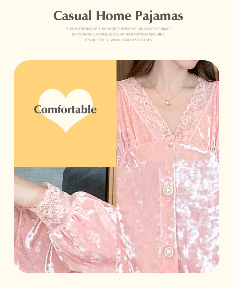Luz de lujo de alta calidad pijamas de las mujeres de terciopelo de oro de encaje cardigan de algodón de manga larga Otoño e Invierno dulce traje de desgaste del hogar