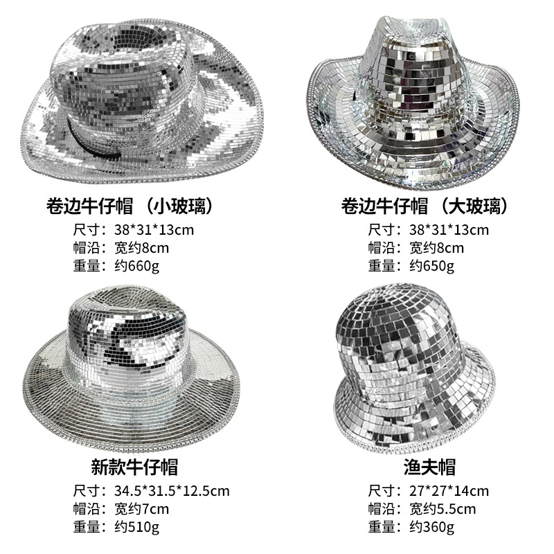 | Colores | Sombrero de vaquero de vidrio grande,Sombrero de vaquero de vidrio pequeño,Sombrero de pescador,Nuevo sombrero de vaquero |