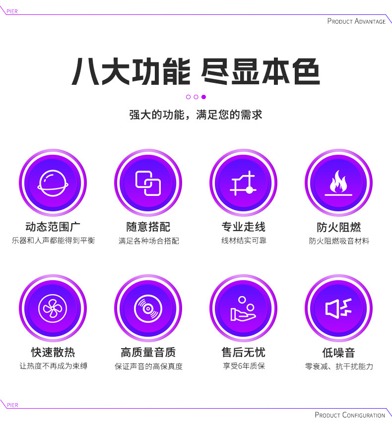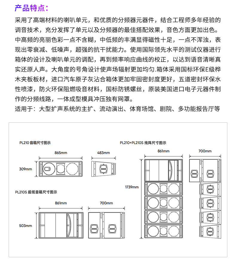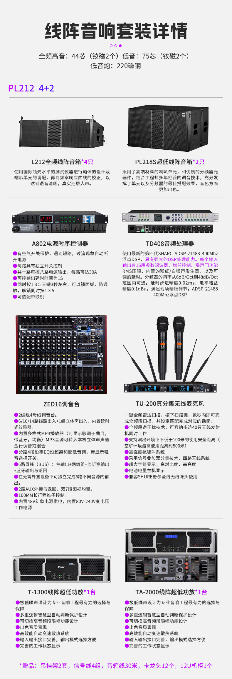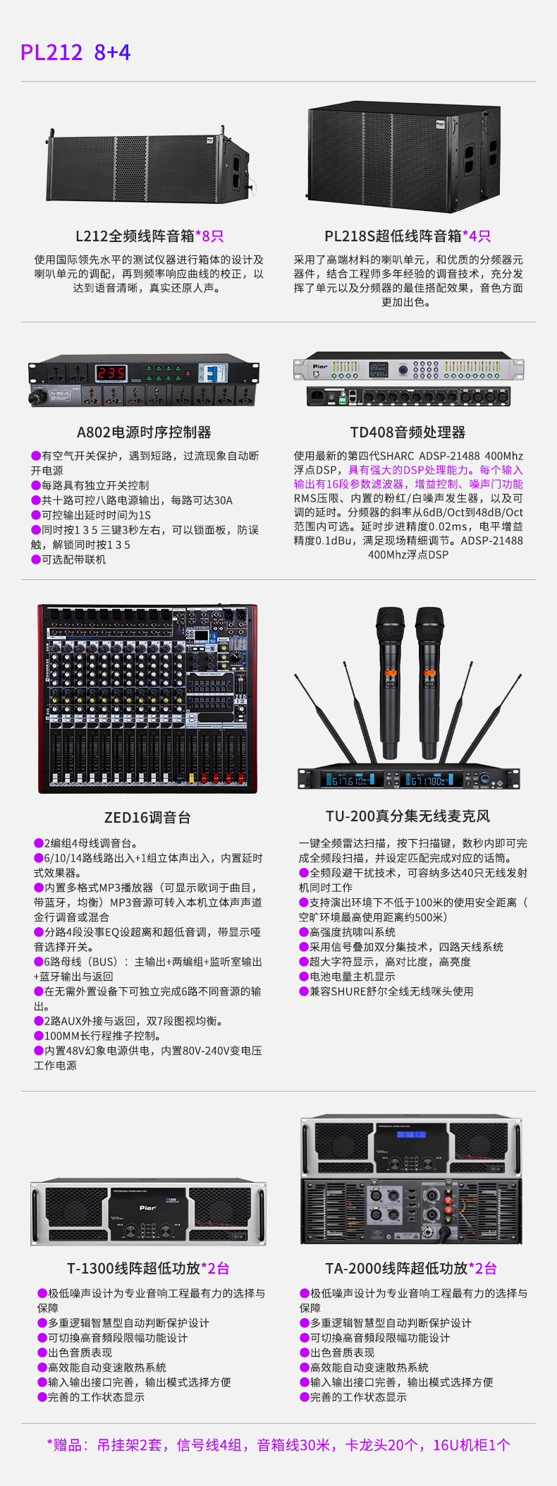 | Color | Se puede personalizar el esquema del sistema de sonido exclusivo de acuerdo con el presupuesto y el tamaño del sitio, altavoces de frecuencia completa de matriz lineal de 8 pulgadas dobles (1 par), subbañistas de matriz lineal de 18 pulgadas individuales (1 par), altavoces de frecuencia completa de matriz lineal de 10 pulgadas dobles (1 par), conjunto completo de 8 pulgadas gráficas [conjunto completo de sonido 8 + 2], conjunto completo de 10 pulgadas gráficas [conjunto completo de sonido 8 + 2] |