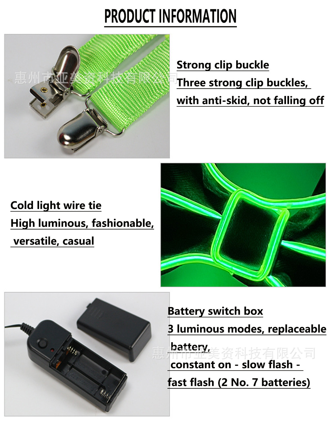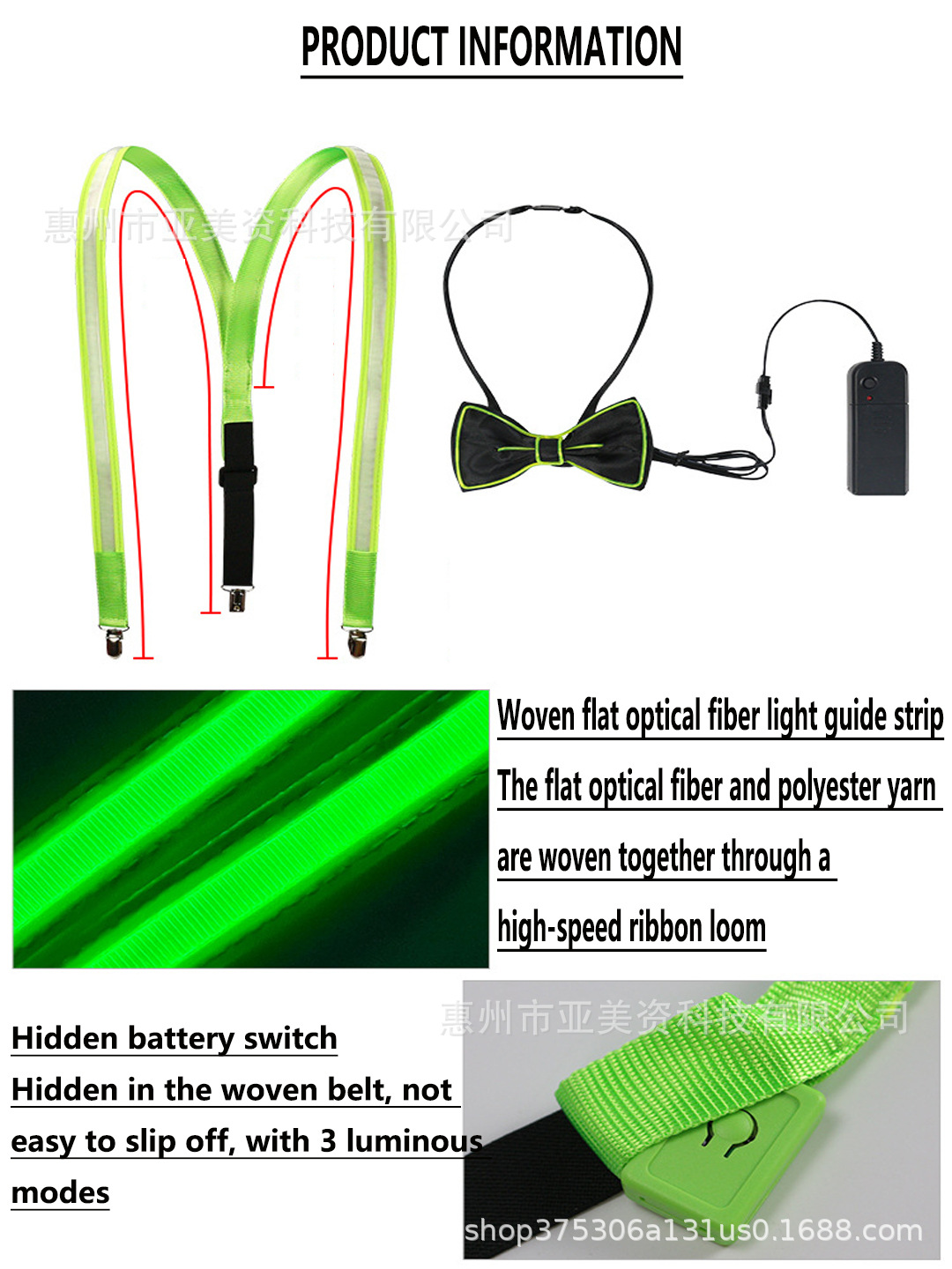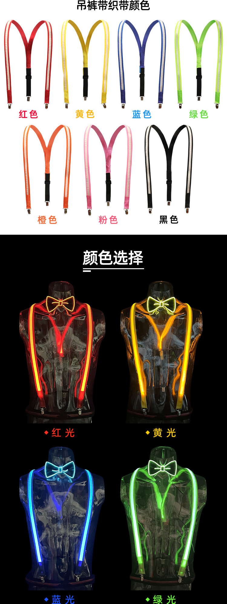 | Color | Guantes luminosos LED (luminosos en color), guantes luminosos LED (luminosos en azul), guantes luminosos LED (luminosos en verde), guantes luminosos LED (luminosos en rojo), guantes luminosos LED (luminosos en amarillo), Guantes luminosos LED (luminosos en blanco), lazo luminoso (luminosos en rojo), lazo luminoso (luminosos en amarillo), lazo luminoso (luminosos en azul), lazo luminoso (luminosos en verde), lazo luminoso (luminosos en naranja), lazo luminoso (luminosos en rosa), lazo luminoso (luminosos en morado), lazo luminoso (luminosos en blanco), tirante negro (luminosos en color), tirante rojo (luminosos en rojo), tirante amarillo (luminosos en amarillo), tirante azul (luminosos En azul), tirante verde (luminosos en verde), tirante naranja (luminosos en rosa), tirante + lazo luminoso en rojo, tirante + lazo (luminosos en amarillo), tirante + lazo (luminosos en azul), lazo (luminosos en verde luminosidad), tirantes + pajaritas (luminosidad naranja), tirantes + pajaritas (luminosidad rosa, Tirantes negros + pajaritos (luminosidad en color + luminosidad en blanco), tirantes + pajaritos + guantes (luminosidad en color + luminosidad en blanco + luminosidad en color), tirantes + pajaritos + guantes (luminosidad en rojo), tirantes + pajaritos + guantes (luminosidad en azul), tirantes + pajaritos + guantes (luminosidad en verde), unidades (sin batería) |