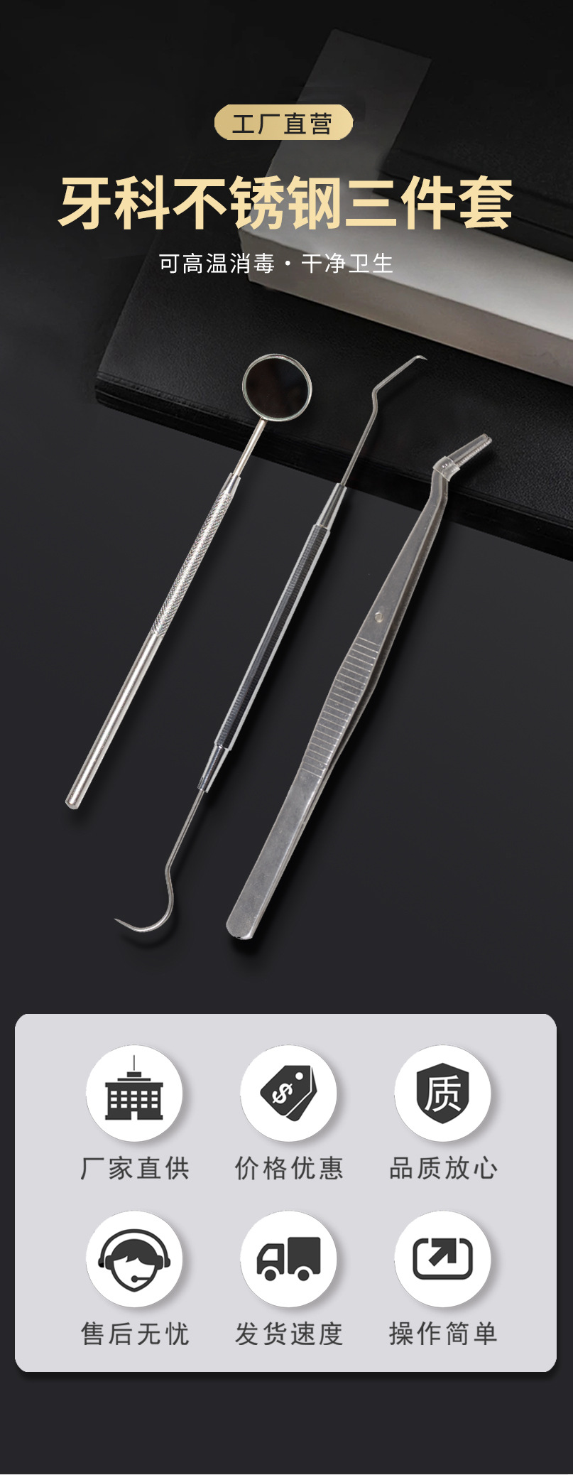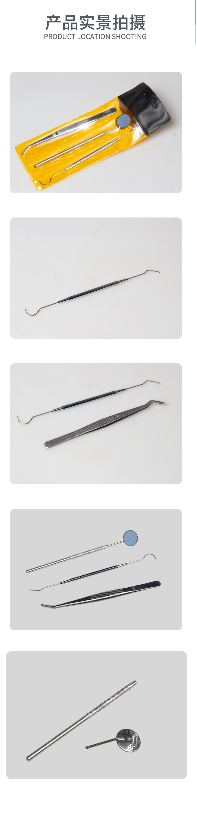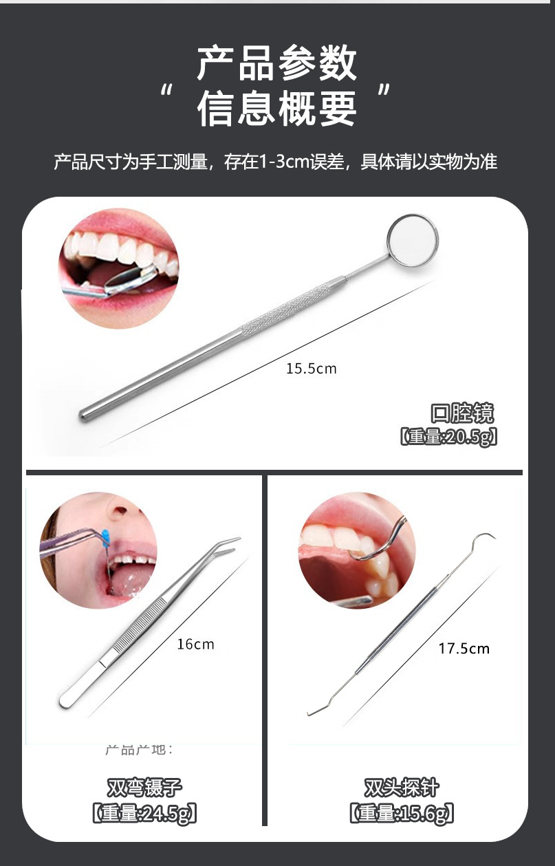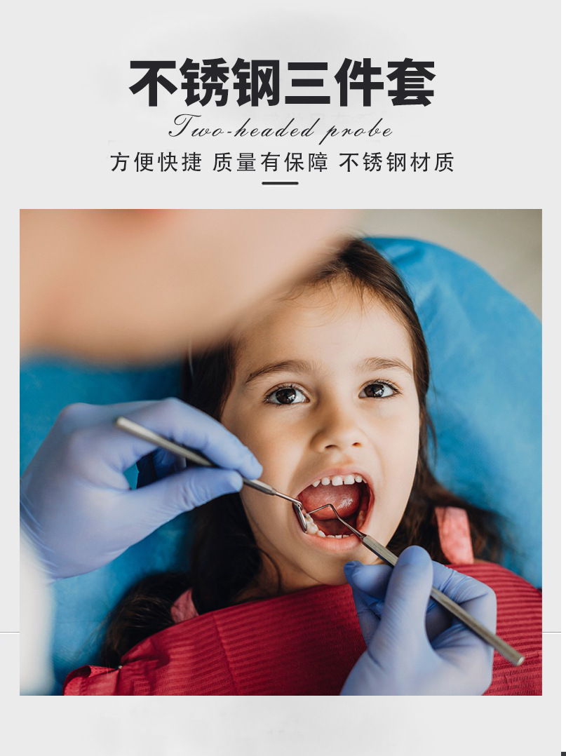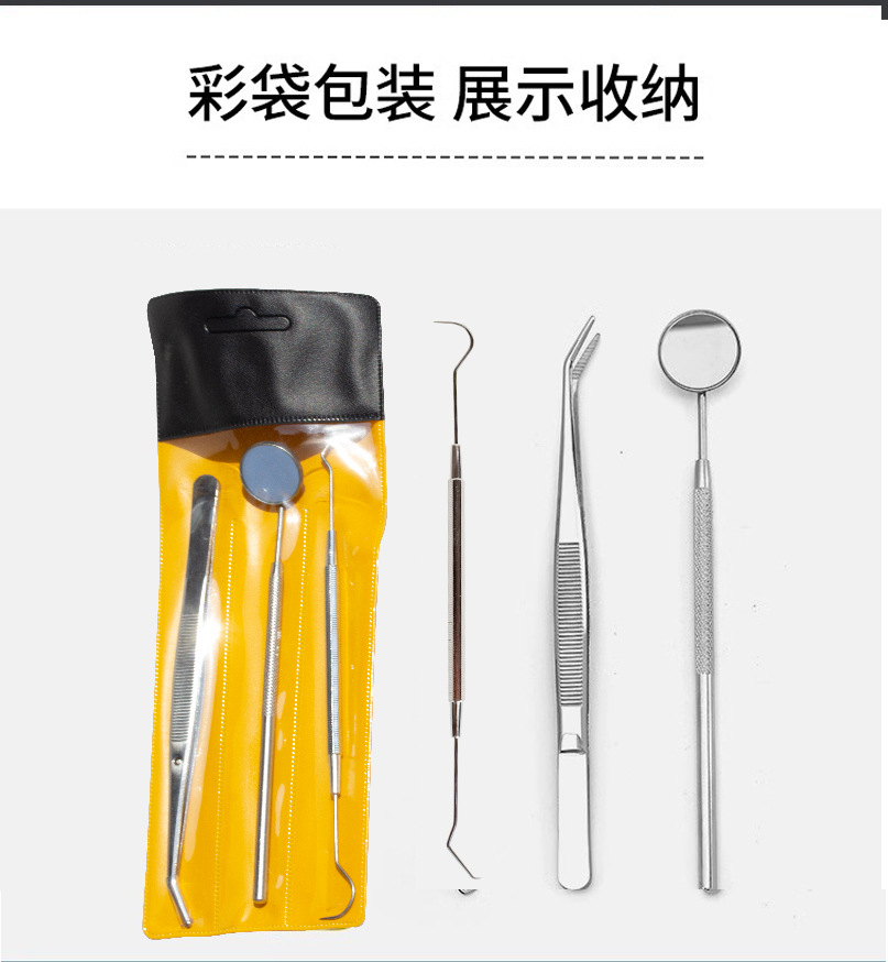 Juego de tres piezas de acero inoxidable para higiene bucal transfronteriza: espejo bucal, sonda y pinzas.