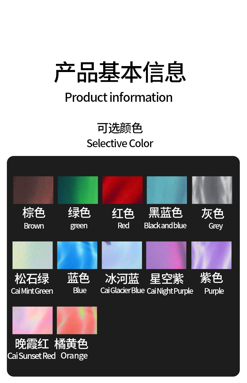 | Color | Marrón - marrón, verde - verde, rojo - rojo, gris - verde, azul - azul, morado - purple, Turquesa deslumbrante - Cai Mint verde, azul glaciar deslumbrante - Cai Glacier azul, cielo estrellado deslumbrante - Cai night green, deslumbrante atardecer rojo - Cai Sunset rojo, Negro - Azul - negro, naranja - Orange yellow |