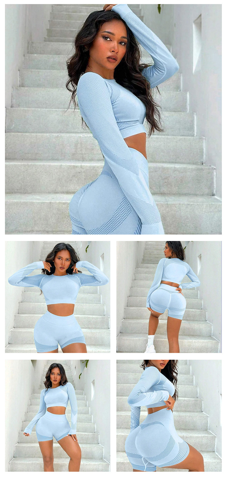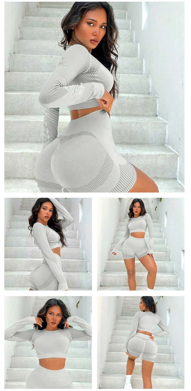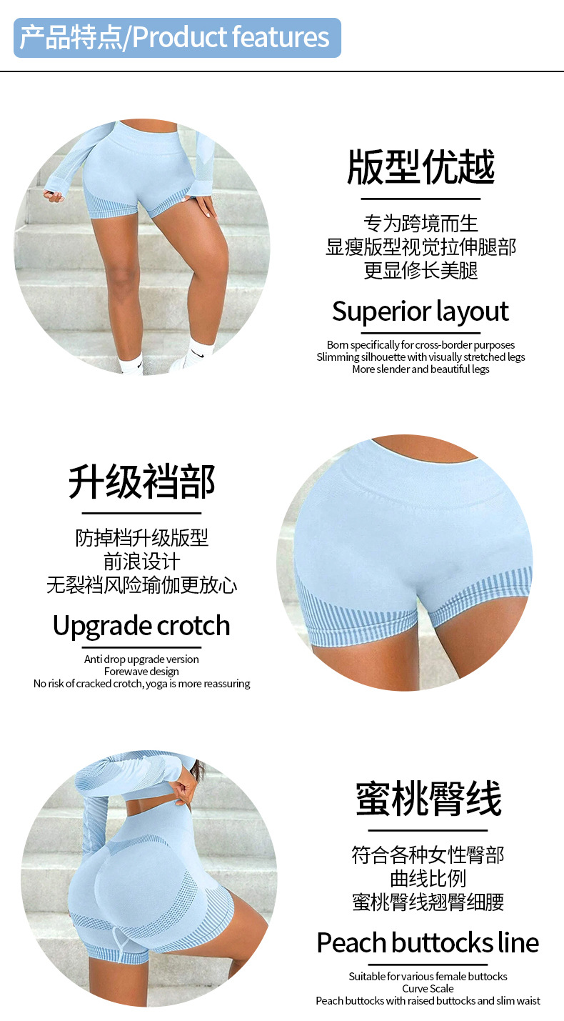 Traje de fitness sin costuras transfronterizo europeo y americano melocotón cadera cintura alta fitness manga larga tres puntos deportes yoga pantalones cortos traje mujeres